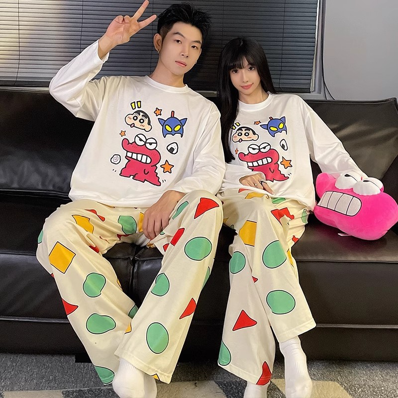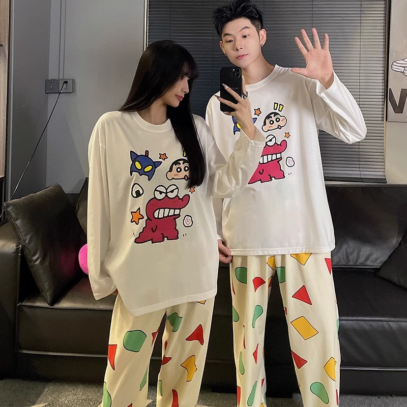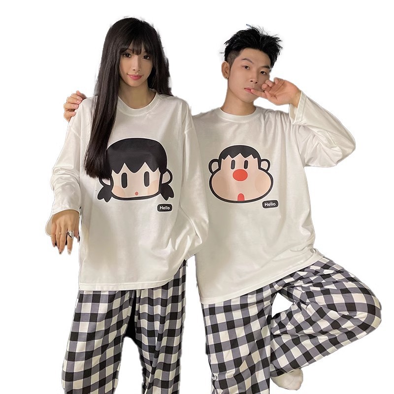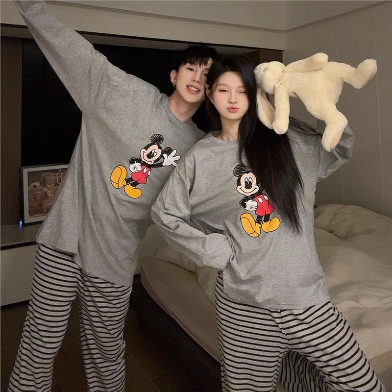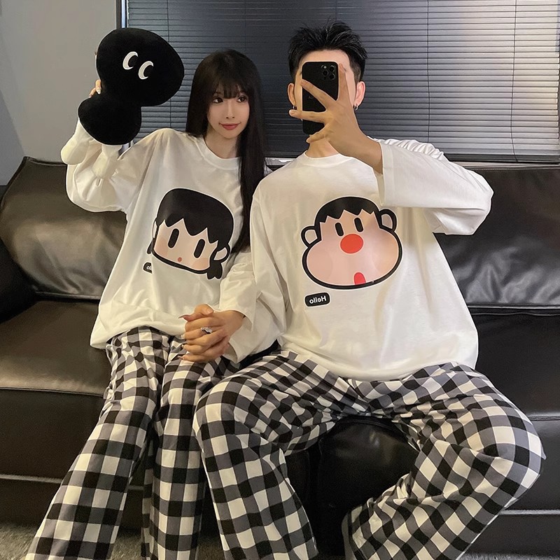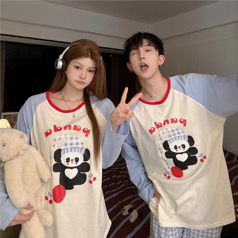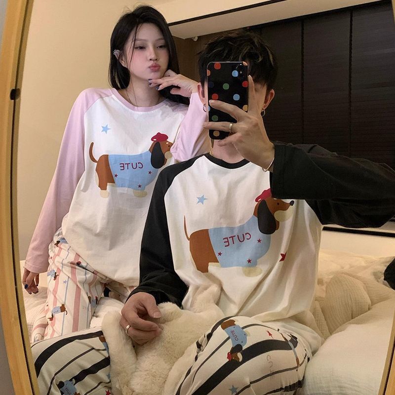 봄과 가을 소년과 소녀를위한 일본식 회색 캐주얼 간단한 편지 커플 잠옷 겉옷을위한 라운드 넥 얇은 홈웨어 세트스토어 가기