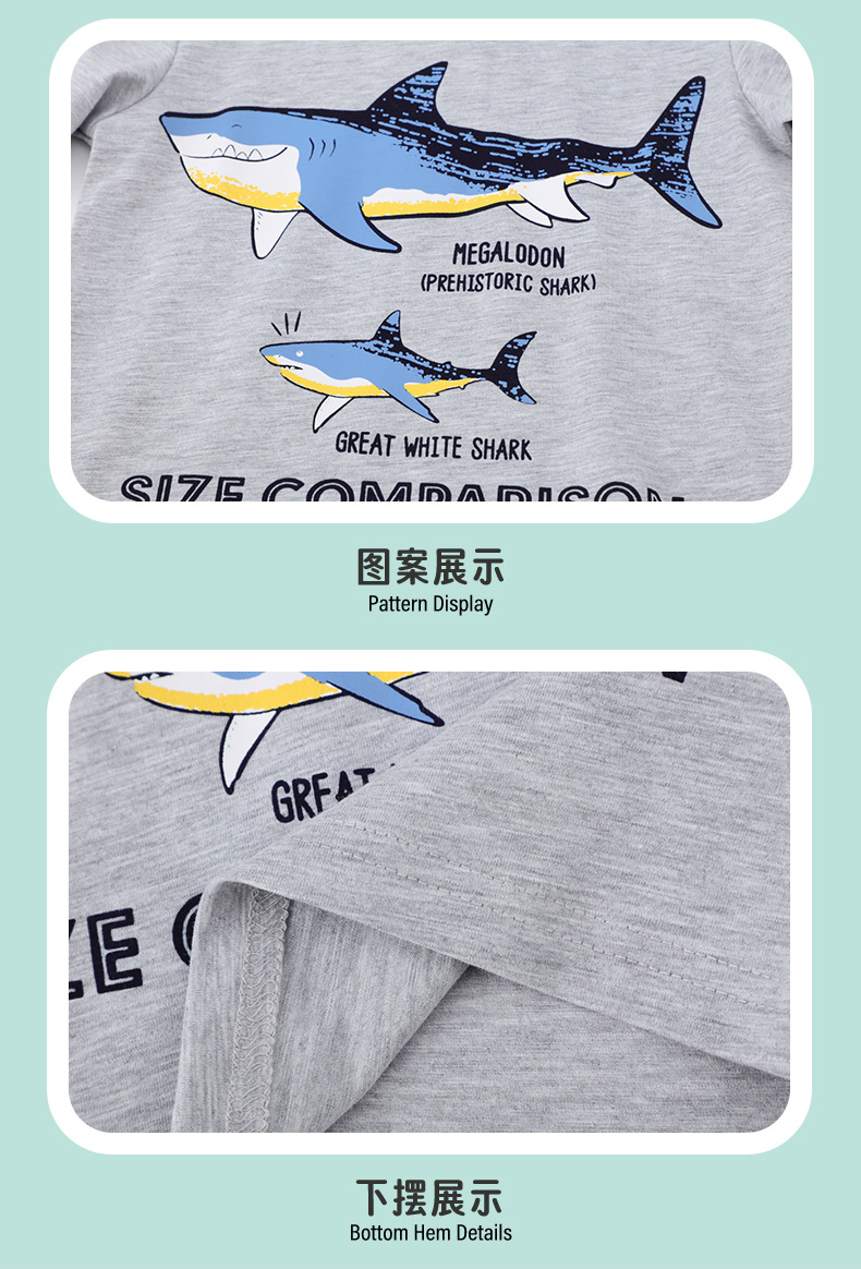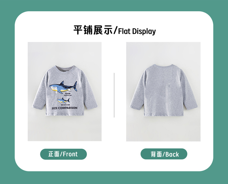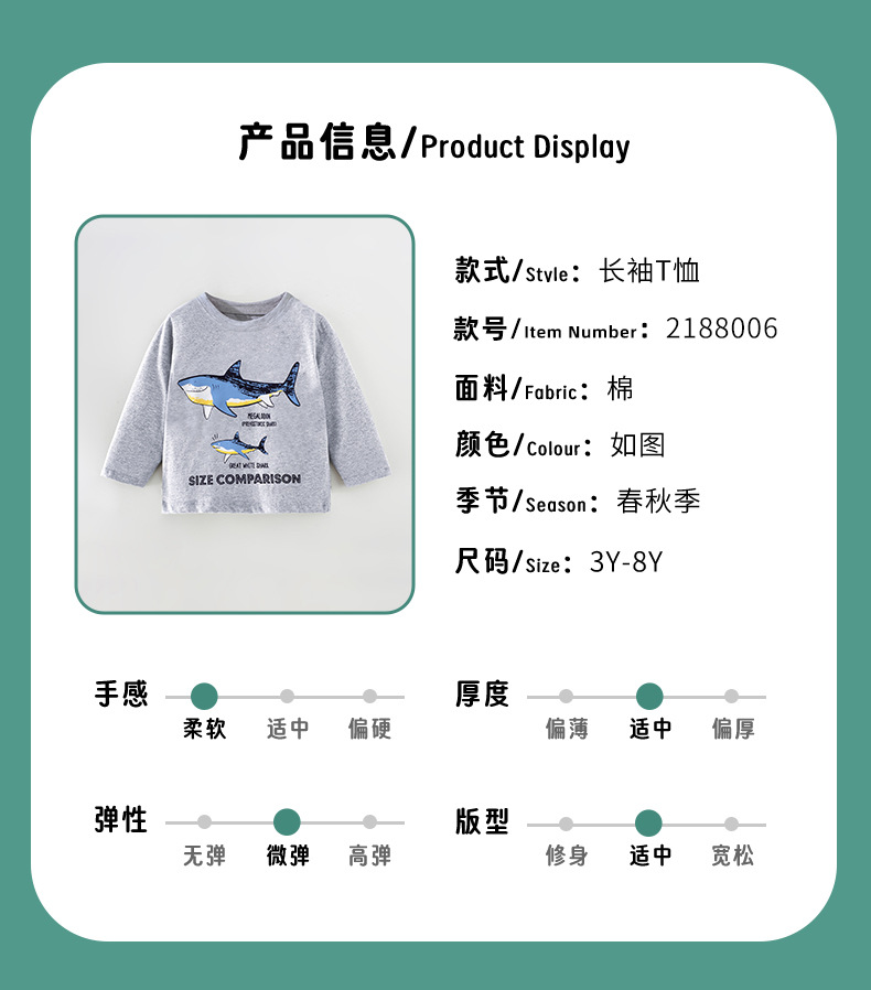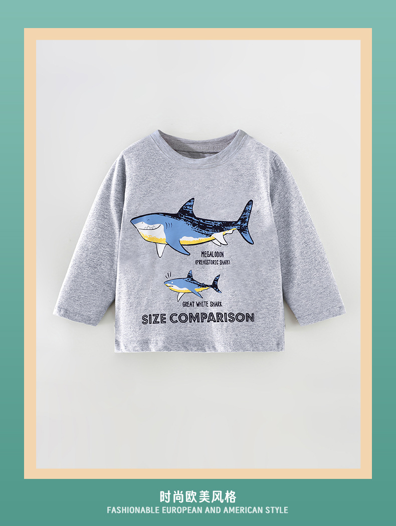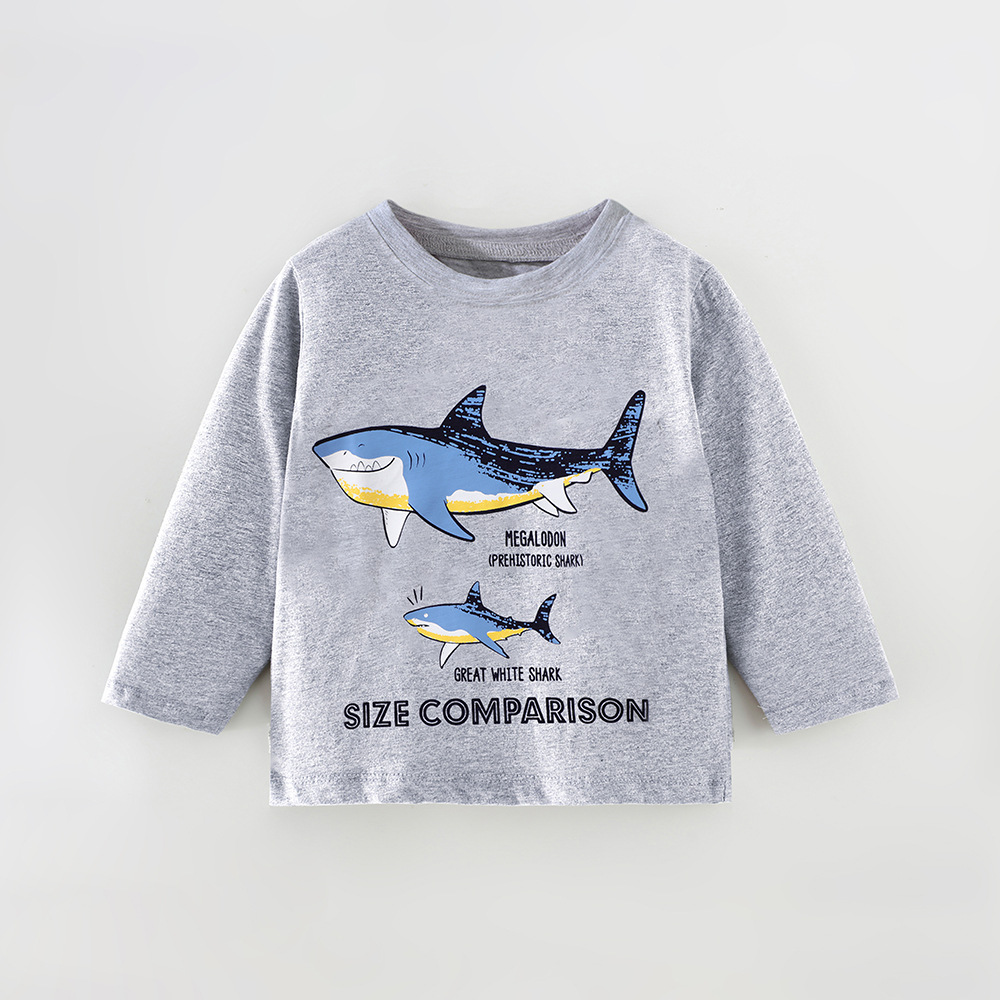 2025 봄과 가을 소년의 새로운 만화 상어 긴팔 티셔츠 어린이 라운드 넥 순수 코튼 탑 유럽과 미국 의류스토어 가기
