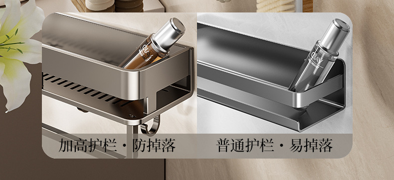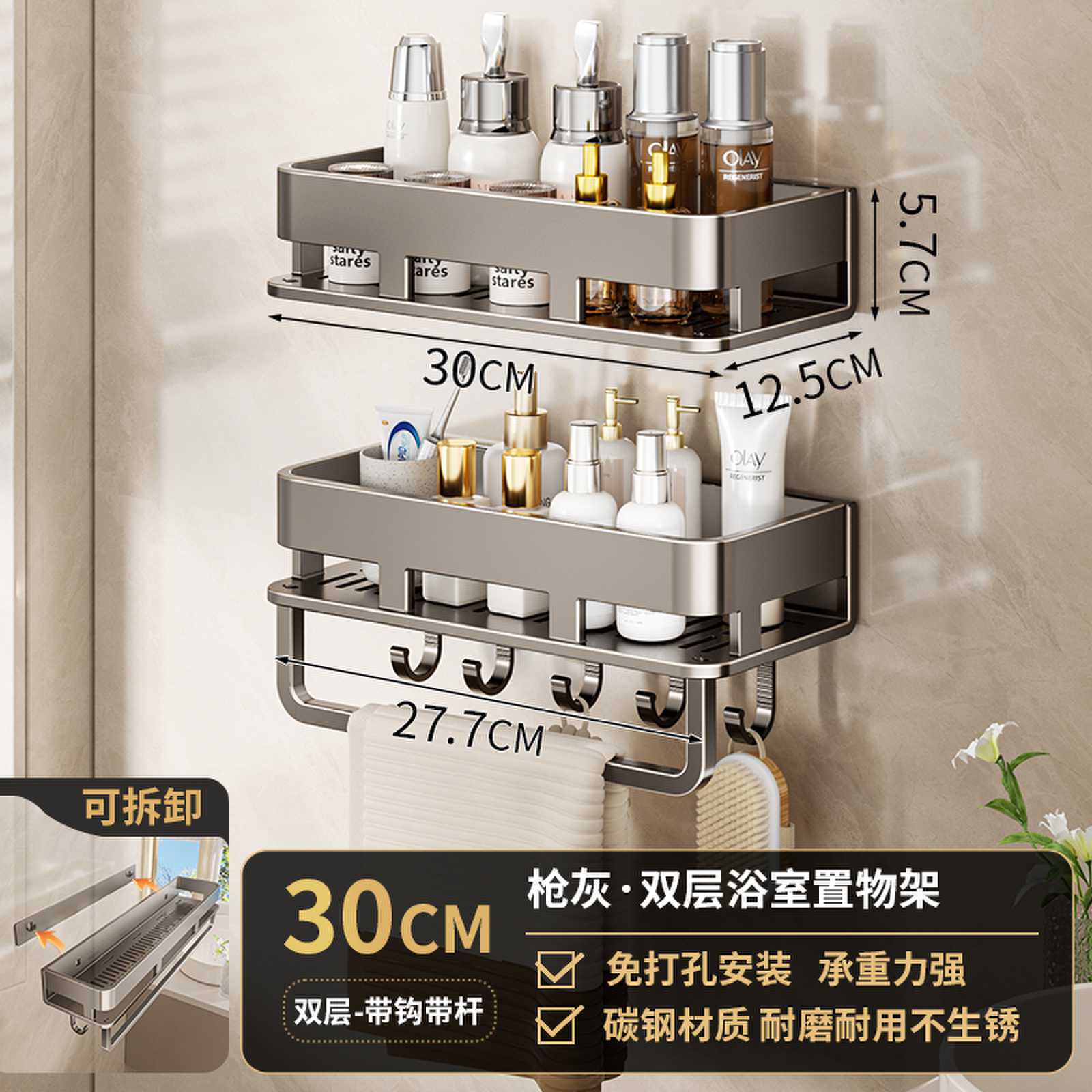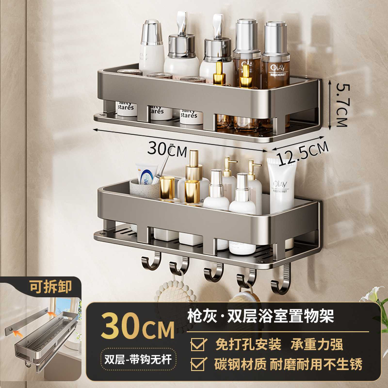 • 30CM 더블 레이어 분리형 건 그레이 욕실 보관함(후크가 있는 1층)
