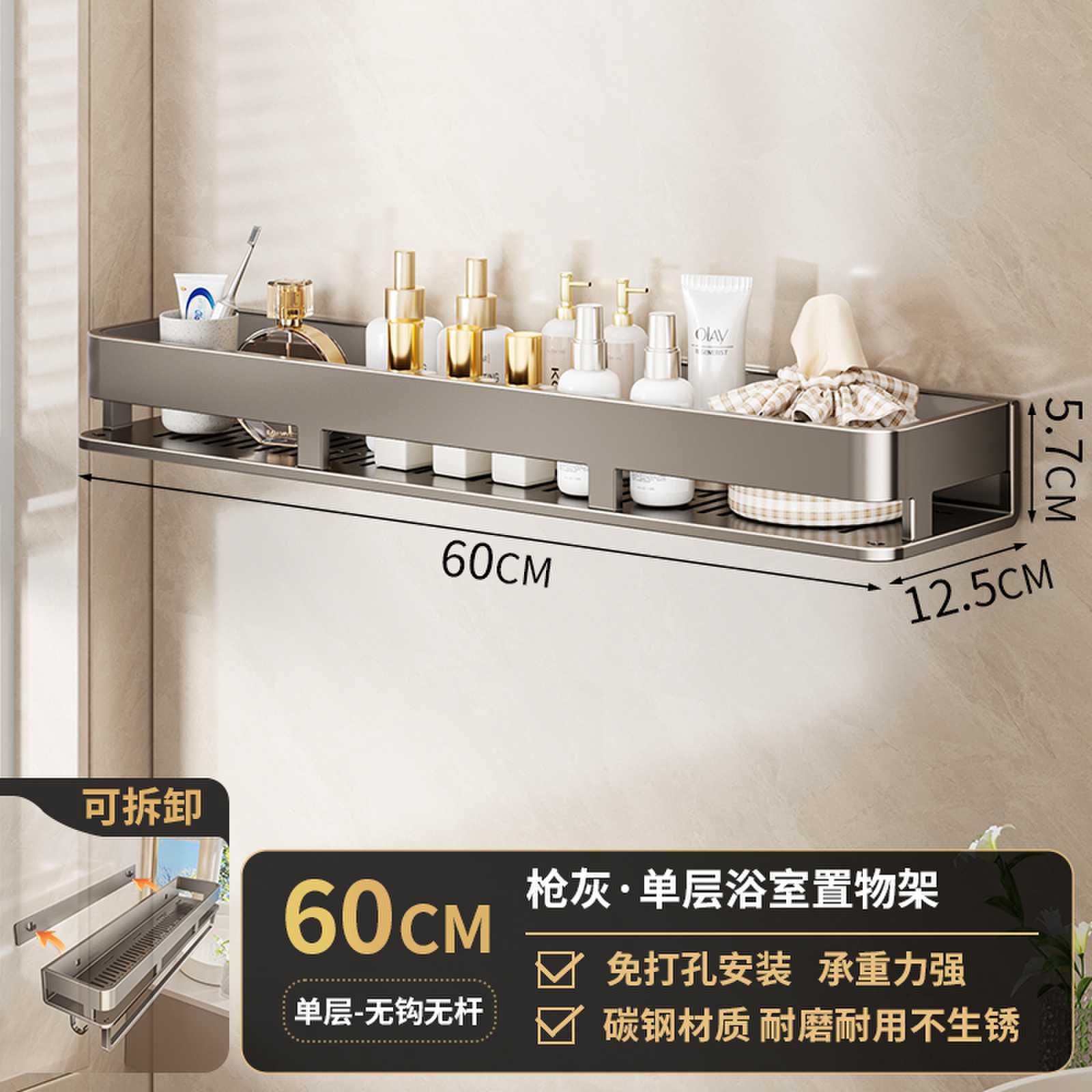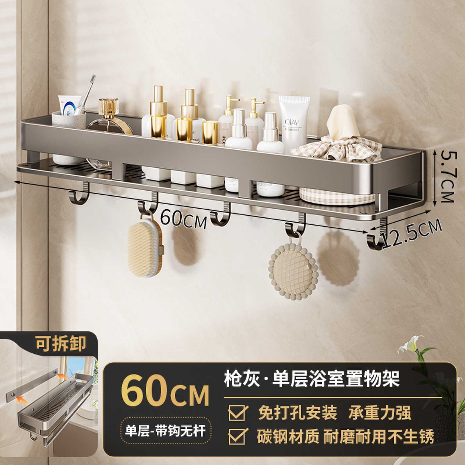 • 후크 막대가 있는 60CM 단일 레이어 분리형 건 그레이 욕실 보관함