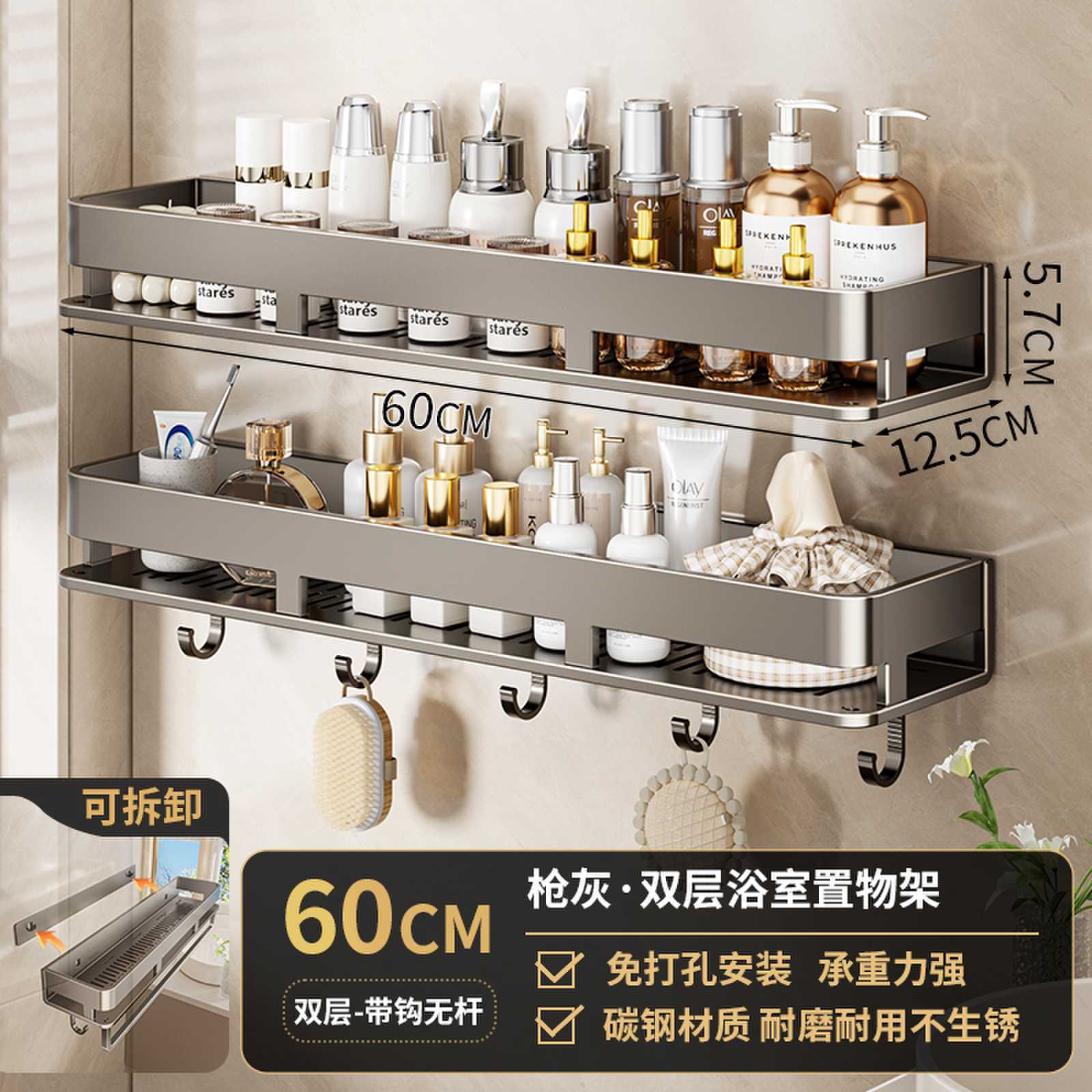 • 60CM 더블 레이어 분리형 건 그레이 욕실 보관함(후크가 있는 1층)