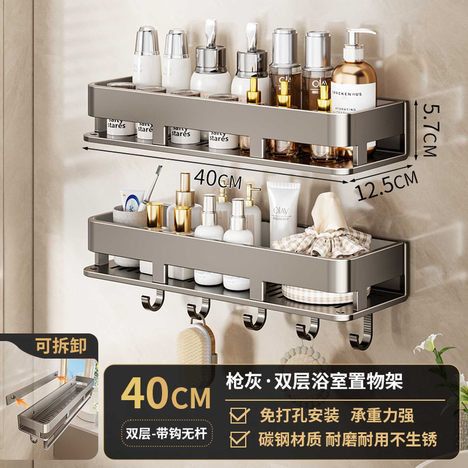 • 40CM 더블 레이어 분리형 건 그레이 욕실 보관함(후크가 있는 1층)