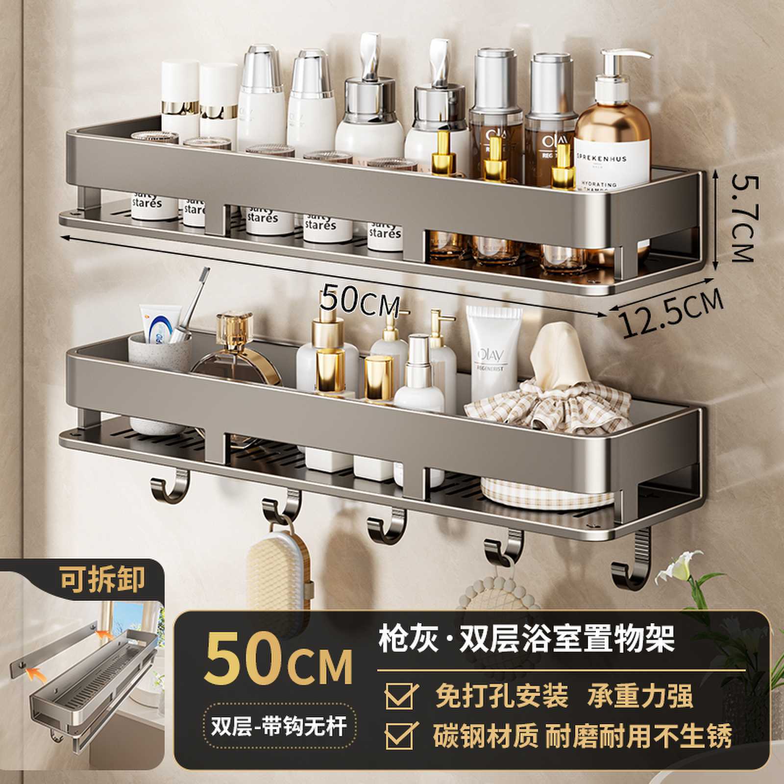 • 50CM 더블 레이어 분리형 건 그레이 욕실 보관함(후크가 있는 1개 레이어)