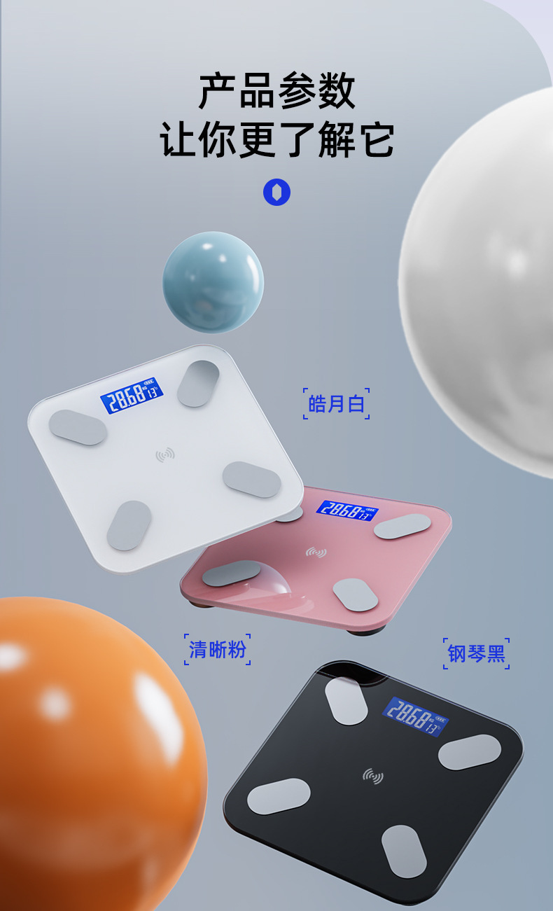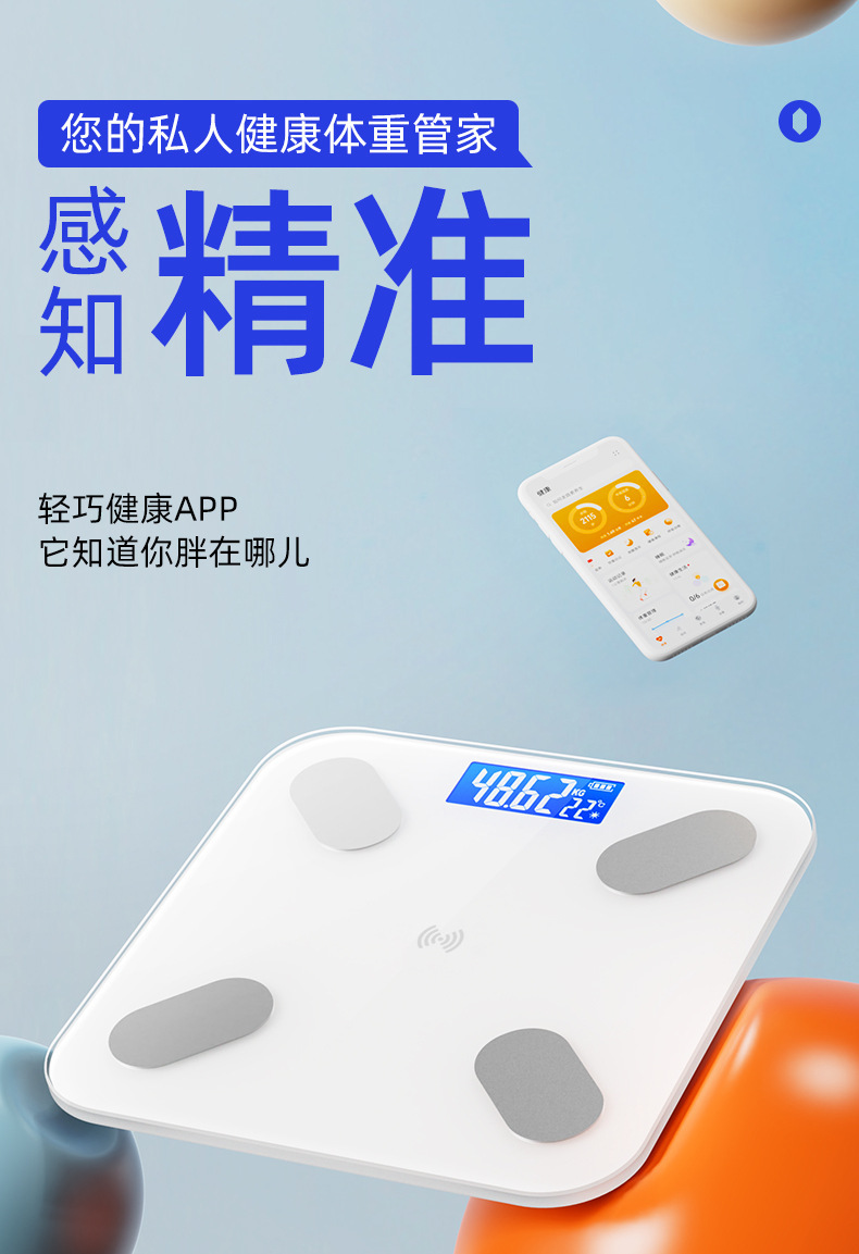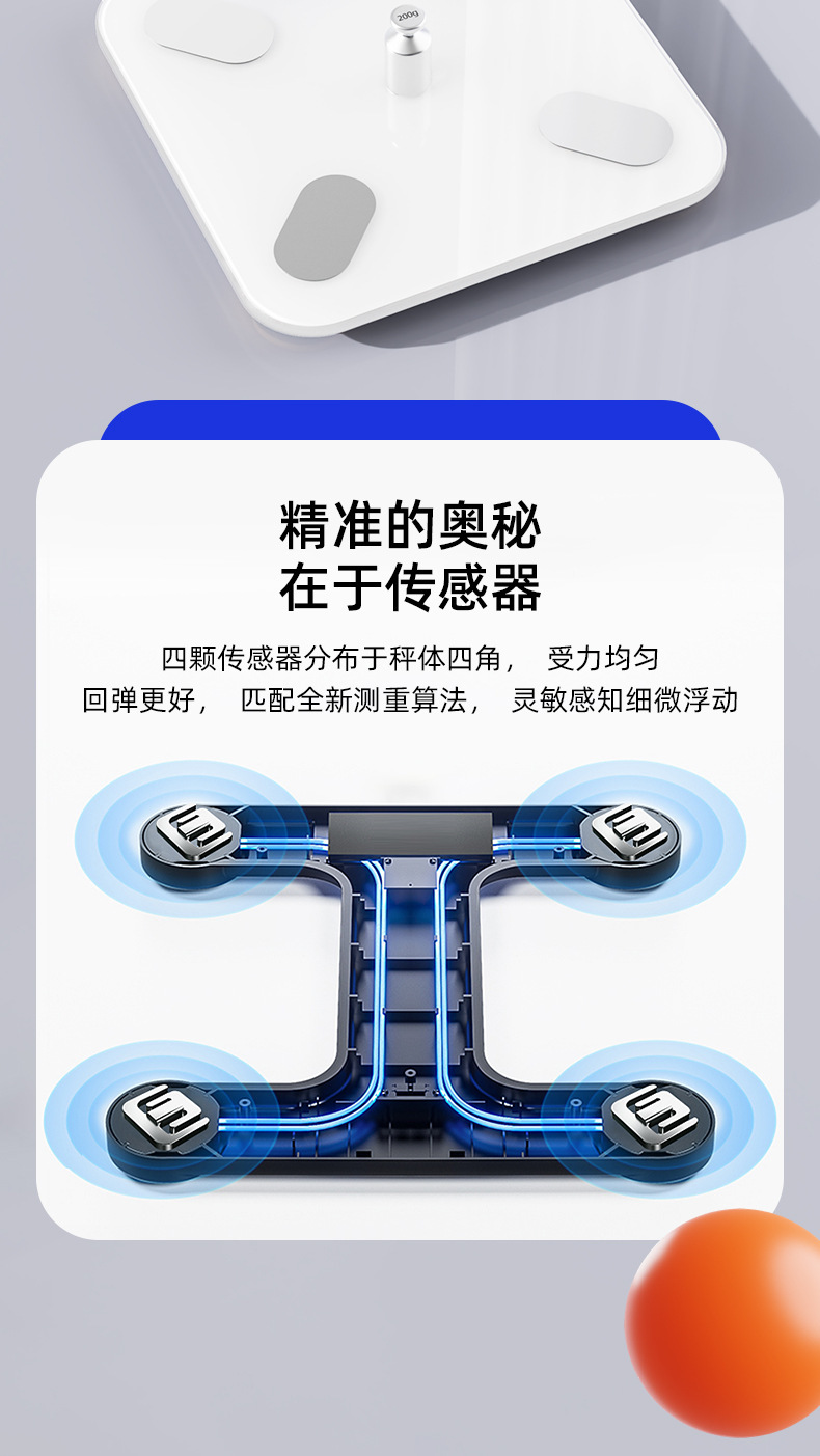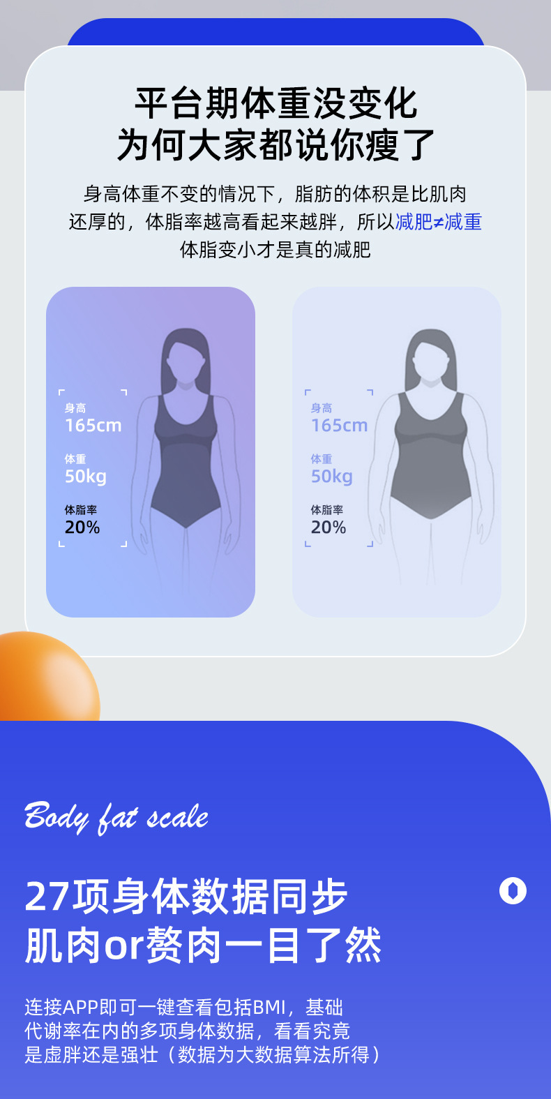 1、体脂数据是通过体重秤的传感器称重 +APP 大数据智能算法分析得出,并非体脂秤直接测量,秤面图案仅为装饰用。