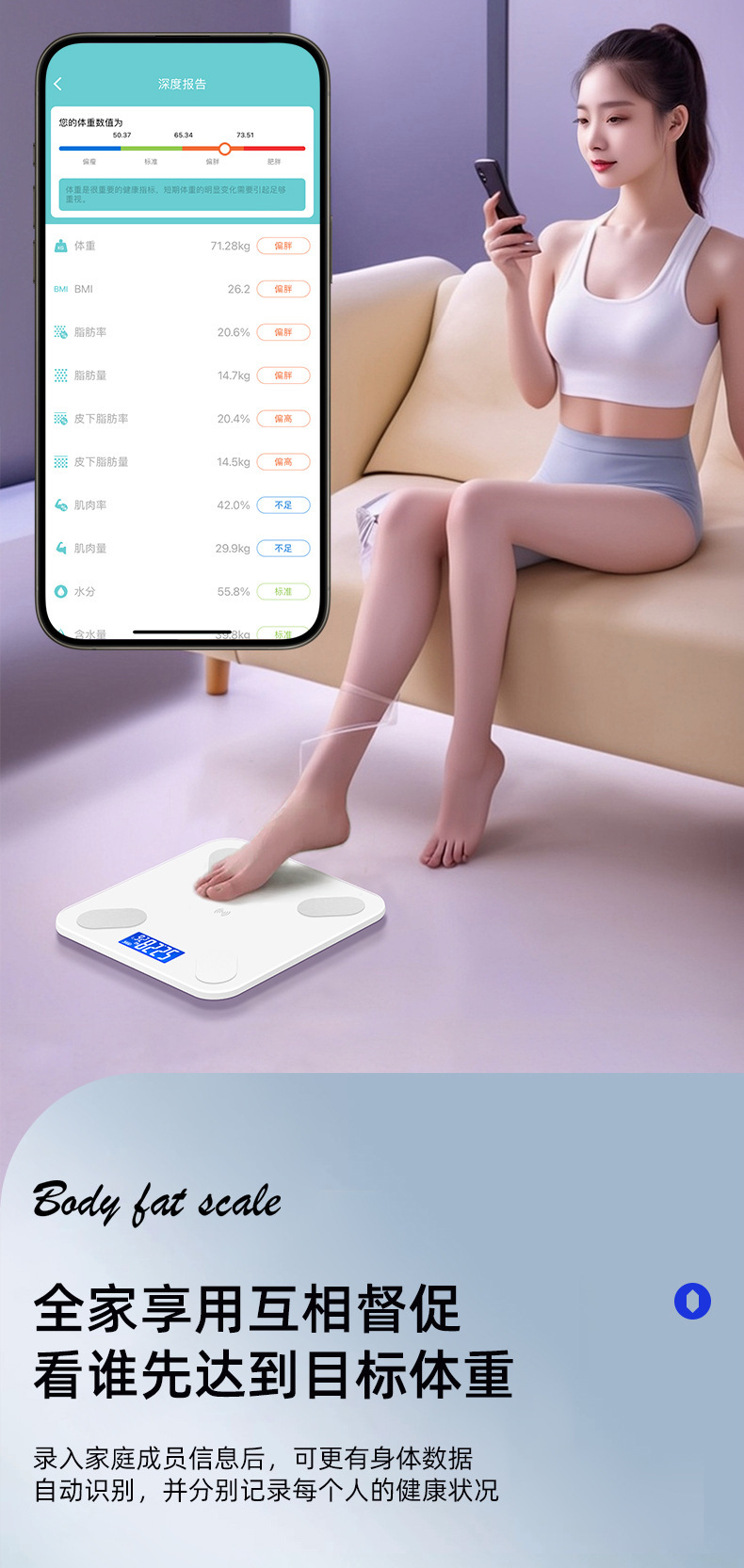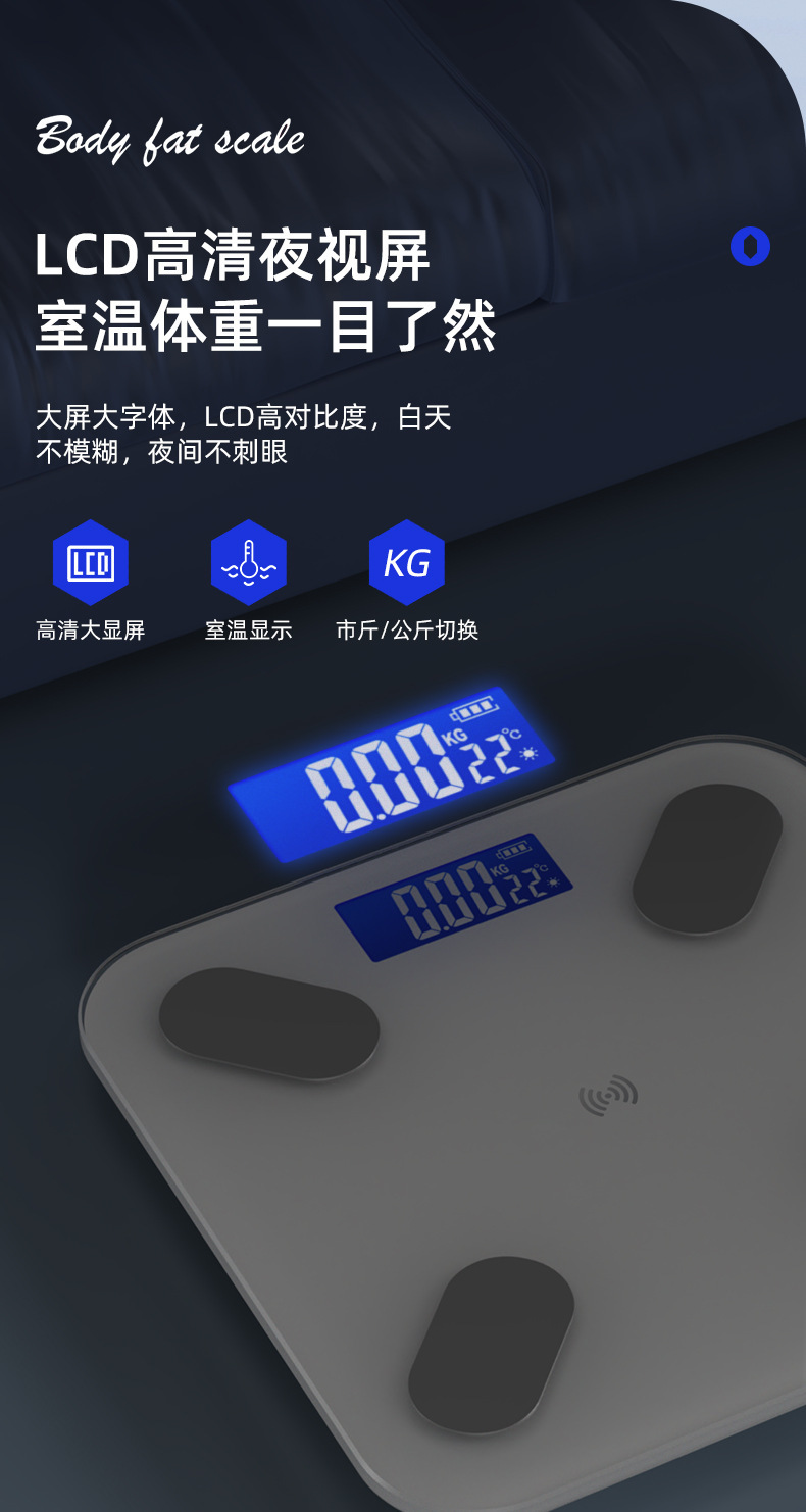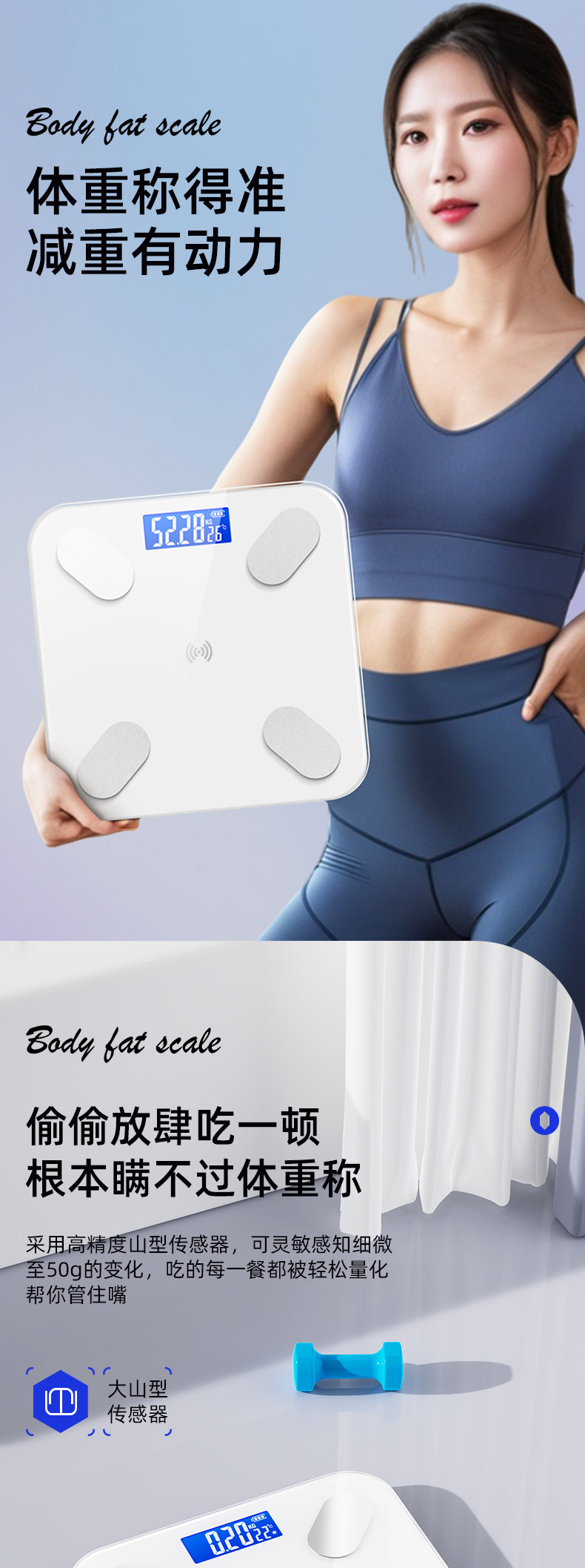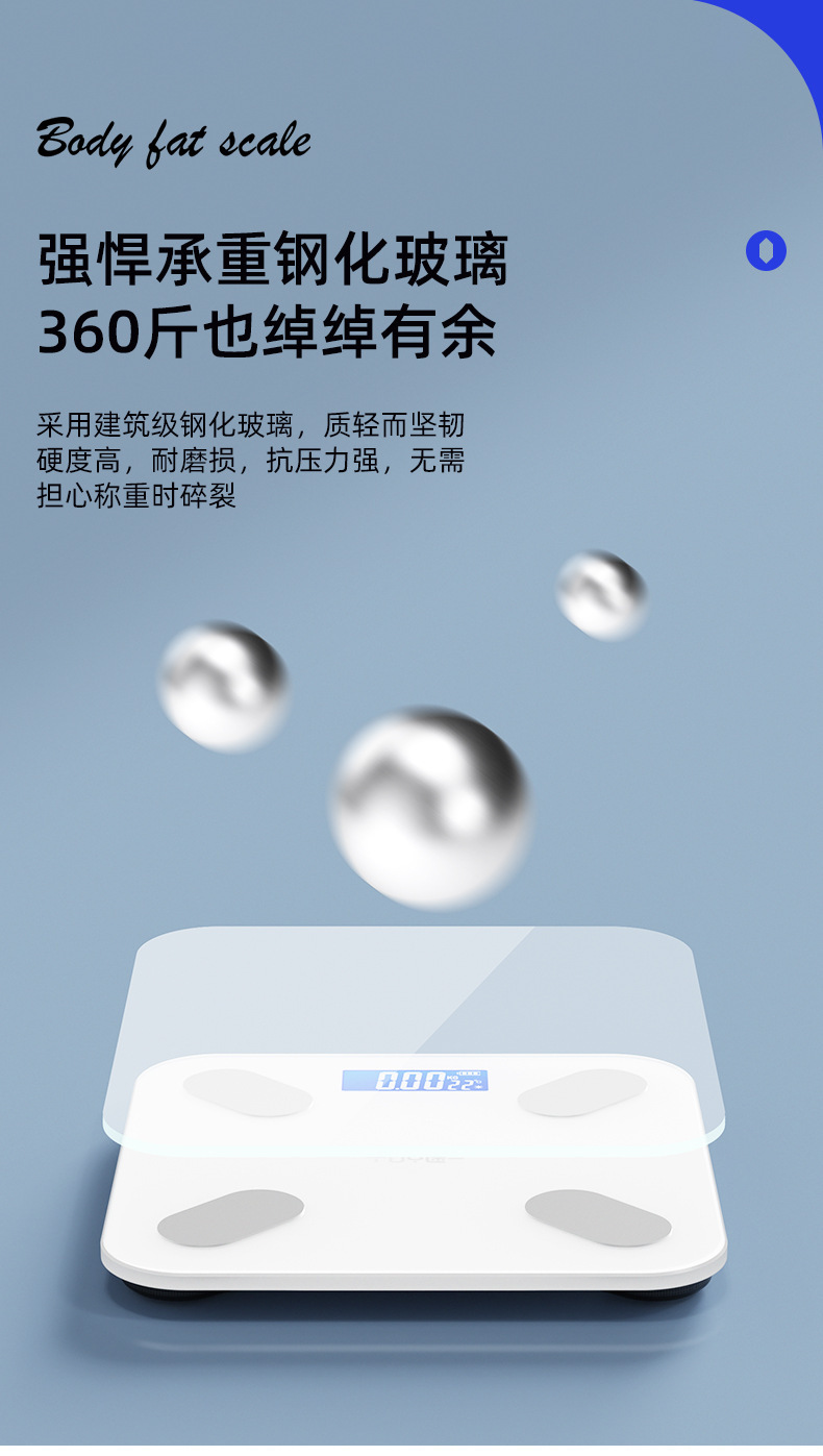 1、体脂数据是通过体重秤的传感器称重 +APP 大数据智能算法分析得出,并非体脂秤直接测量,秤面图案仅为装饰用。
