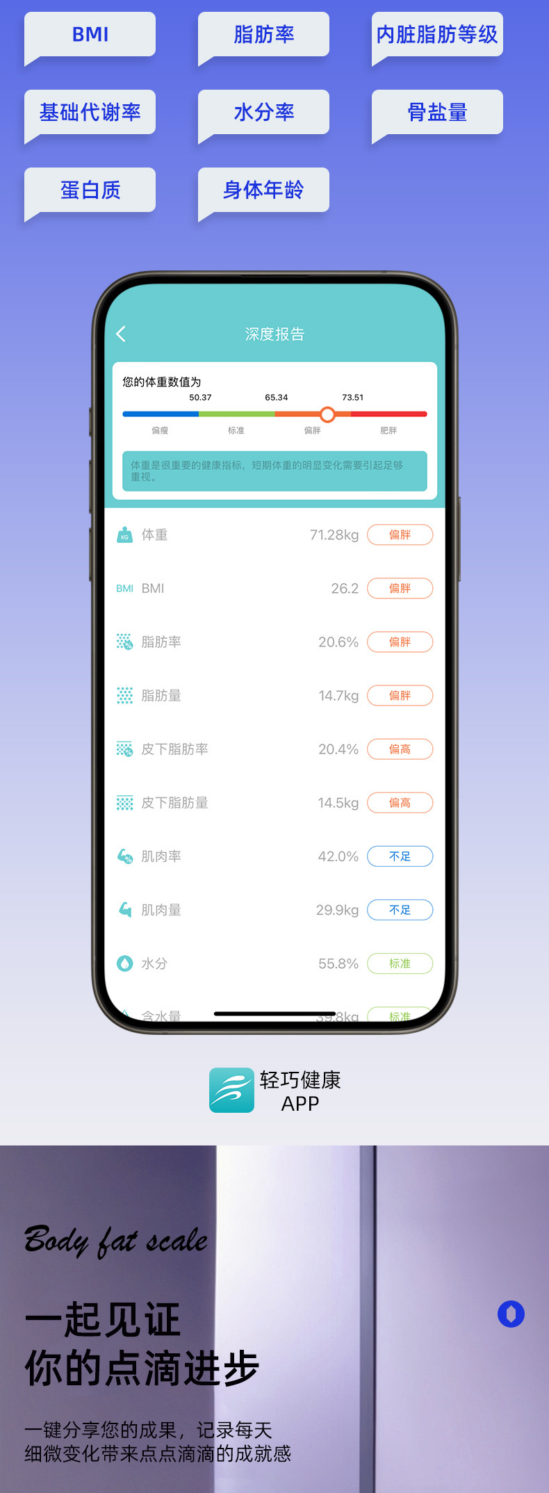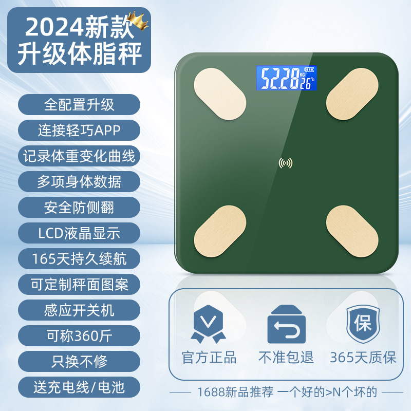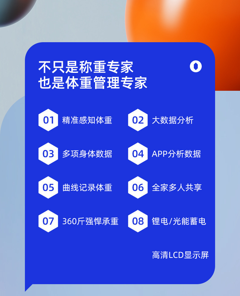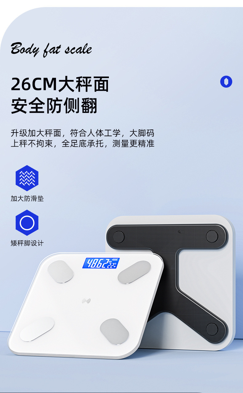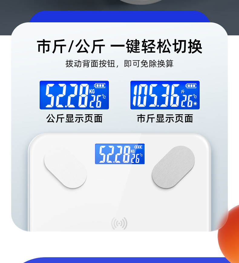 1、体脂数据是通过体重秤的传感器称重 +APP 大数据智能算法分析得出,并非体脂秤直接测量,秤面图案仅为装饰用。