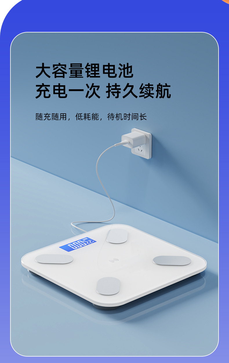 2、体重秤需要充电2小时左右充满电,充满电大约可以用1000次左右,待机约30-90天左右。