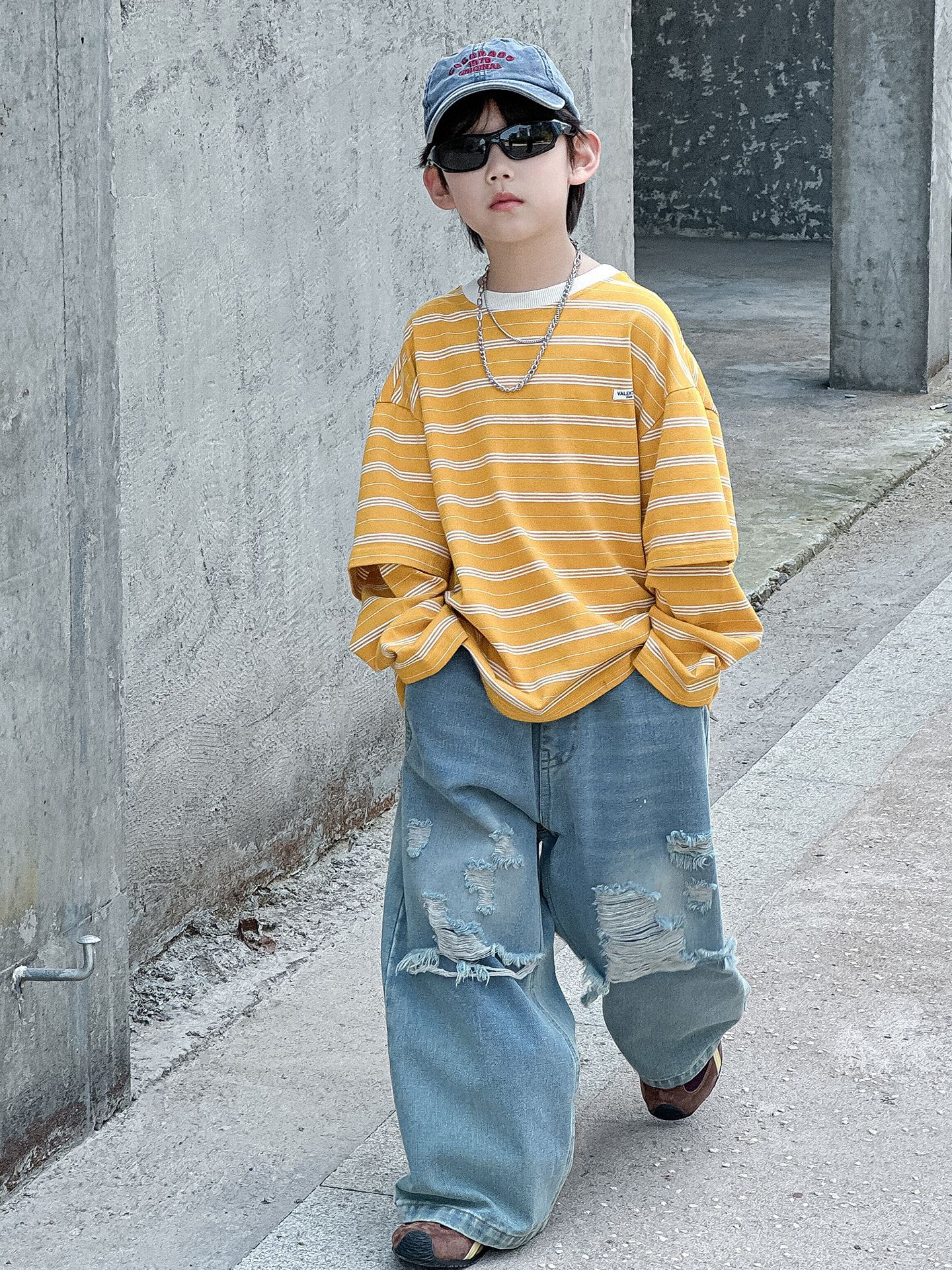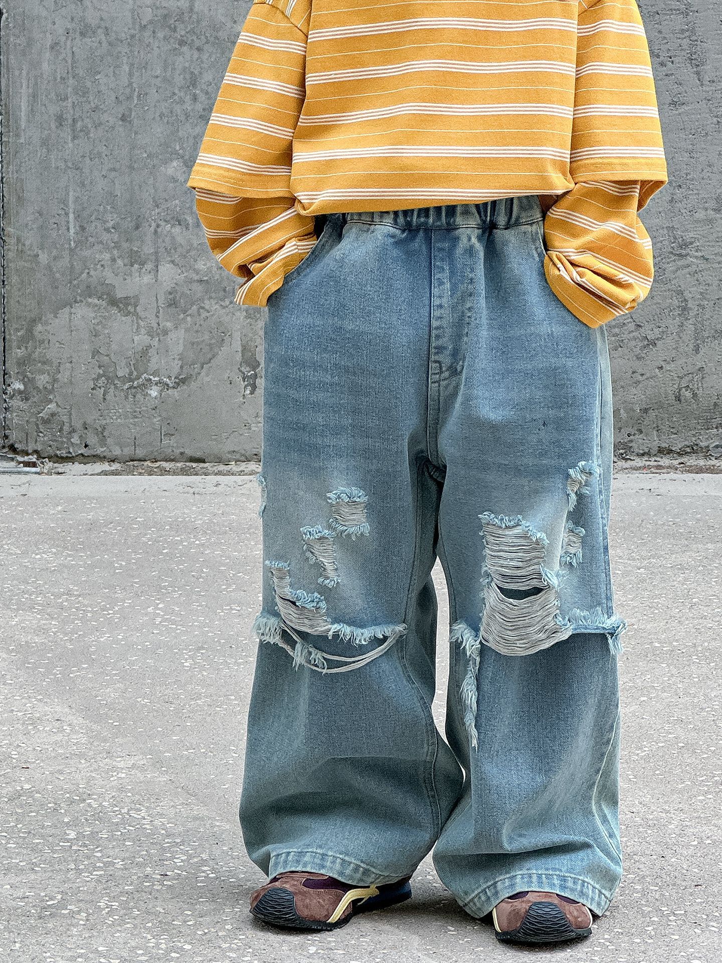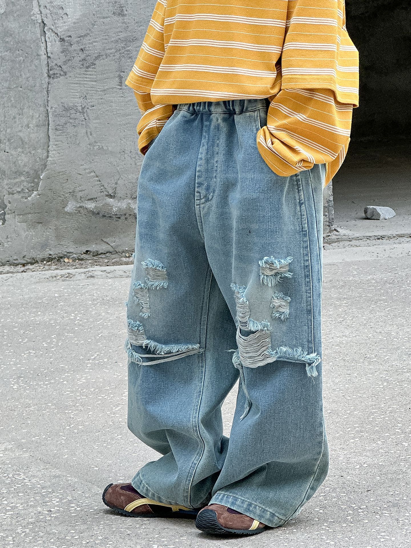 소년 가을 청바지 어린이 한국어 버전 2025 새로운 찢어진 소년 아기 아동복 유행 와이드 레그 팬츠 다용도