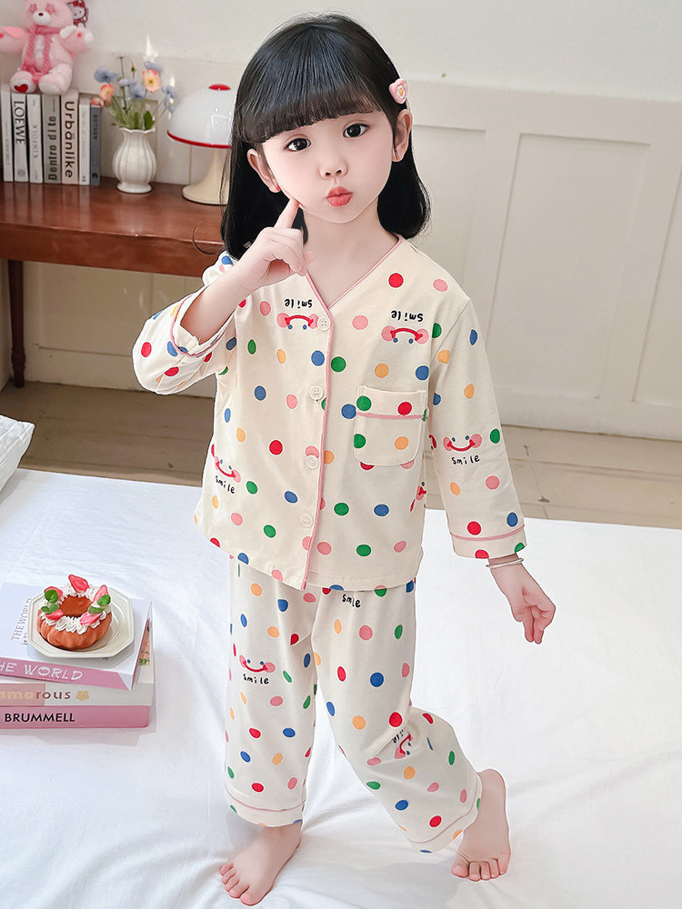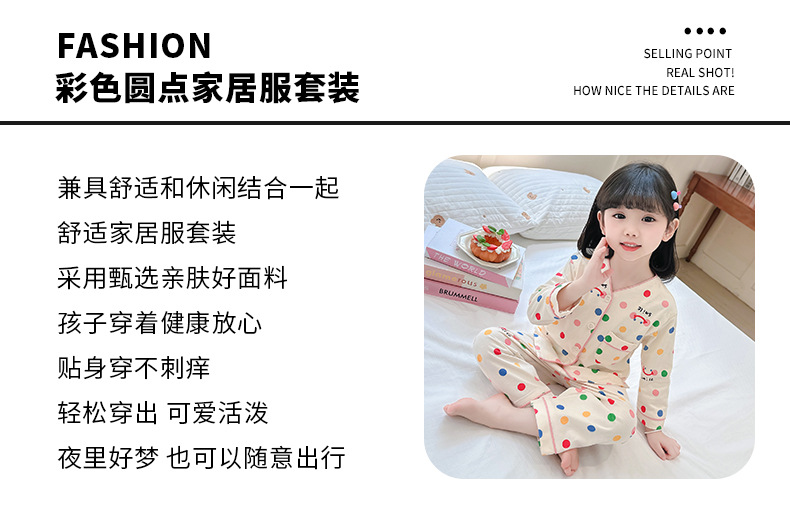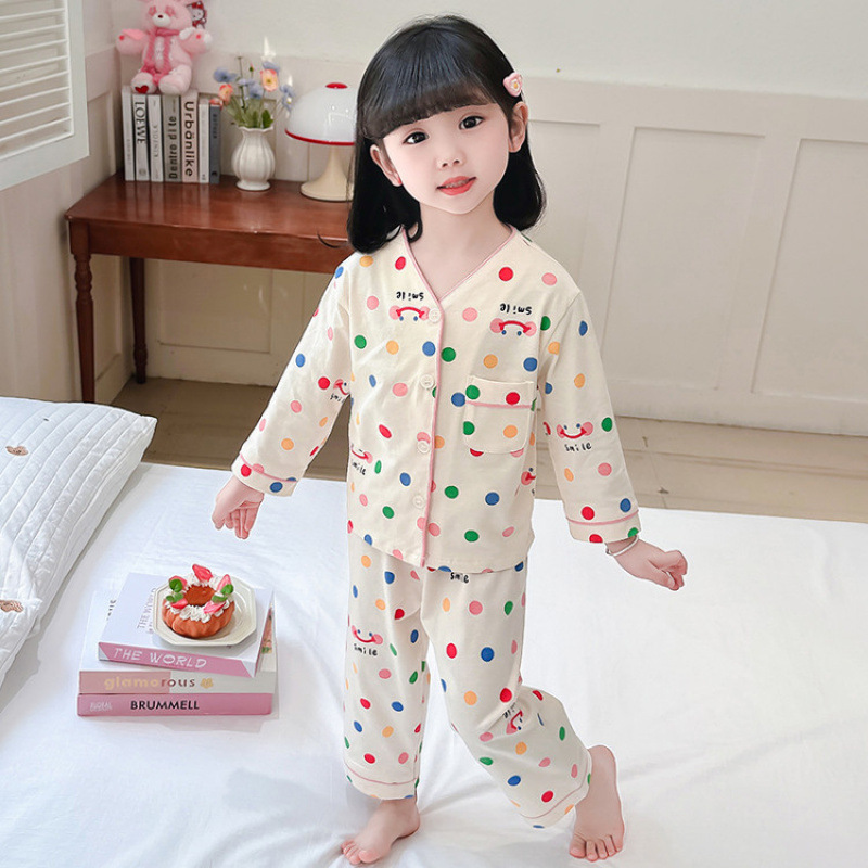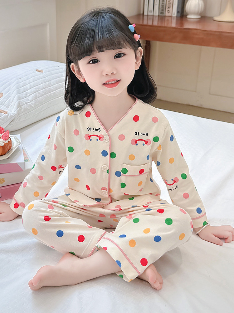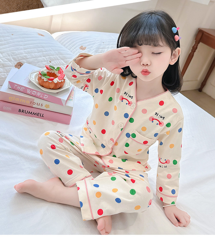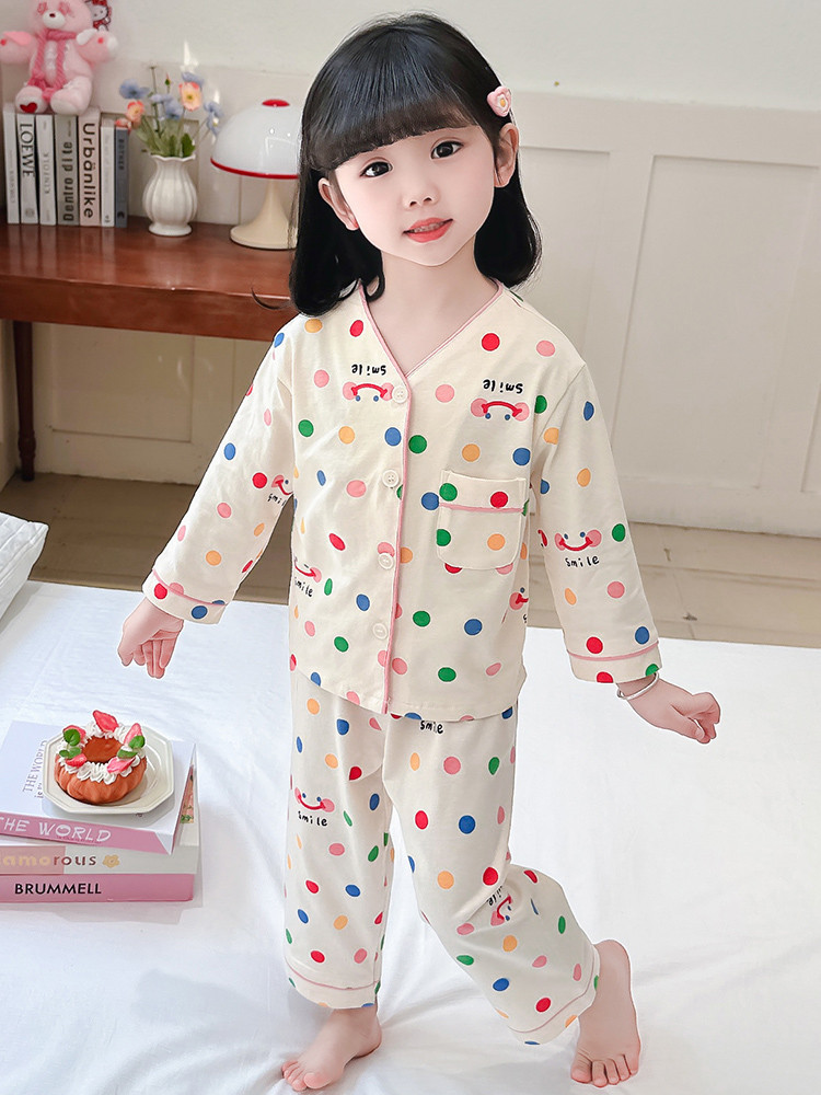 2025 어린이 잠옷 봄과 가을 다채로운 도트 아기 소녀 카디건 정장 가을 긴팔 에어컨 가정 의류스토어 가기