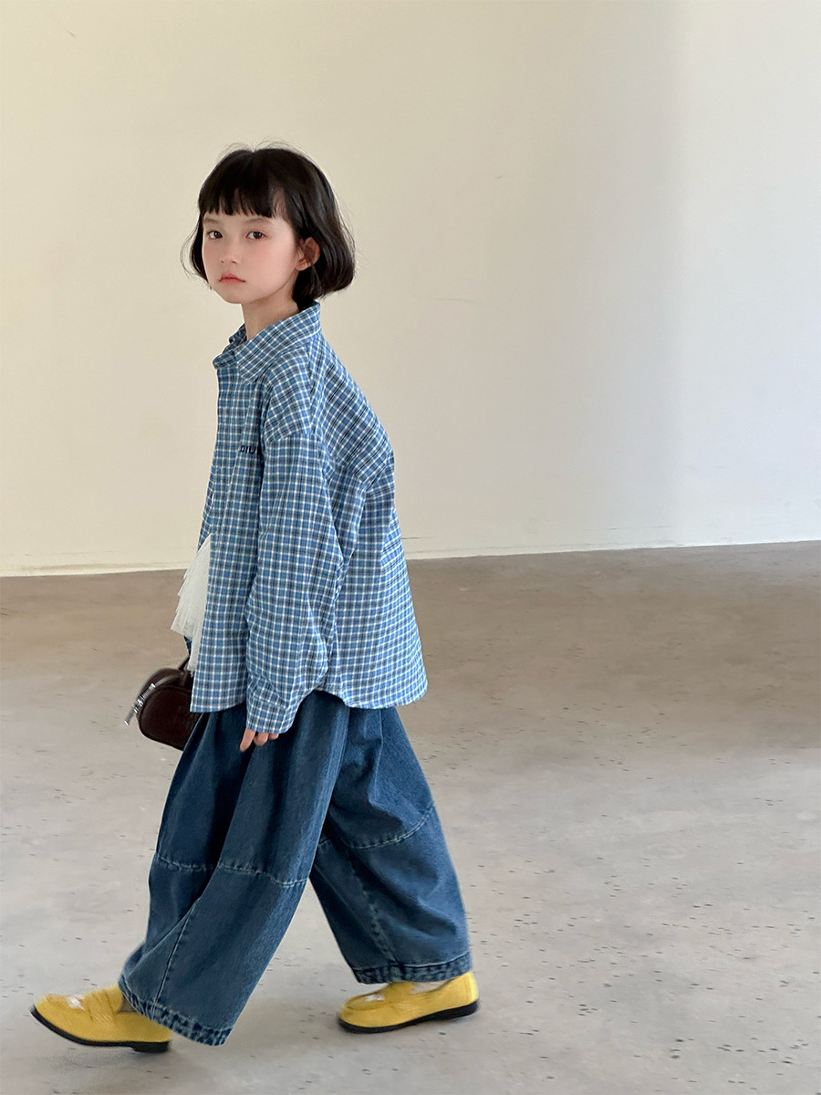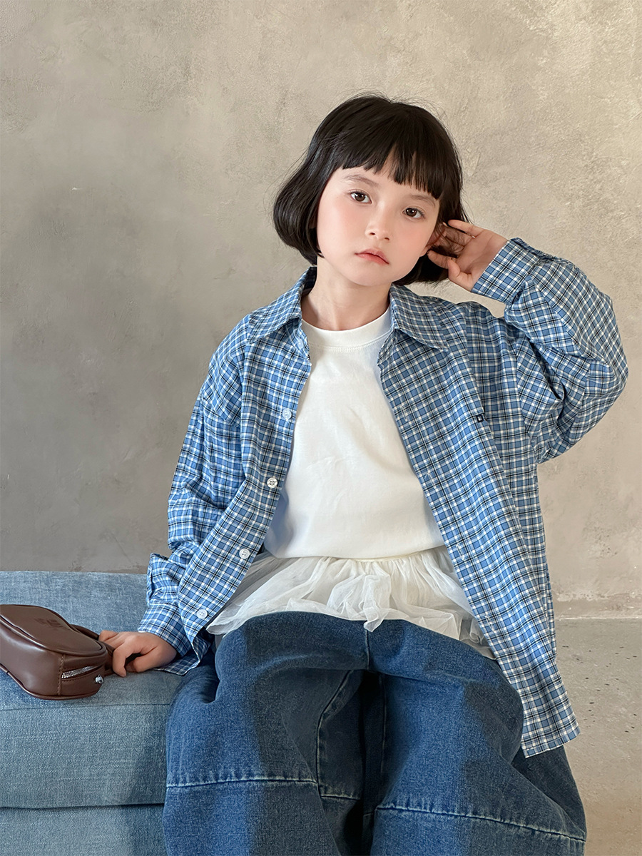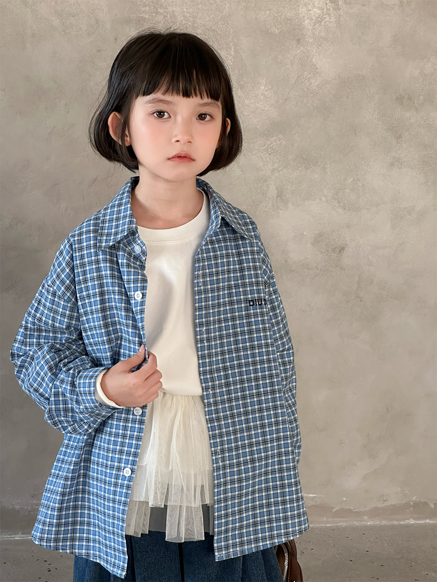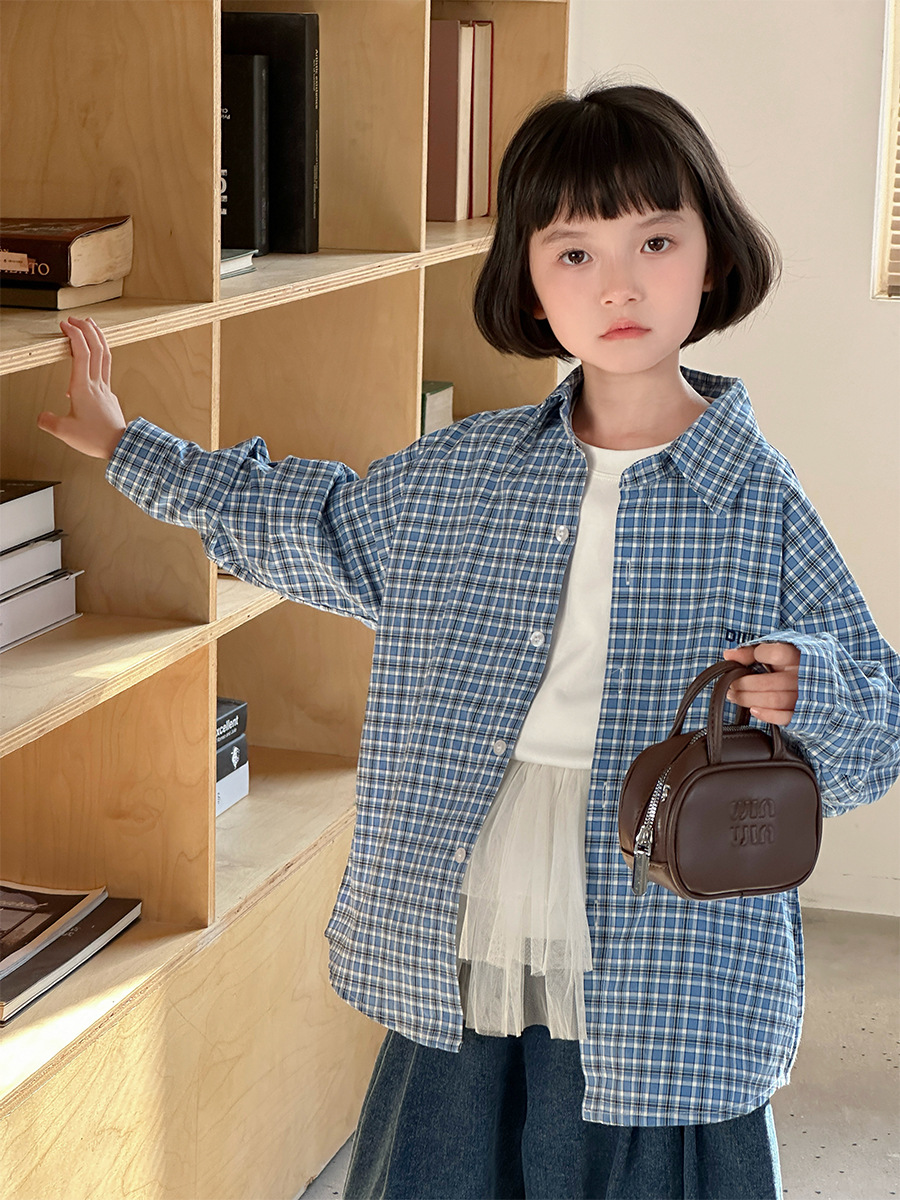 2026 봄 신상 한국 스타일 아동용 블루 체크 셔츠 남녀 공용 캐주얼 다용도 라펠 셔츠 트렌디스토어 가기