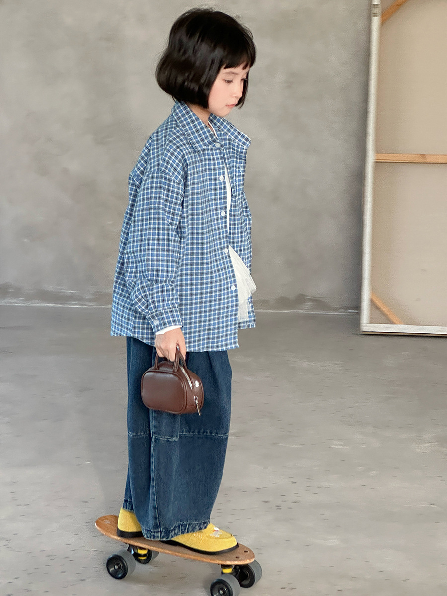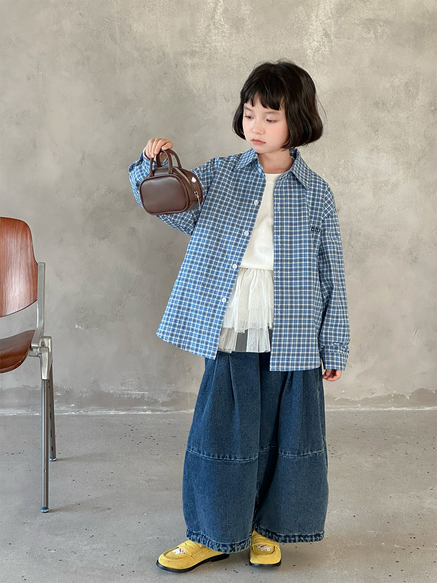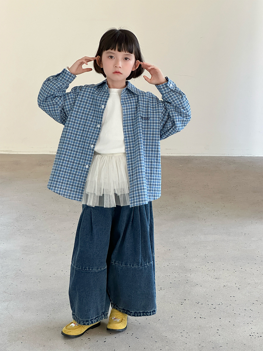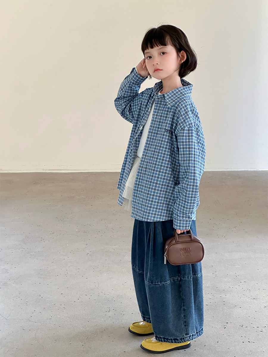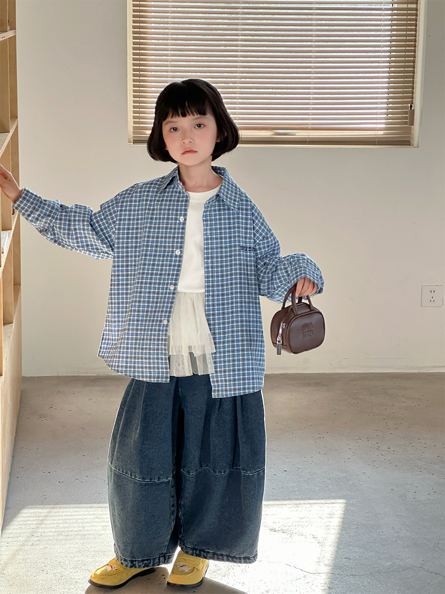 2026 봄 신상 한국 스타일 아동용 블루 체크 셔츠 남녀 공용 캐주얼 다용도 라펠 셔츠 트렌디스토어 가기