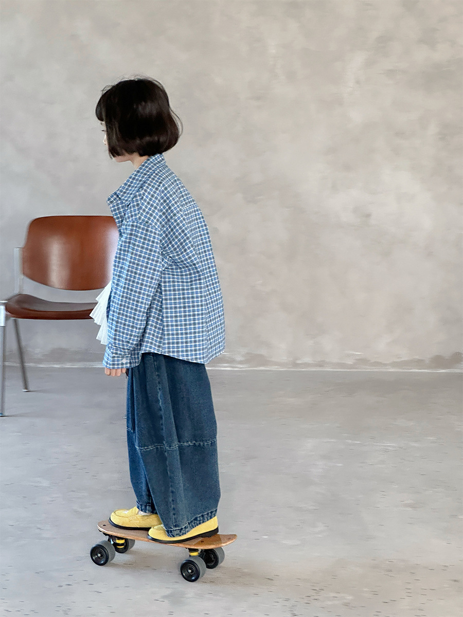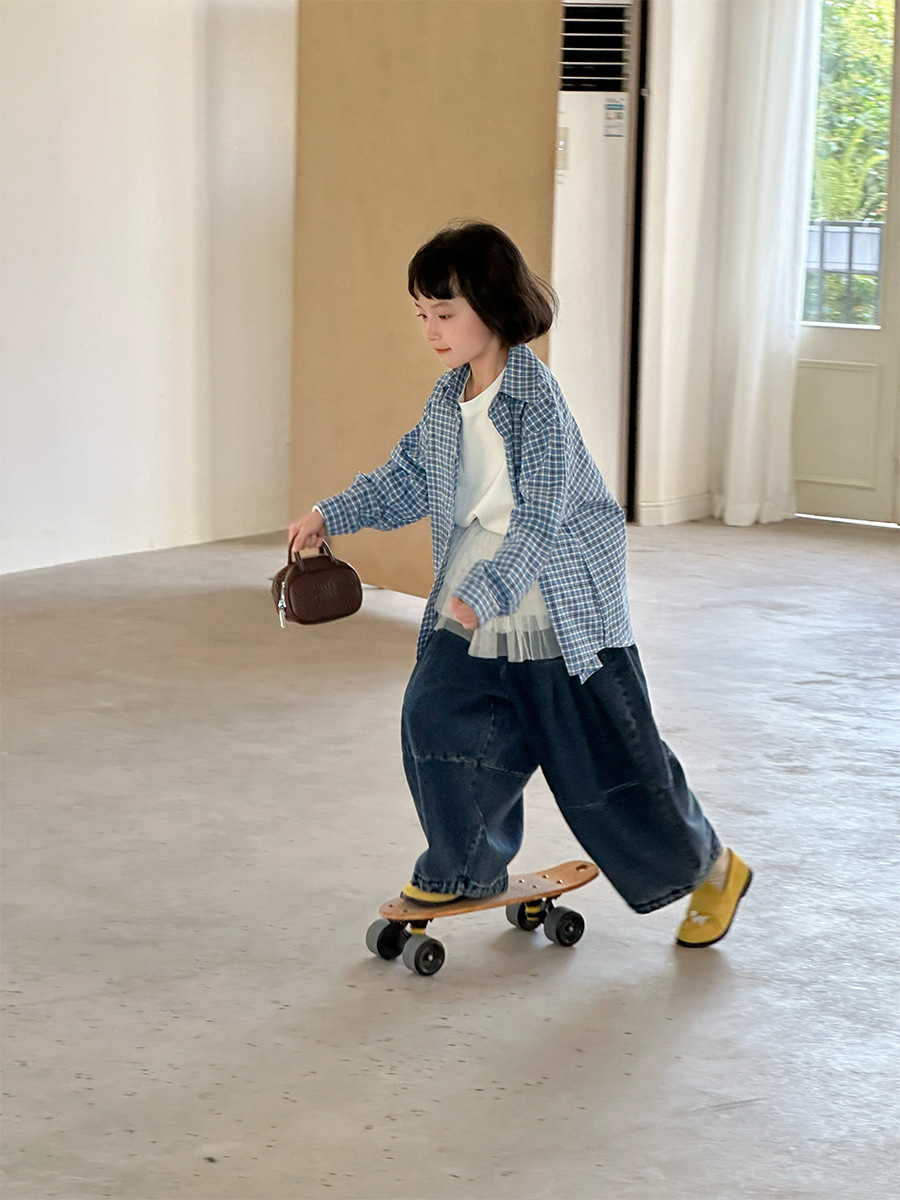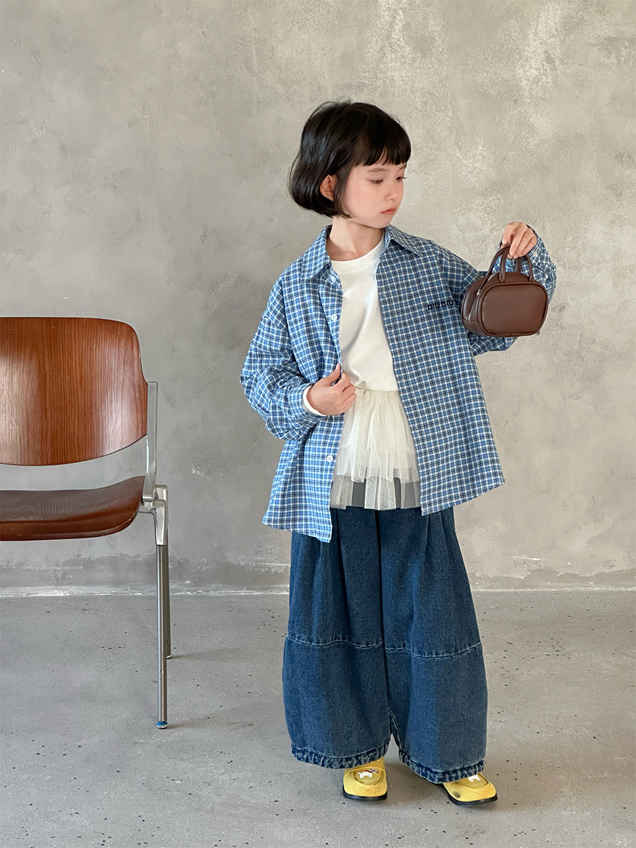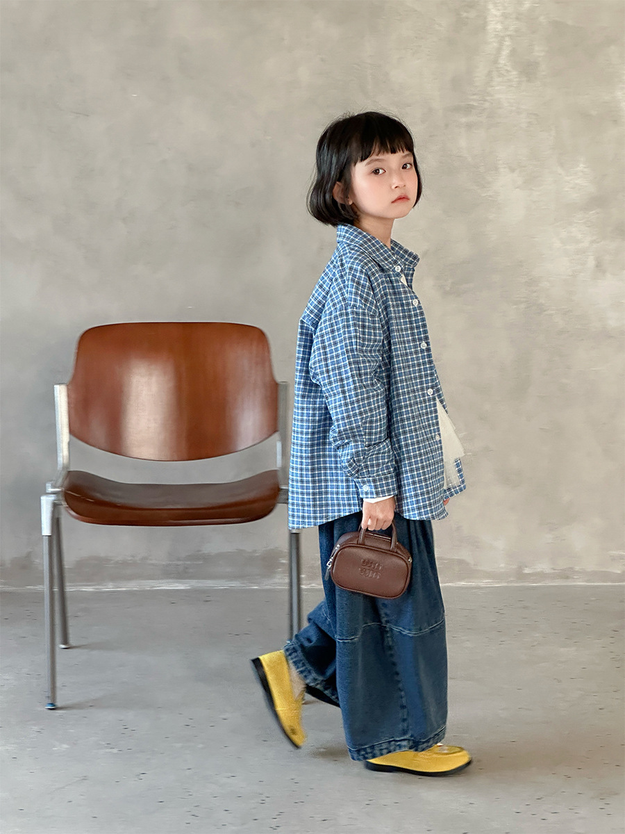 2026 봄 신상 한국 스타일 아동용 블루 체크 셔츠 남녀 공용 캐주얼 다용도 라펠 셔츠 트렌디스토어 가기