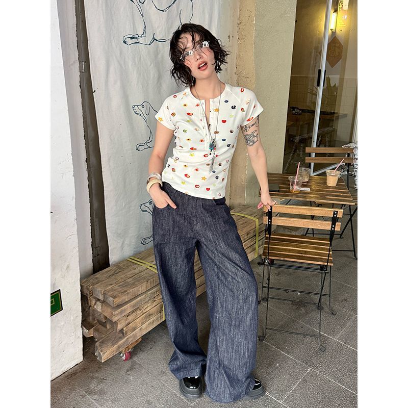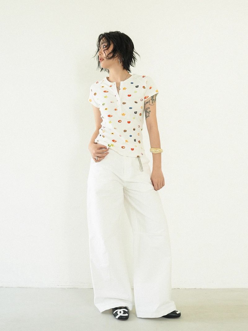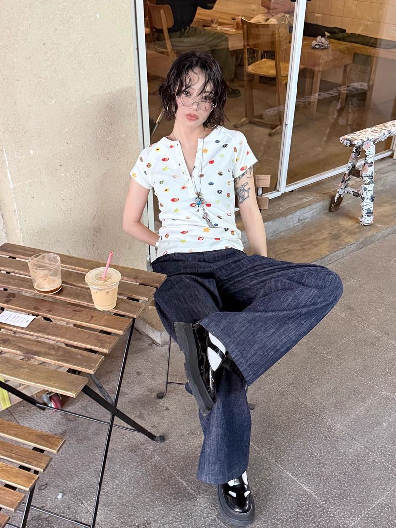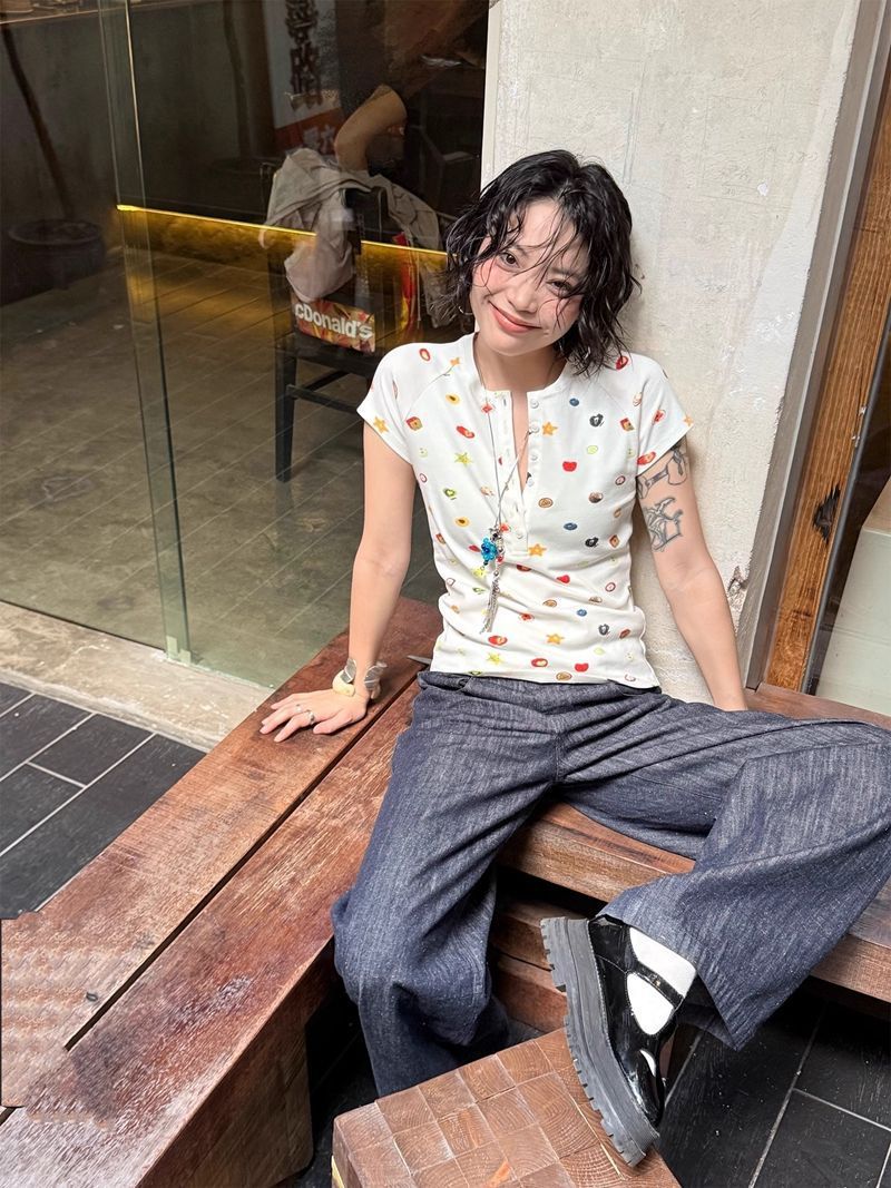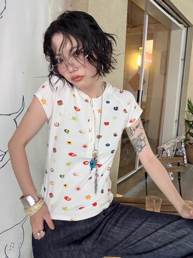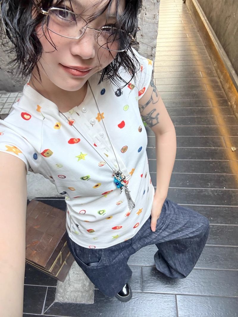 달콤하고 매콤한 스타일의 헨리 칼라 버튼 다운 반팔 여성 여름 착용 과일 프린트 오른쪽 어깨 티셔츠 슬림 슬리밍 탑 티