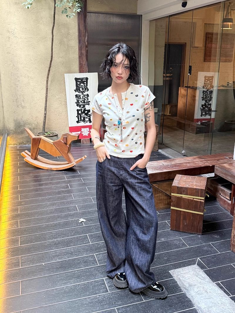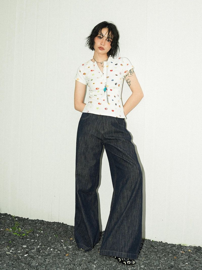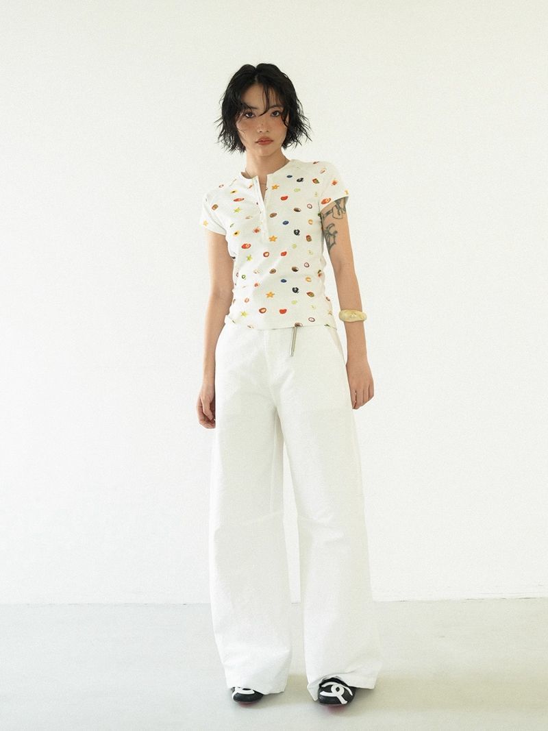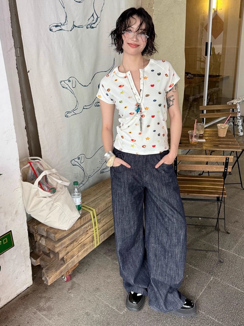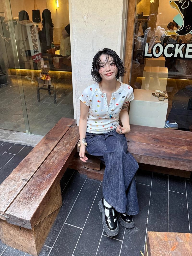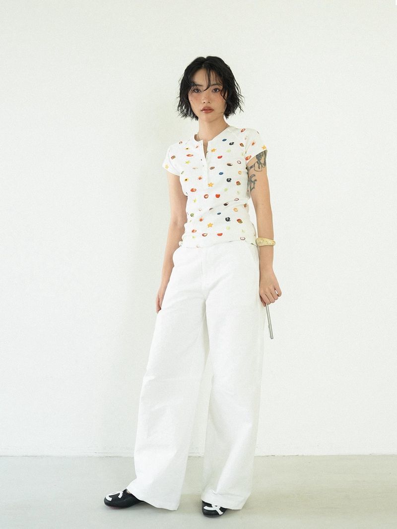 달콤하고 매콤한 스타일의 헨리 칼라 버튼 다운 반팔 여성 여름 착용 과일 프린트 오른쪽 어깨 티셔츠 슬림 슬리밍 탑 티