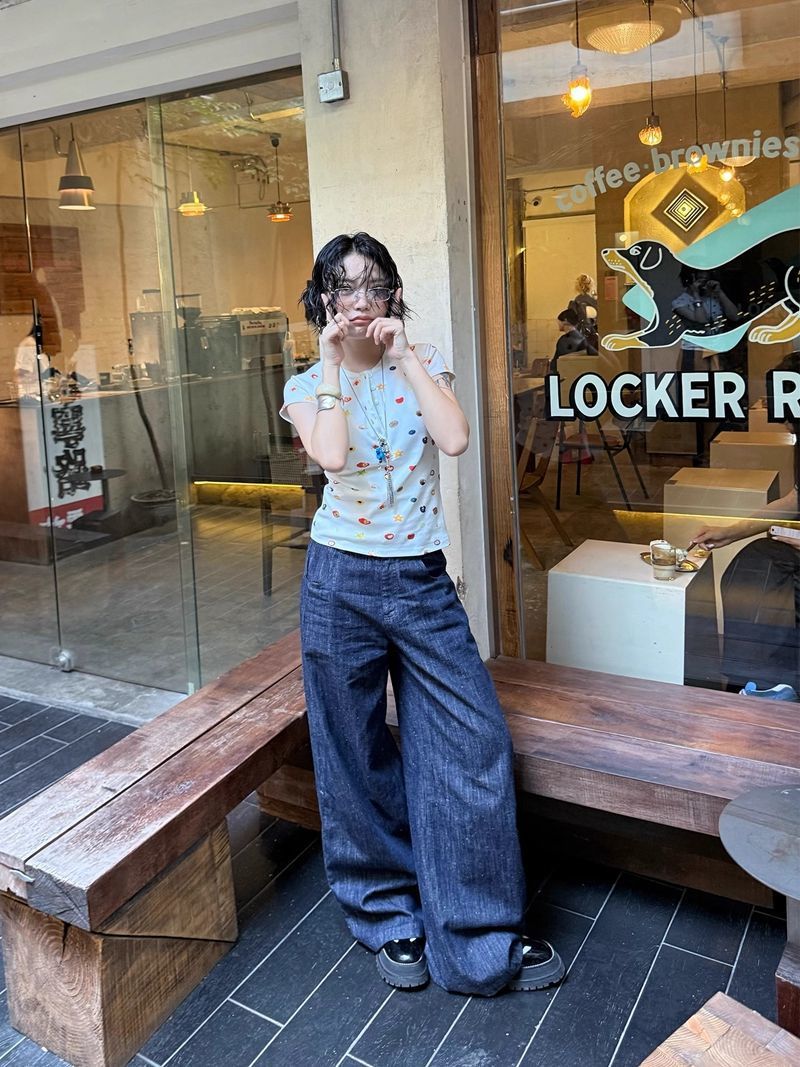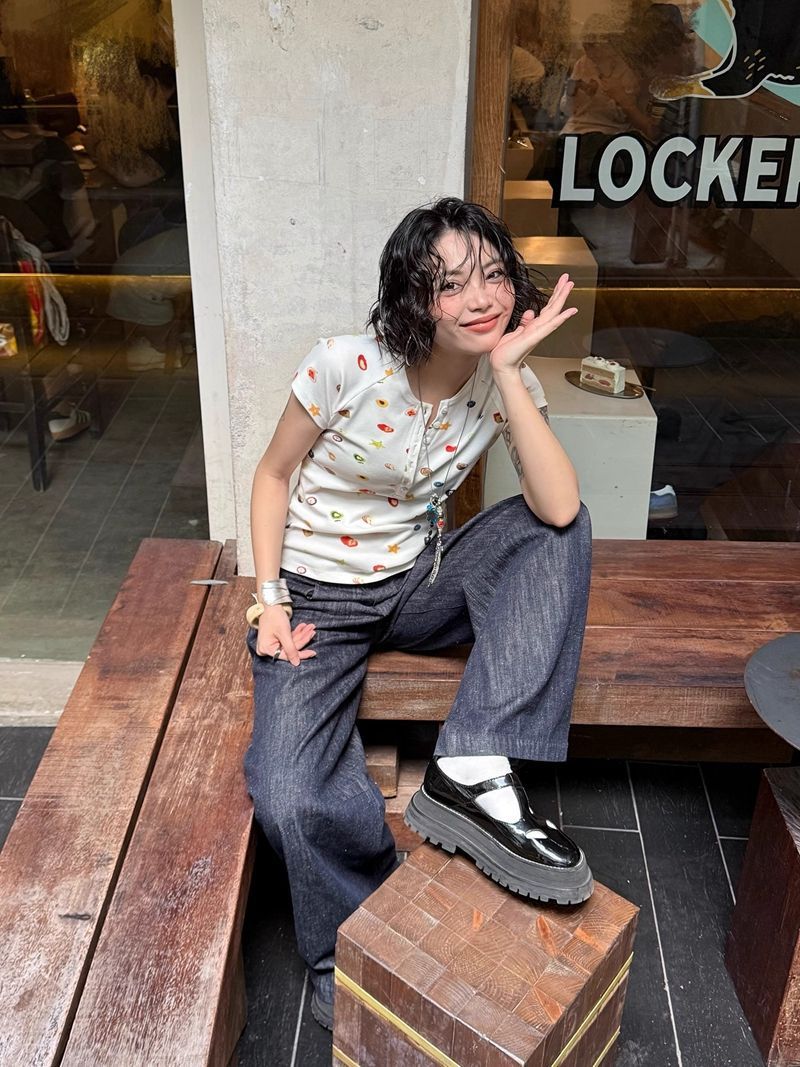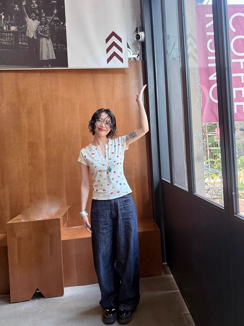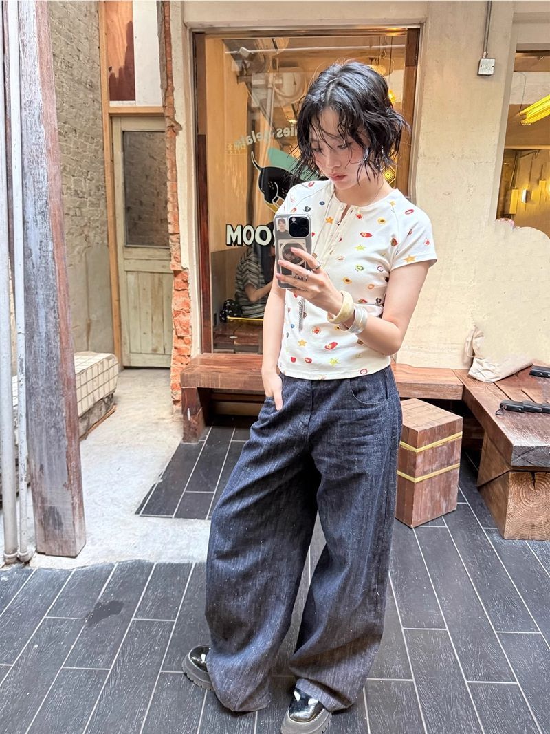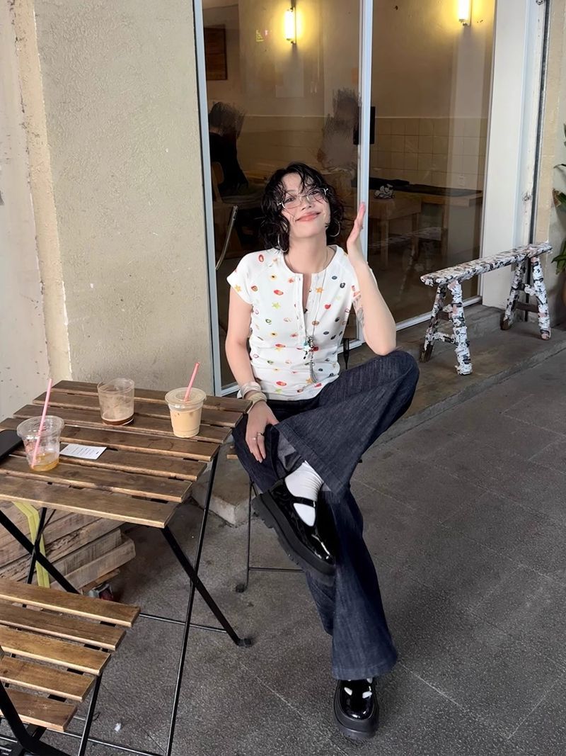 달콤하고 매콤한 스타일의 헨리 칼라 버튼 다운 반팔 여성 여름 착용 과일 프린트 오른쪽 어깨 티셔츠 슬림 슬리밍 탑 티스토어 가기