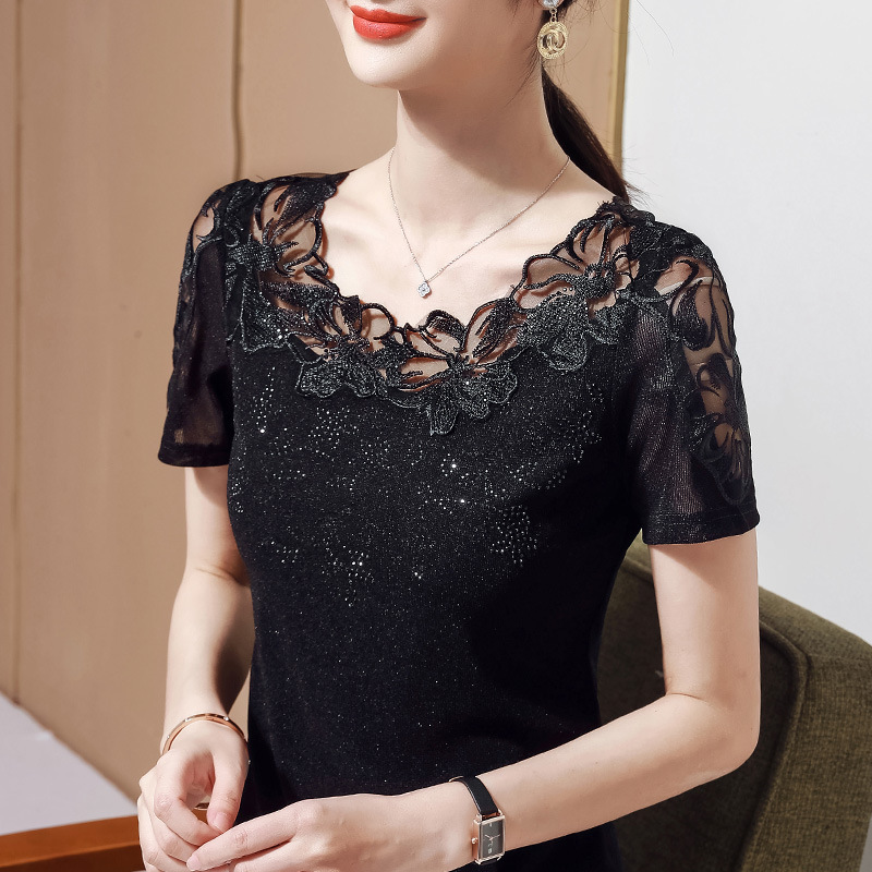 여름 신상 레이스 셔츠, 패셔너블한 다이아몬드 자수 반팔 여성 상의, 티셔츠, 거즈 셔츠스토어 가기