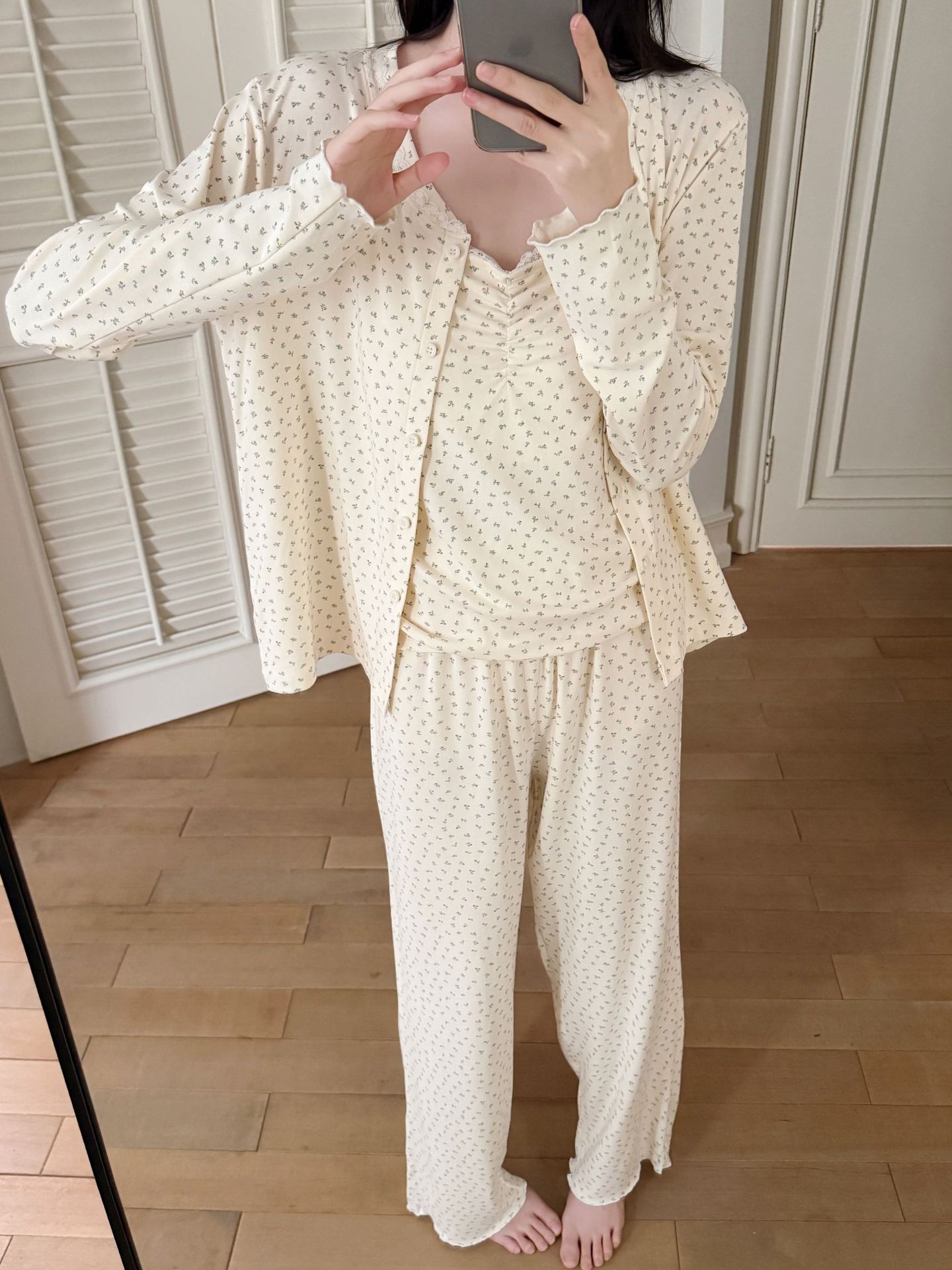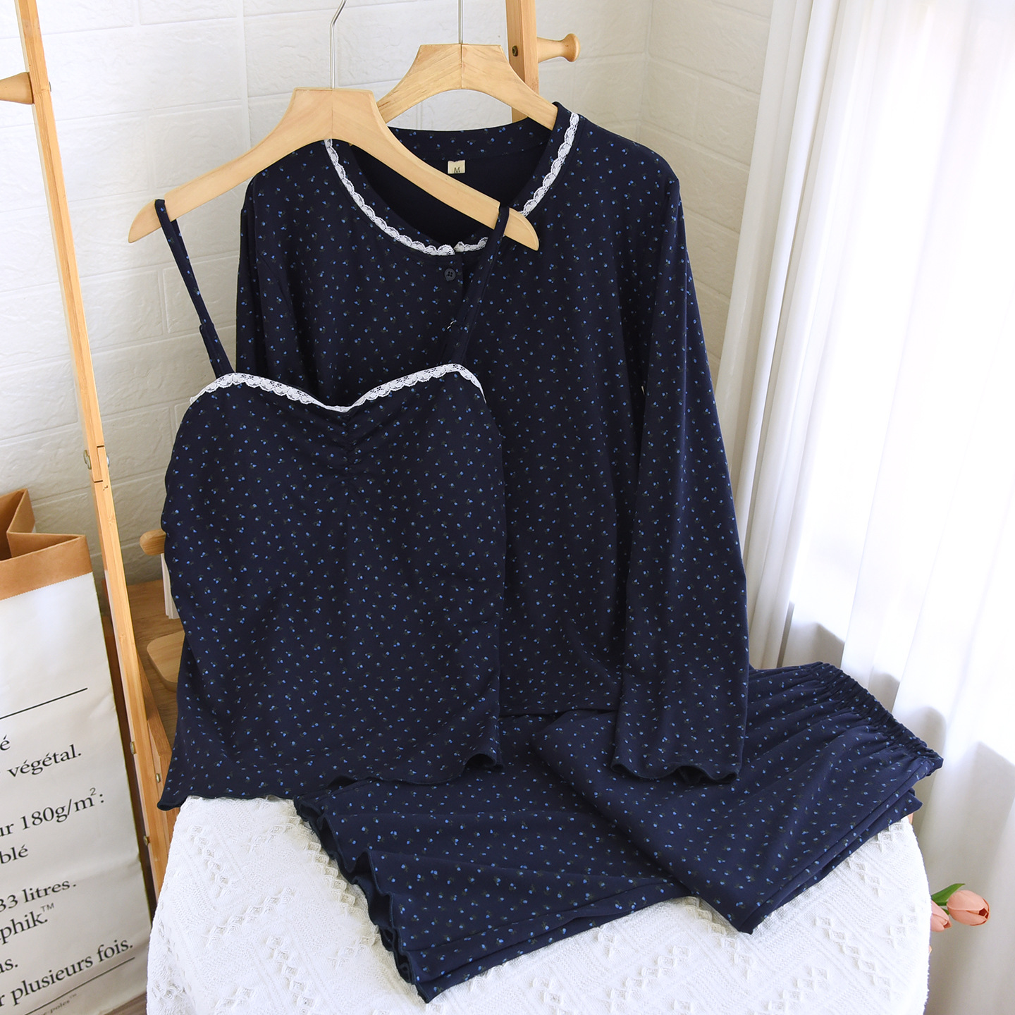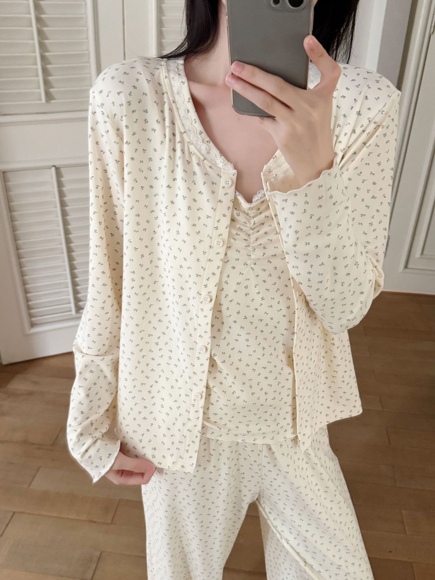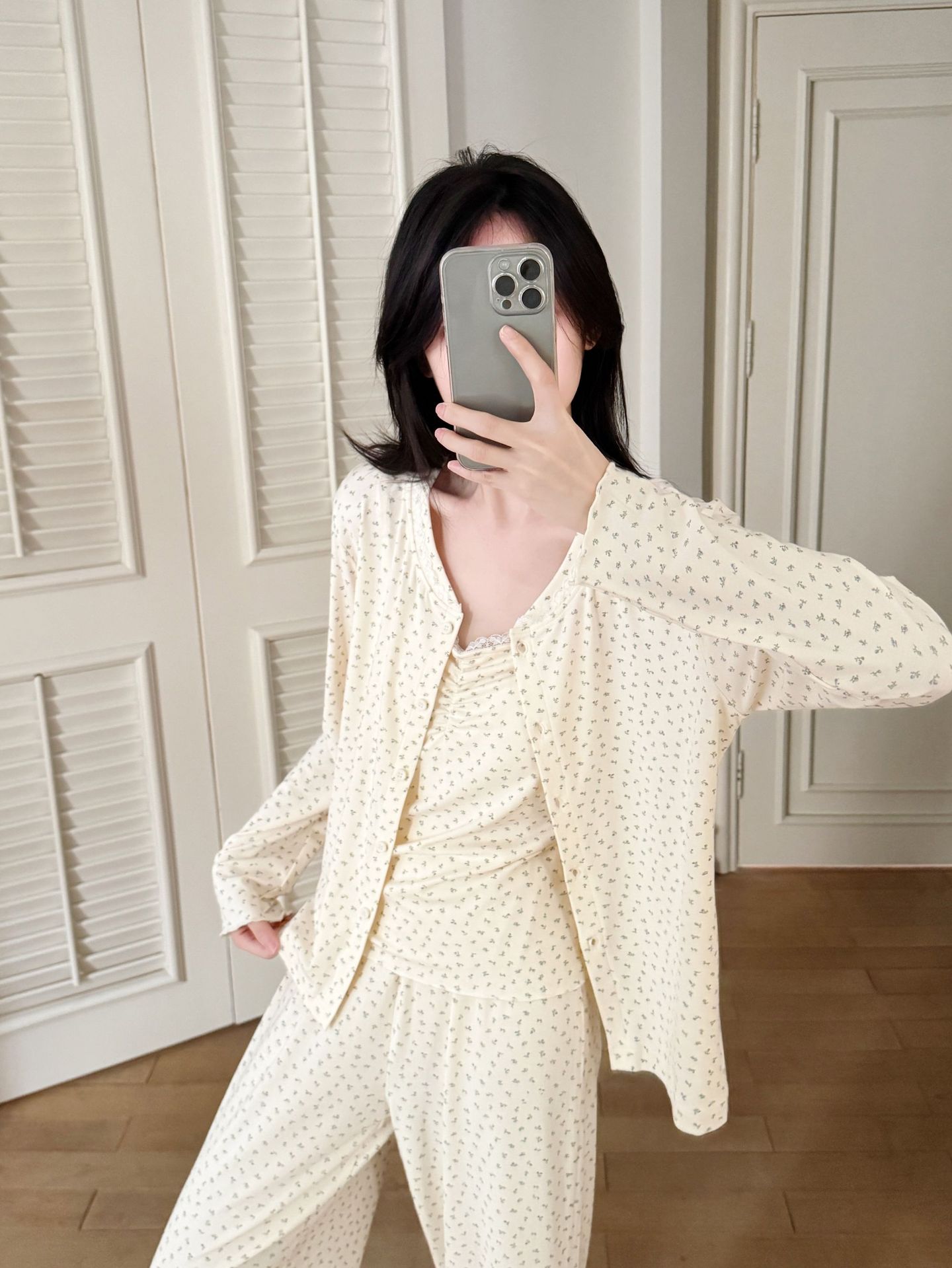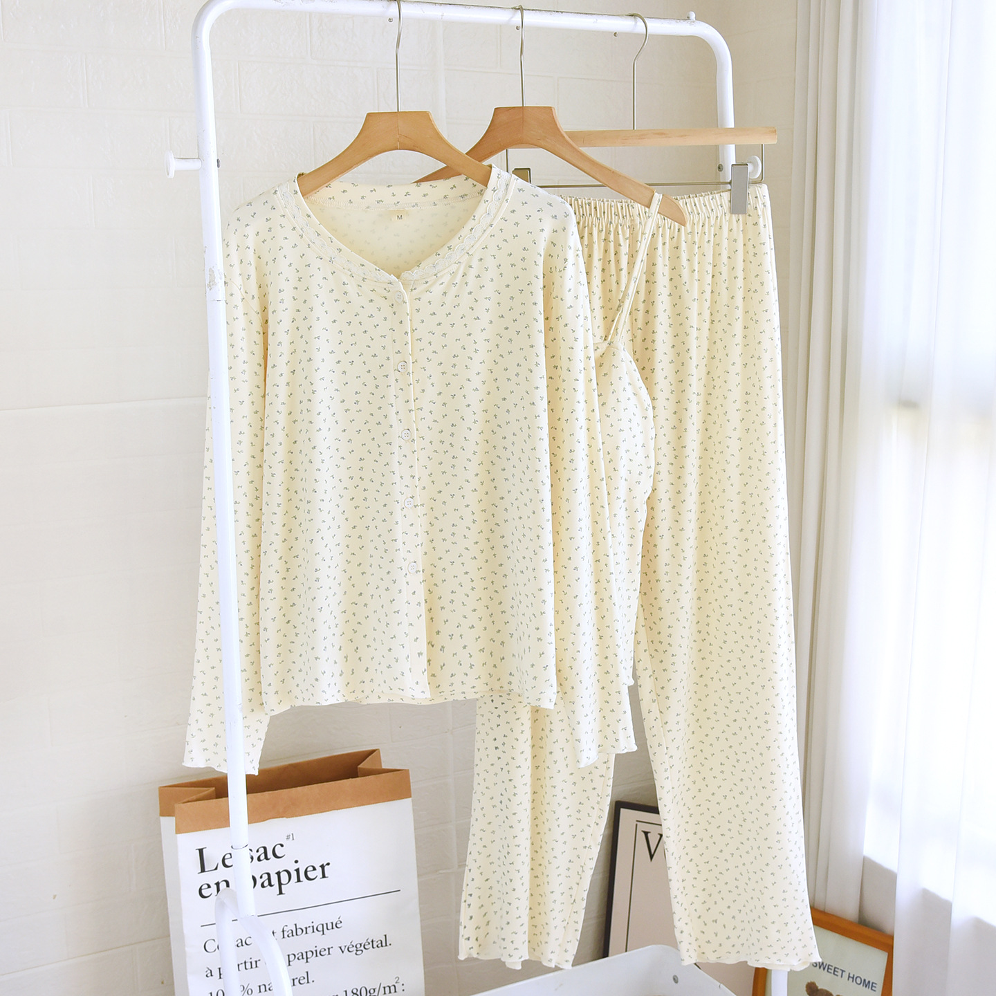 여성용 모달 잠옷 봄 여름용 가슴 패드와 끈이 있는 긴팔 3피스 세트, 소녀들을 위한 부드러운 꽃무늬 홈웨어 세트스토어 가기