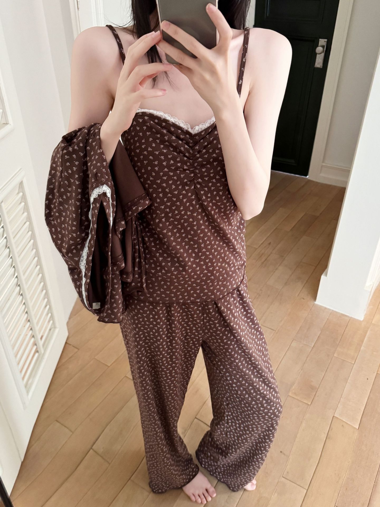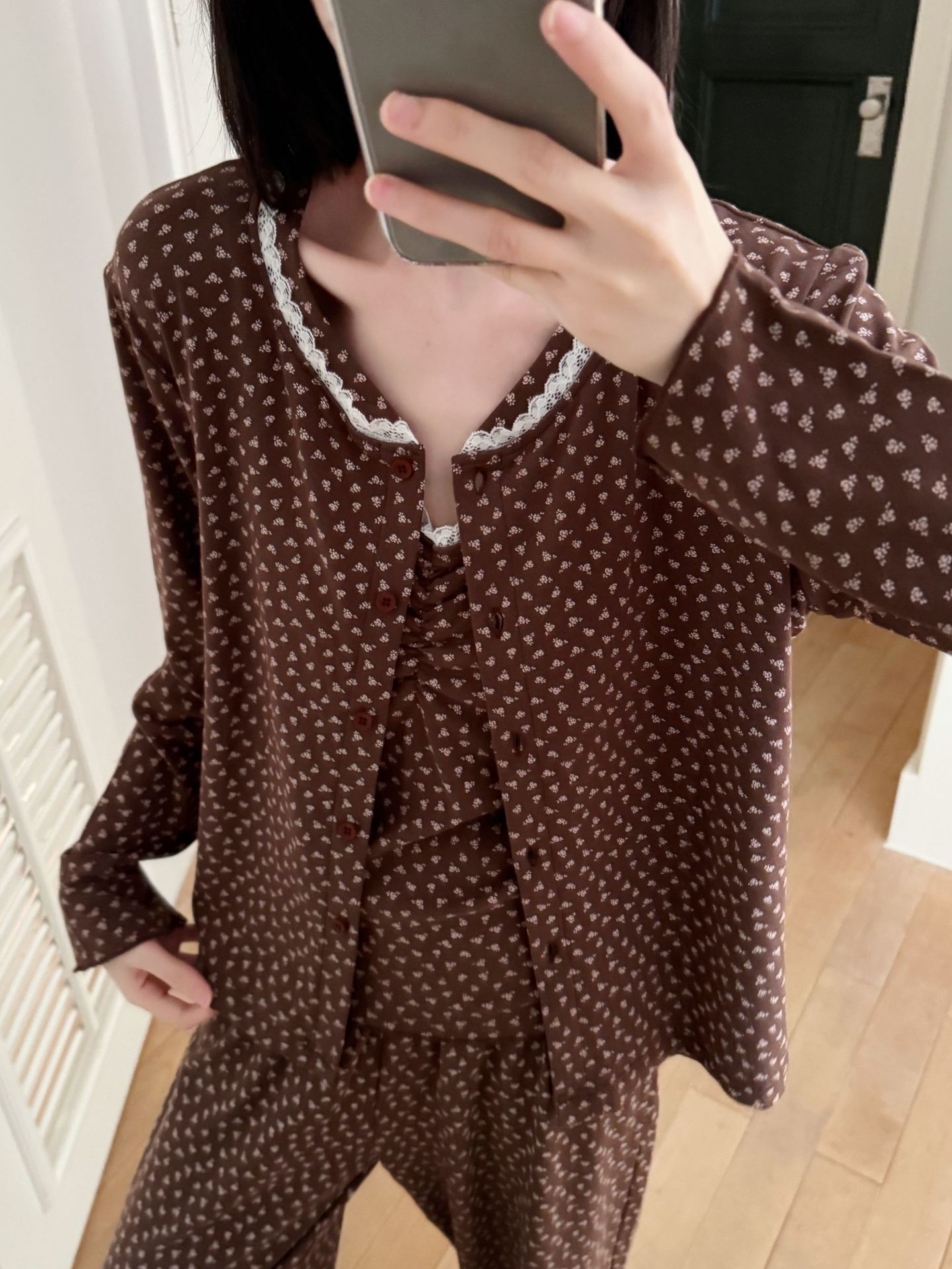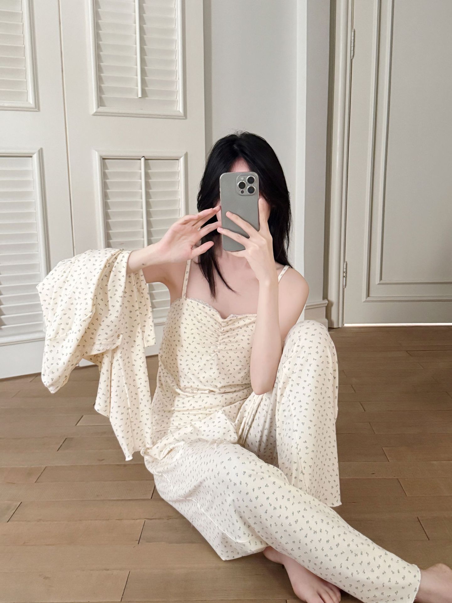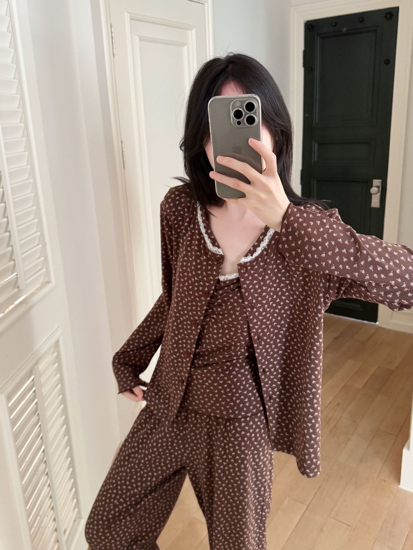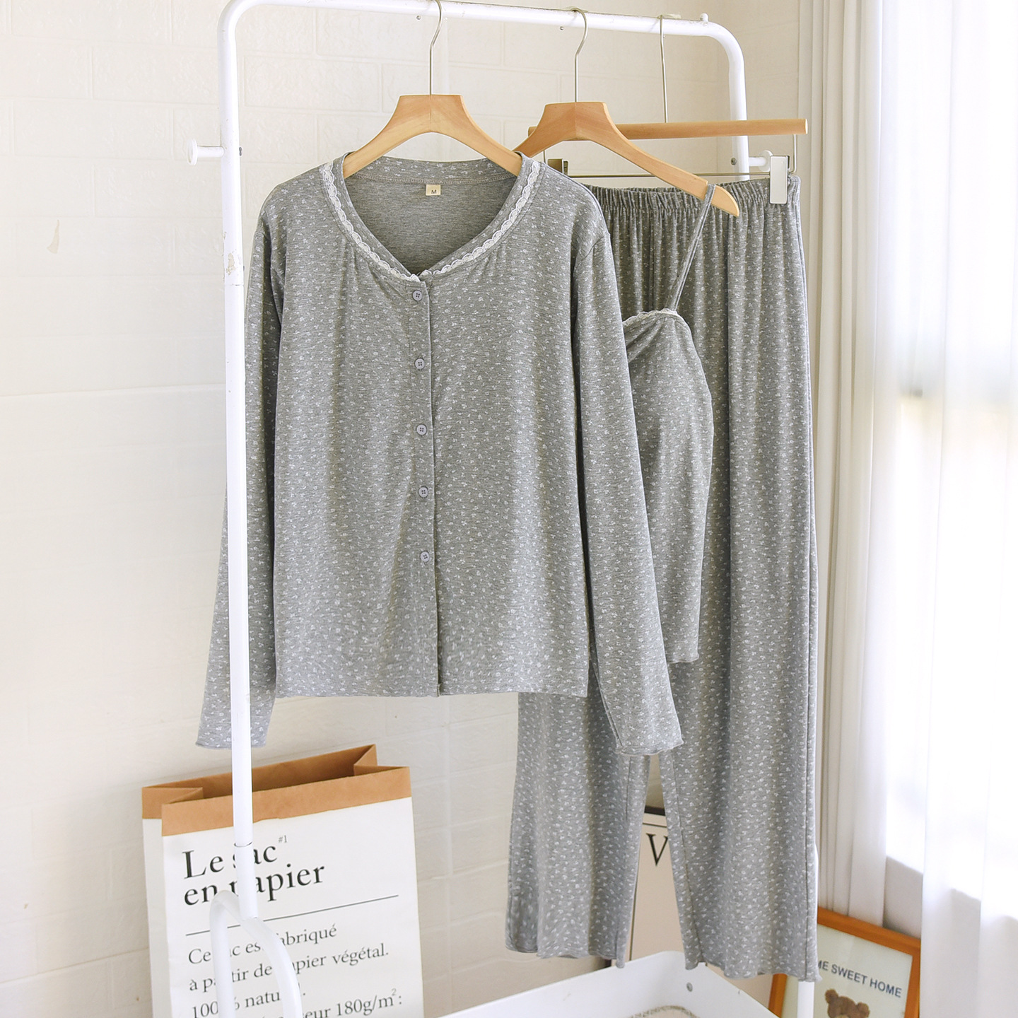 여성용 모달 잠옷 봄 여름용 가슴 패드와 끈이 있는 긴팔 3피스 세트, 소녀들을 위한 부드러운 꽃무늬 홈웨어 세트스토어 가기