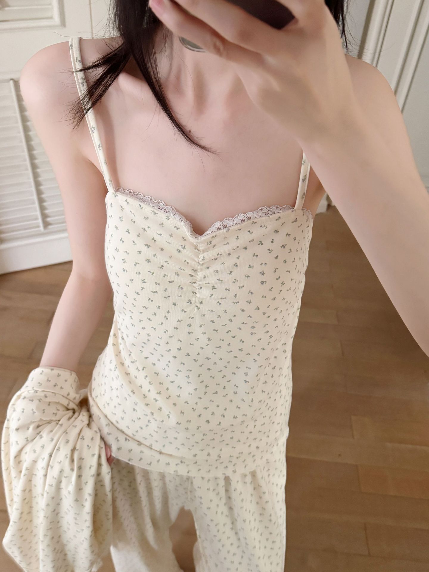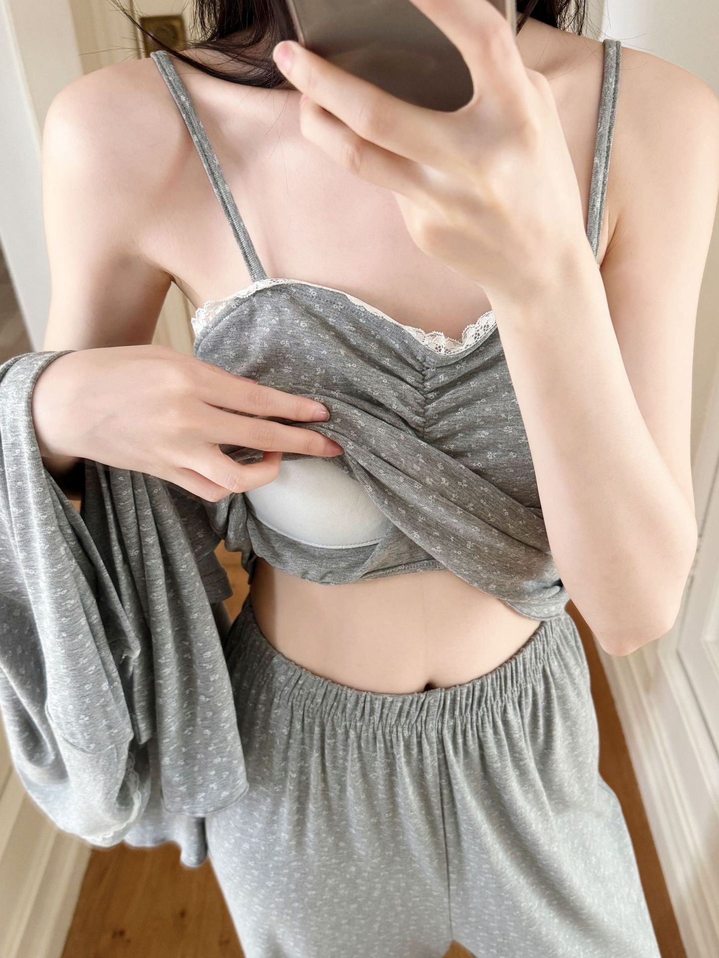 여성용 모달 잠옷 봄 여름용 가슴 패드와 끈이 있는 긴팔 3피스 세트, 소녀들을 위한 부드러운 꽃무늬 홈웨어 세트