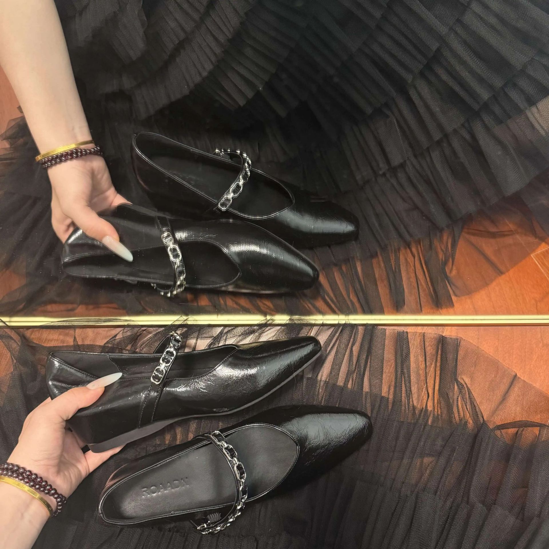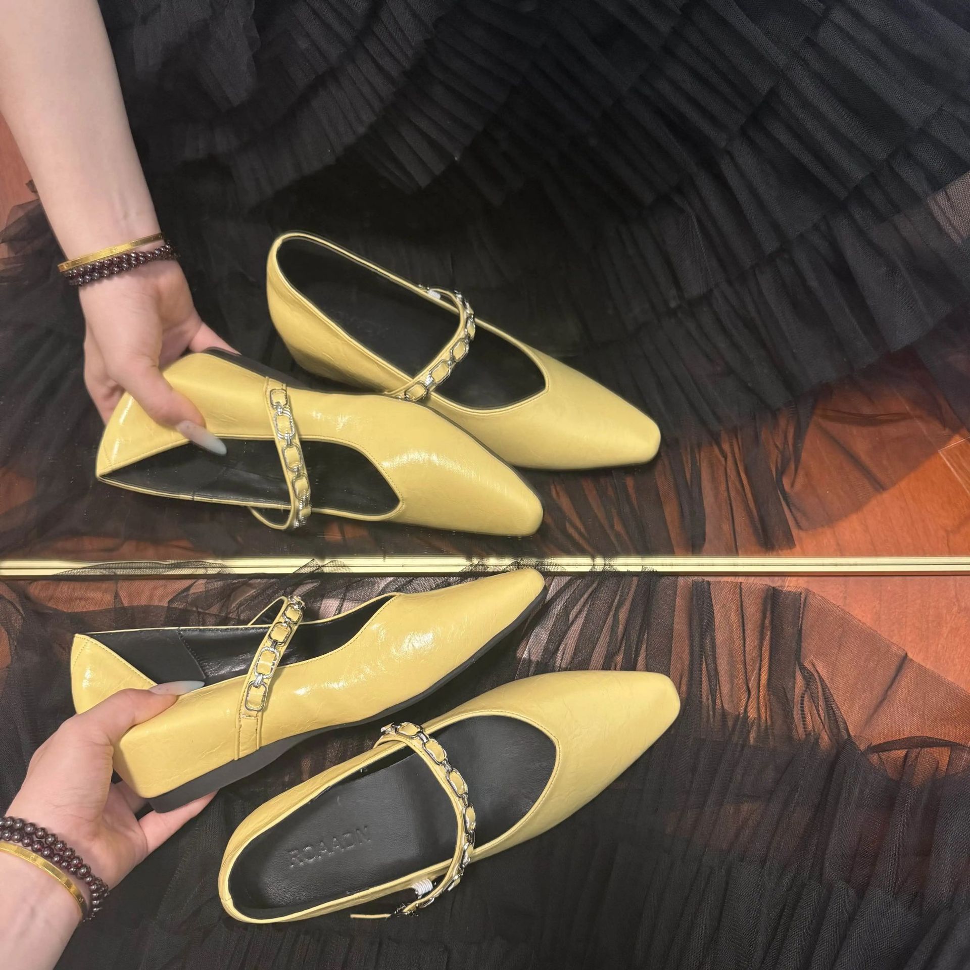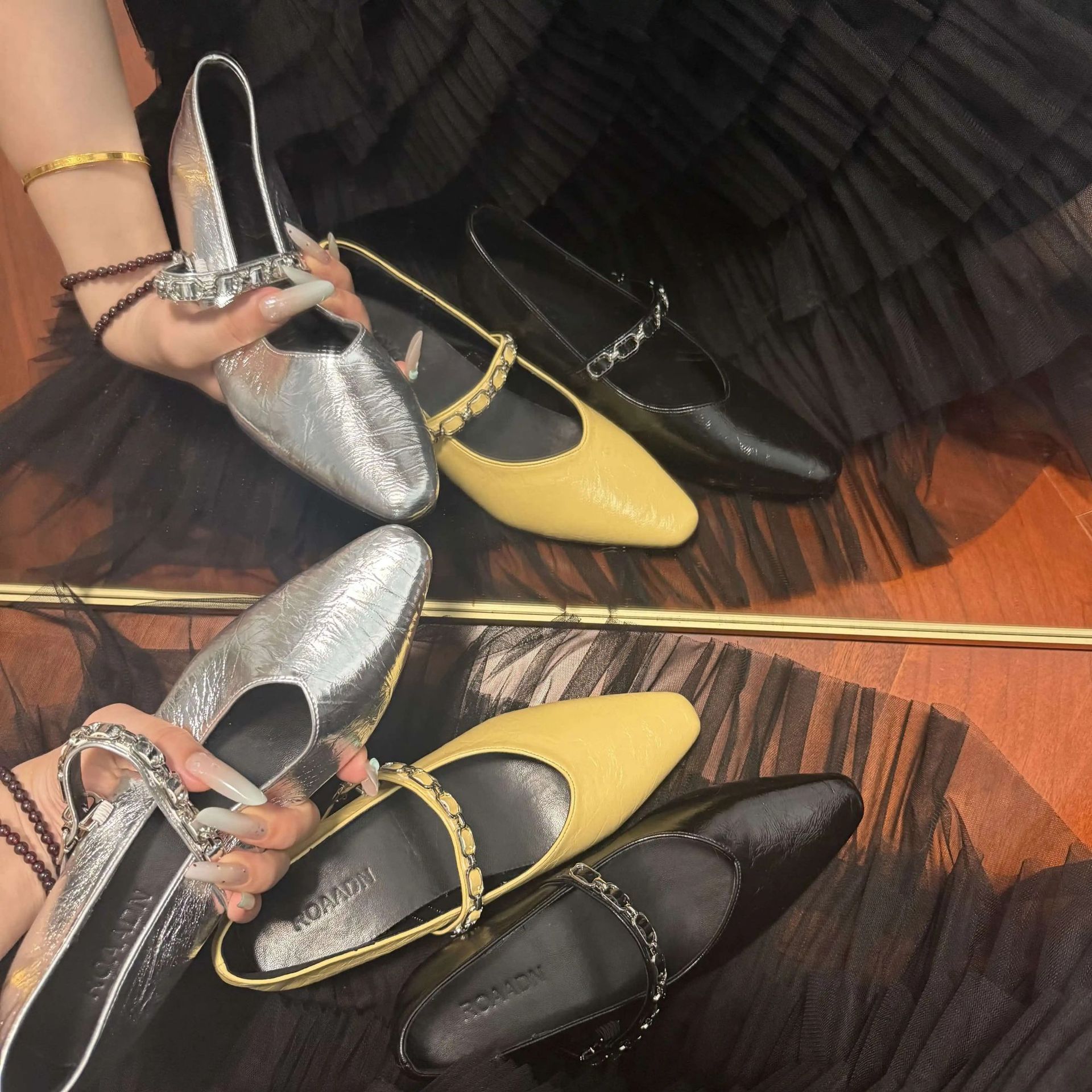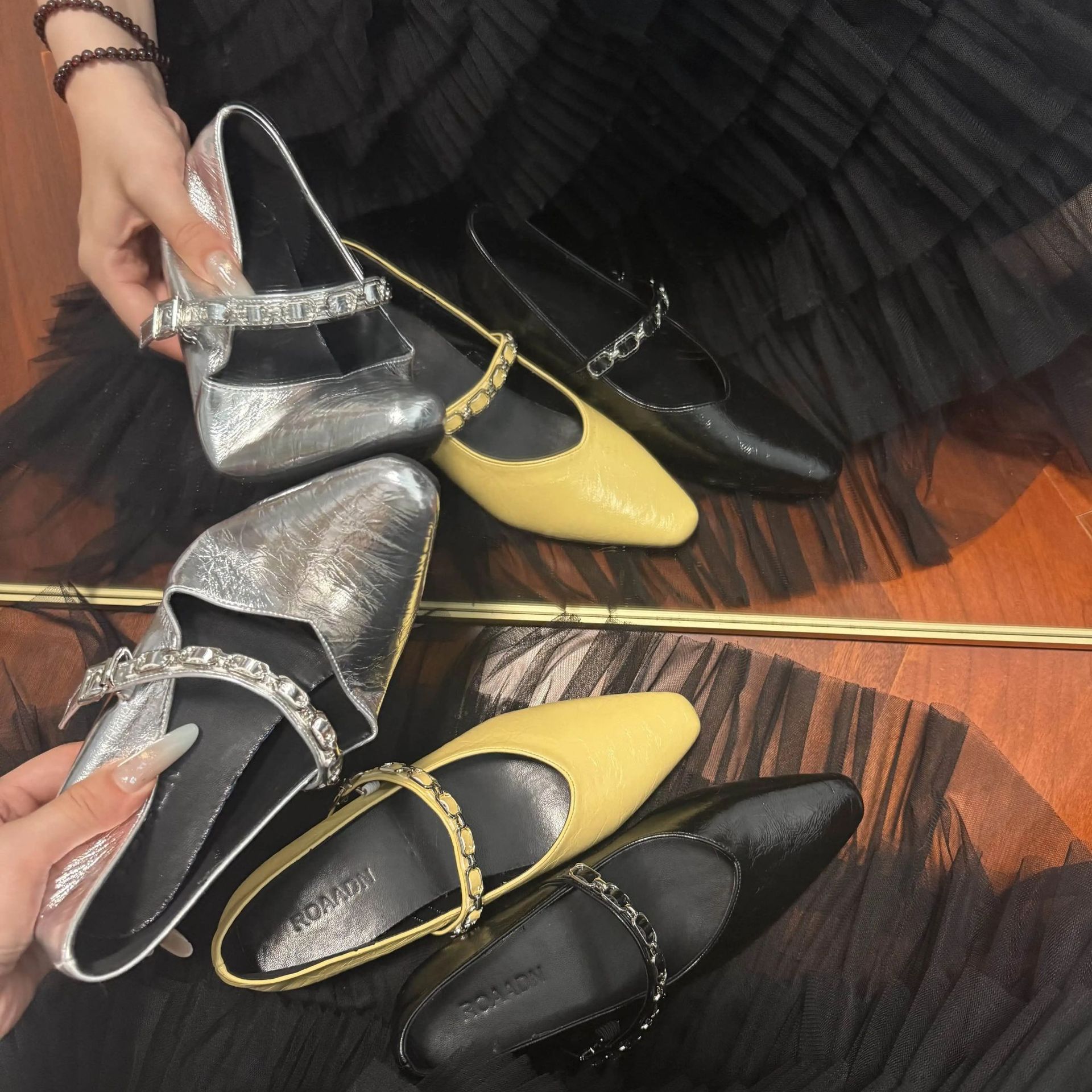 유럽 스탠드 부드러운 가죽 여성 신발 2025 봄과 가을 새로운 솔리드 컬러 금속 체인 버클 여성용 플랫 힐 신발스토어 가기