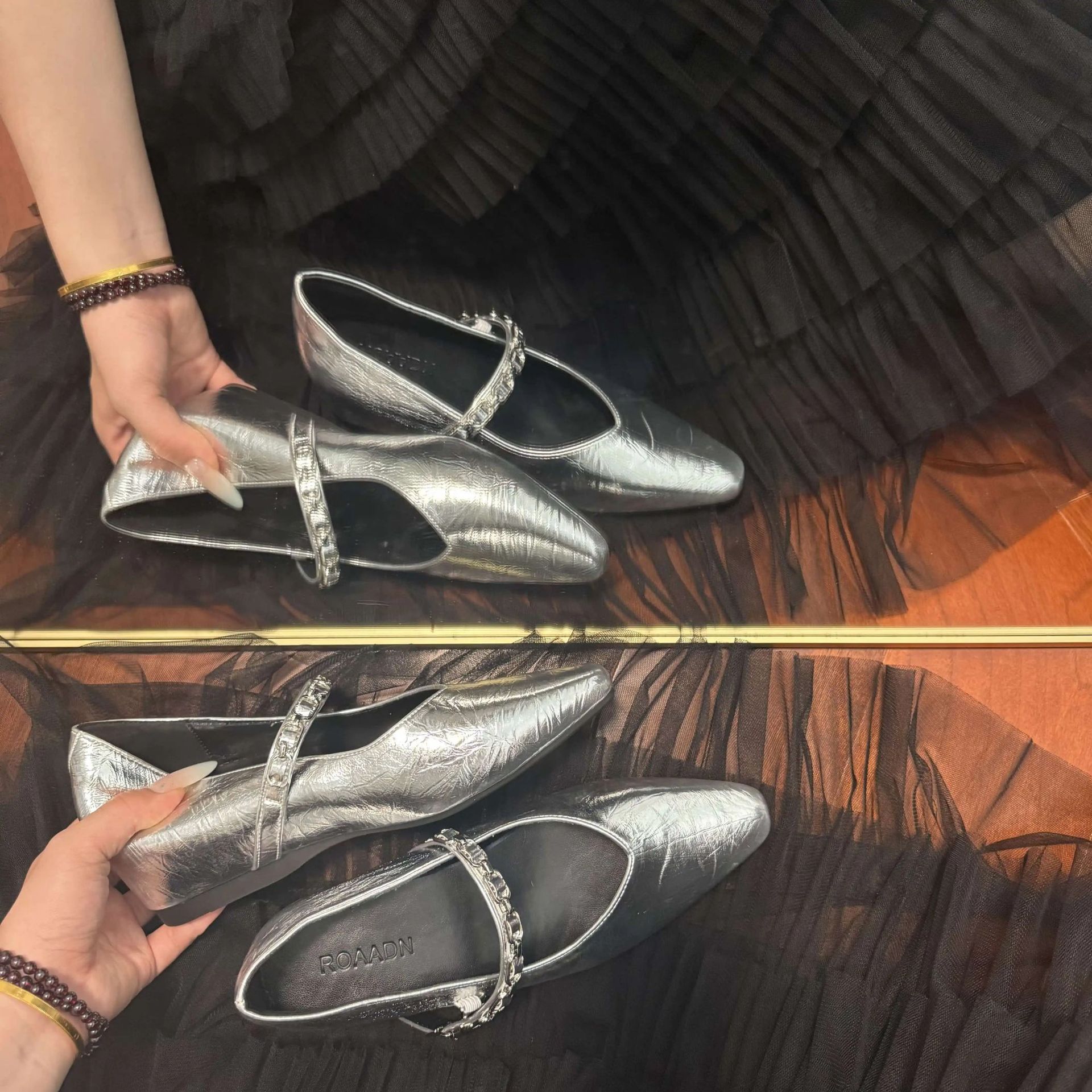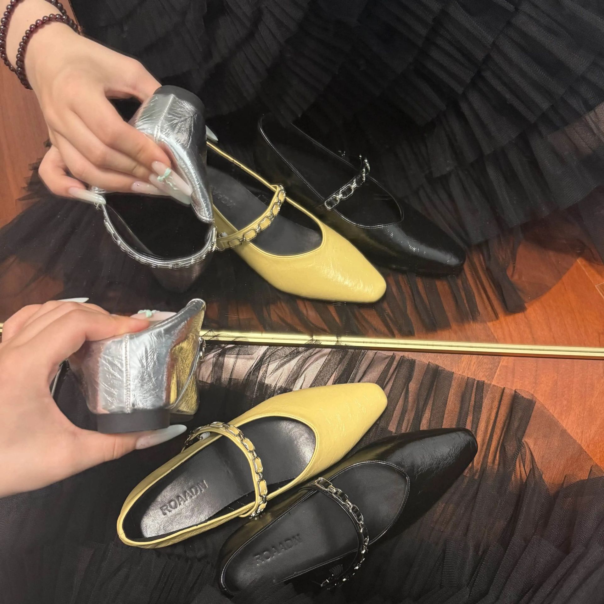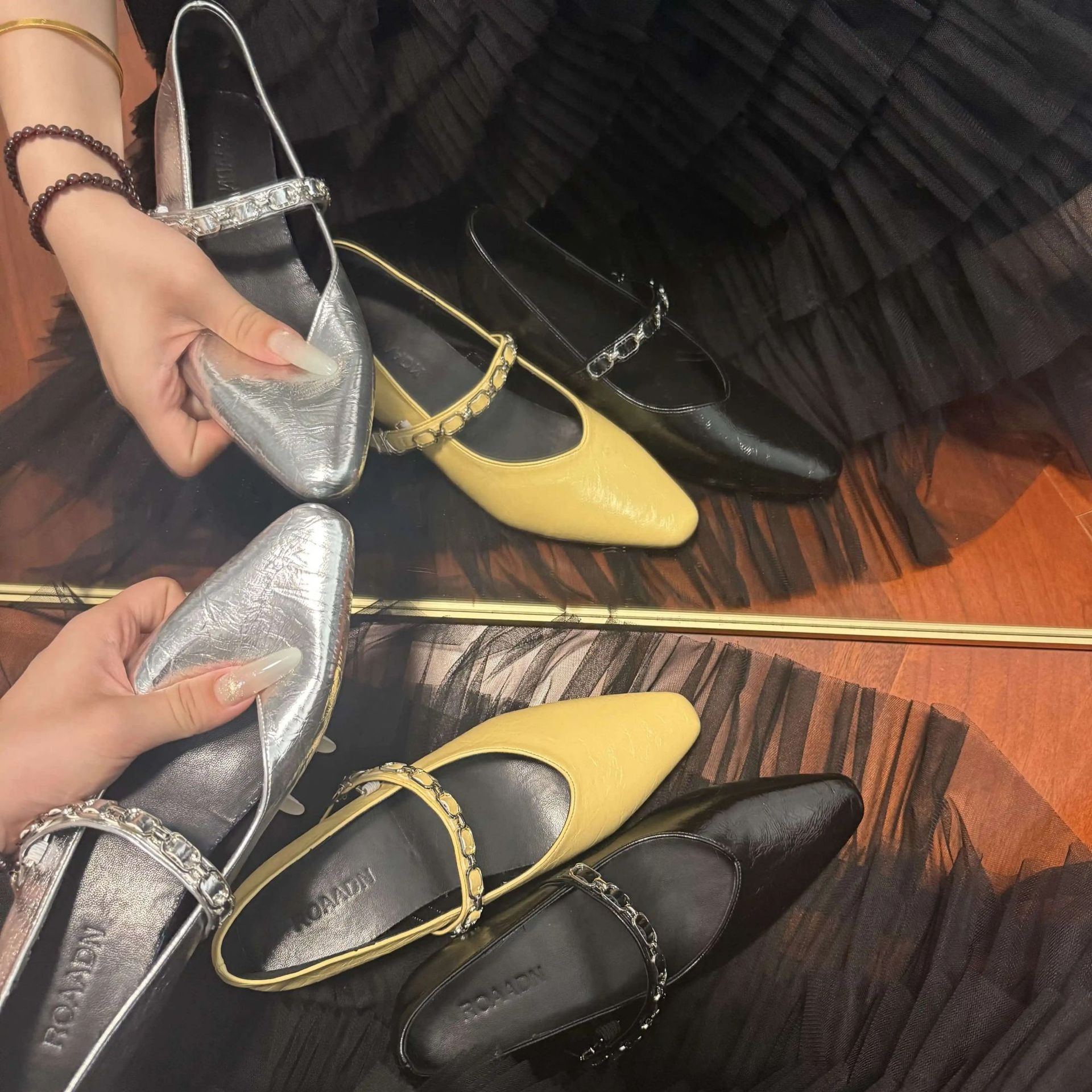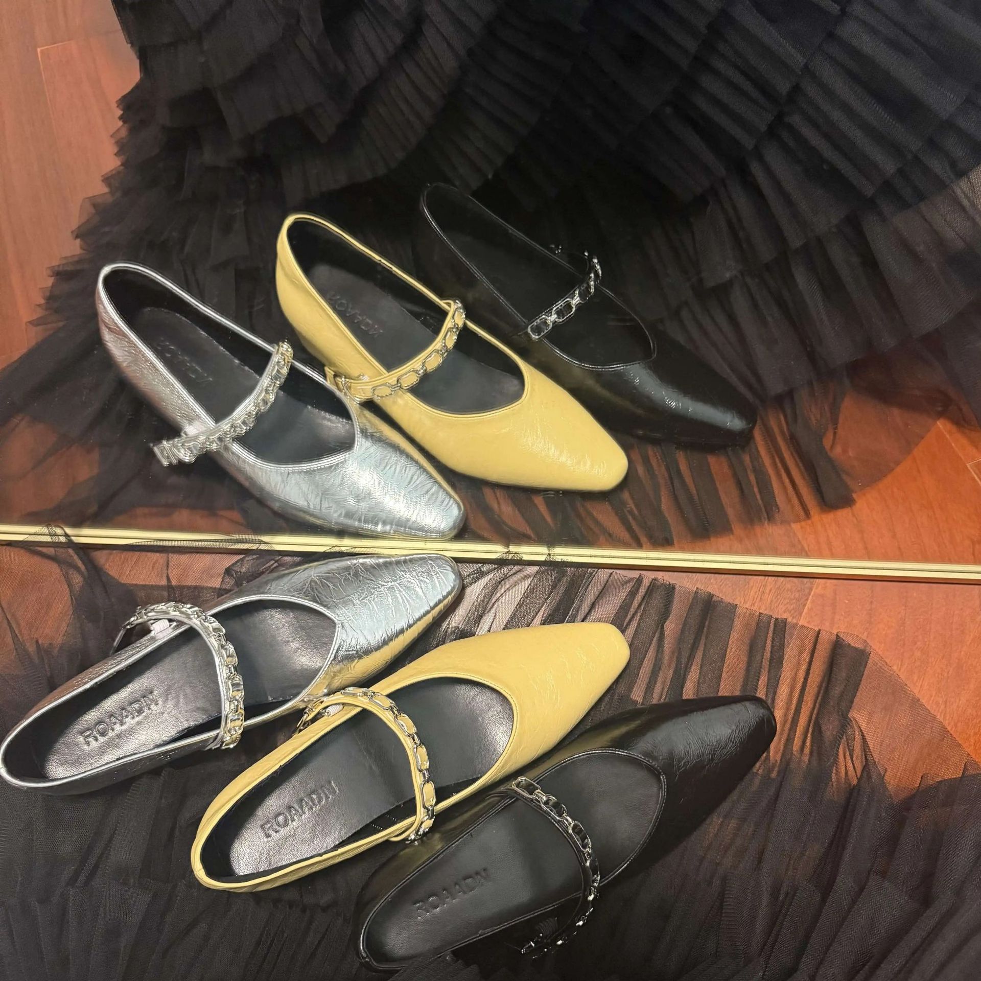 유럽 스탠드 부드러운 가죽 여성 신발 2025 봄과 가을 새로운 솔리드 컬러 금속 체인 버클 여성용 플랫 힐 신발스토어 가기