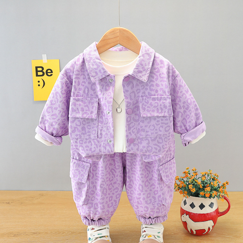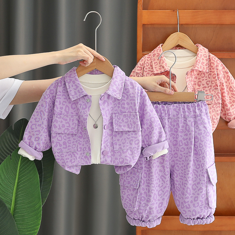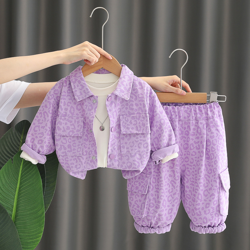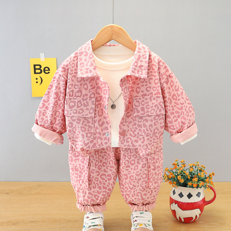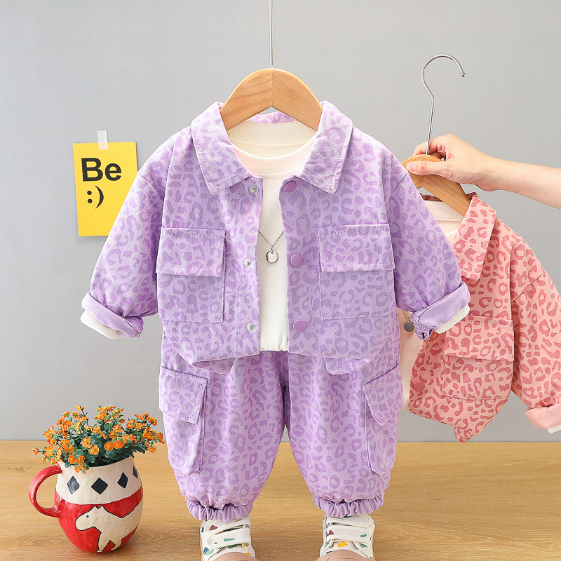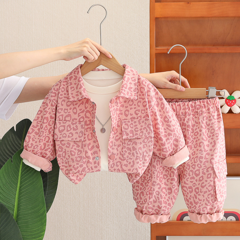 여자 가을 스타일 카디건 정장 2025 봄, 가을 새로운 스타일 여자 아기 표범 무늬 옷깃 재킷 3 피스 유행 세트스토어 가기