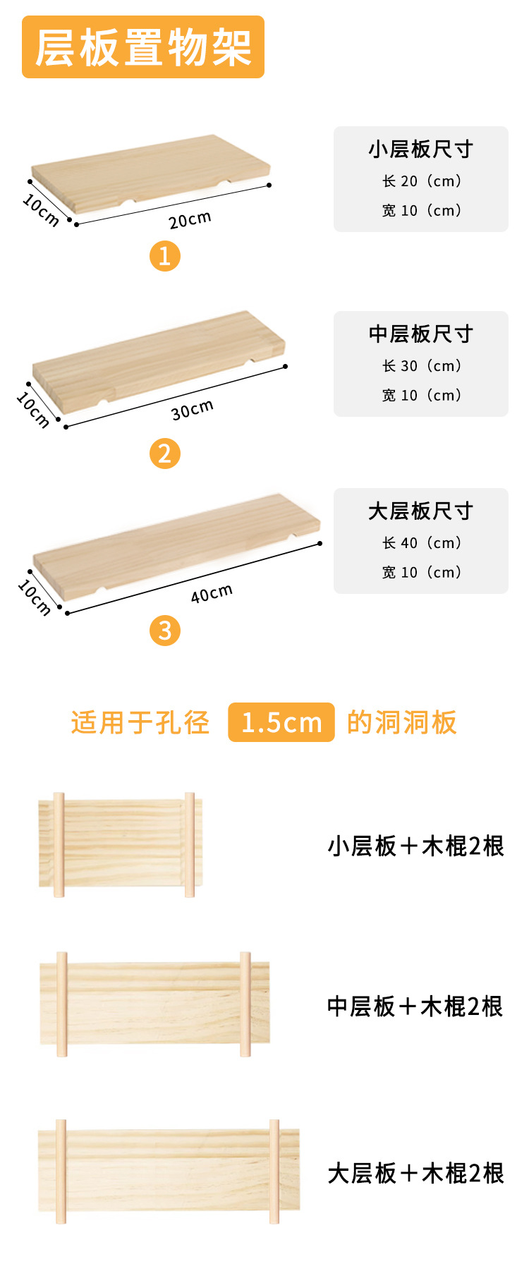 홀 보드 액세서리, 대형 성냥 막대, 둥근 구멍, 나무 막대, 칸막이, 랙, 후크, 펜던트, 목재 보관함