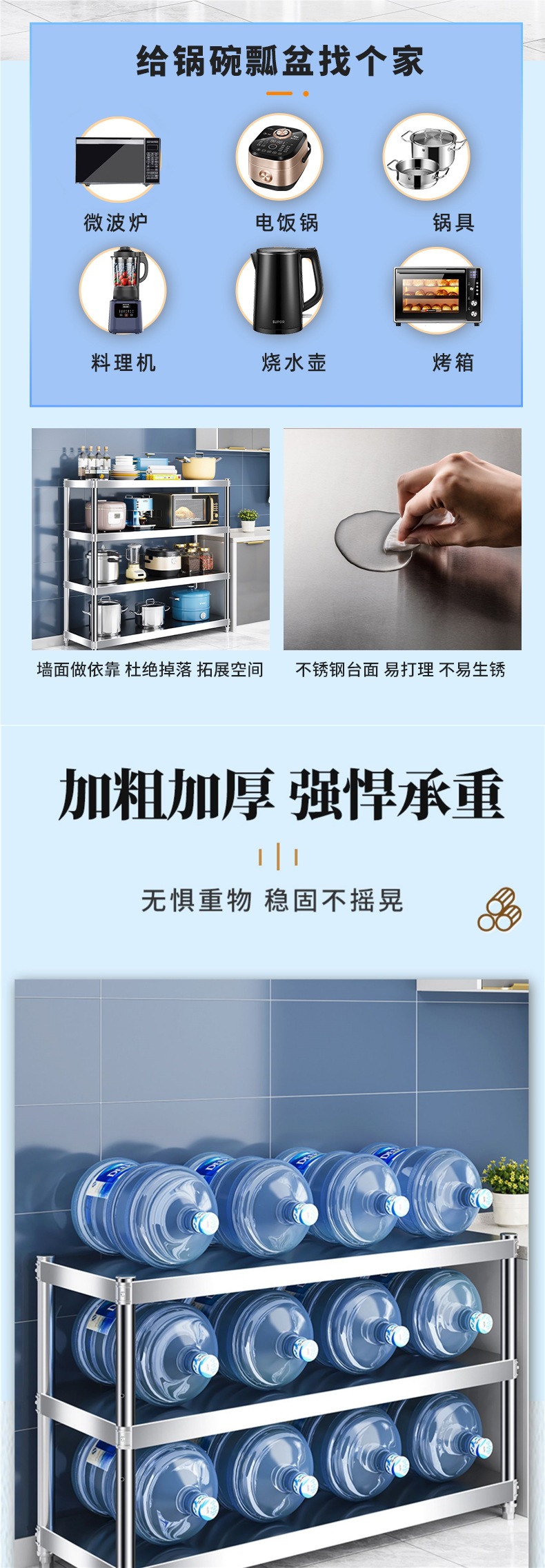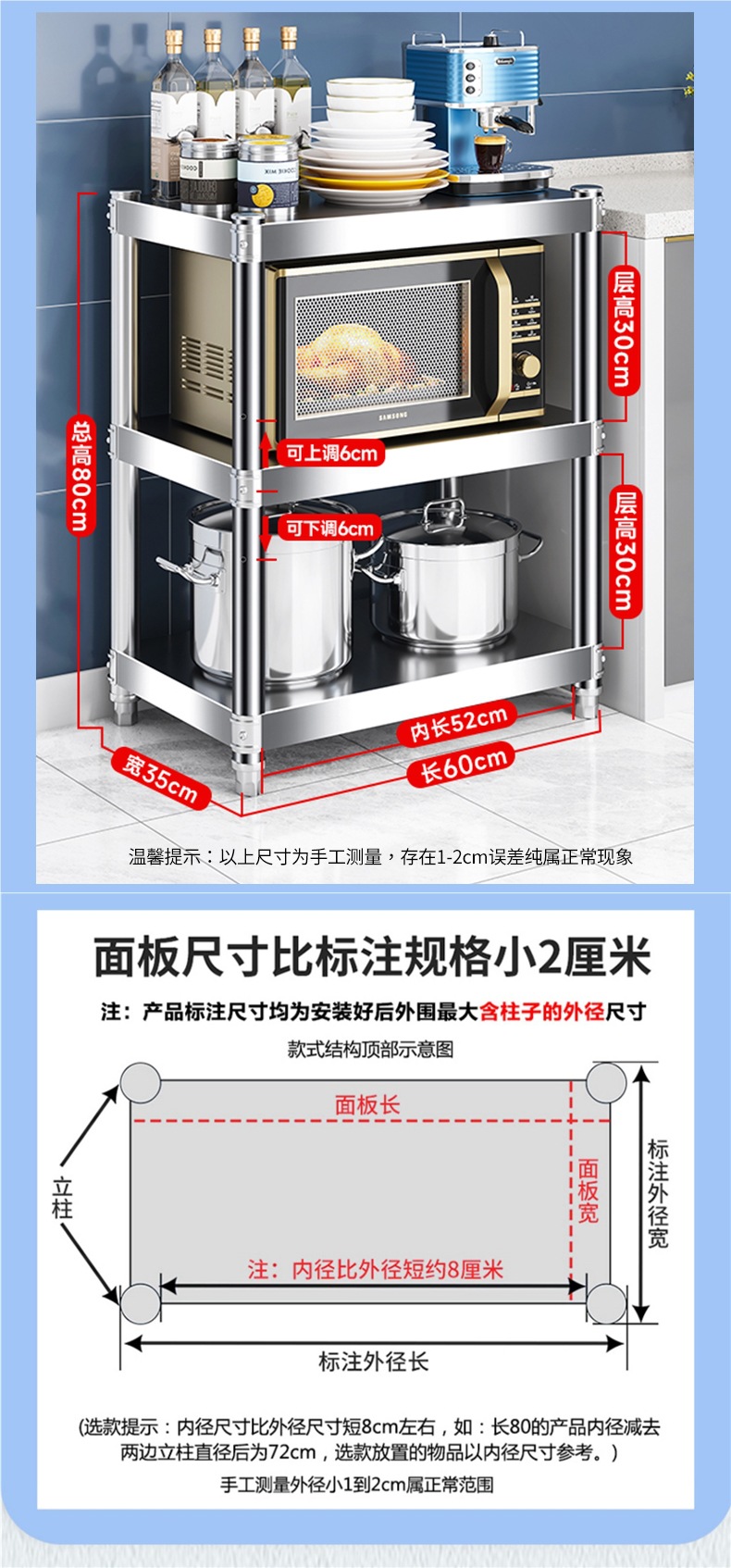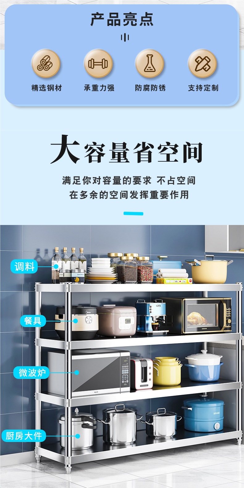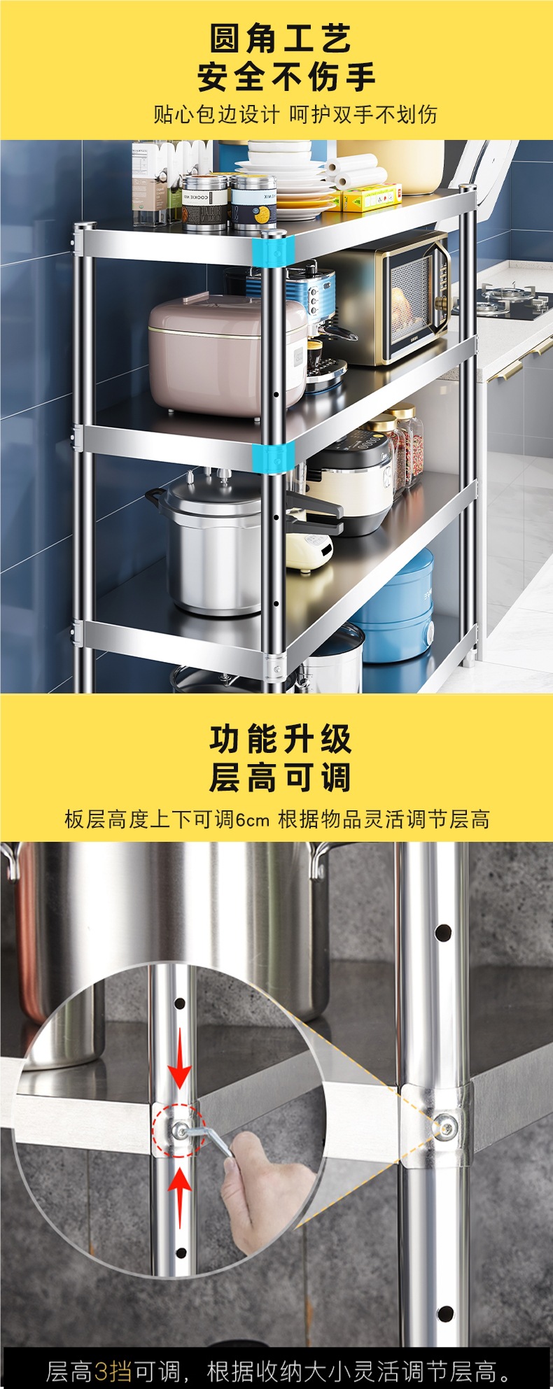 주방 랙 캐비닛 스테인레스 스틸 선반 캐비닛 다기능 스토리지 가정용 스토브 랙 바닥 스탠딩 전자 레인지 랙스토어 가기