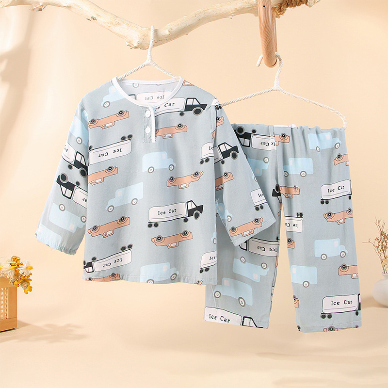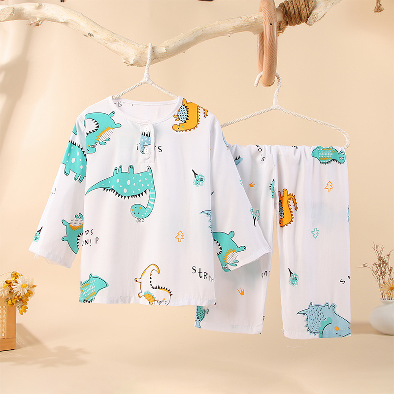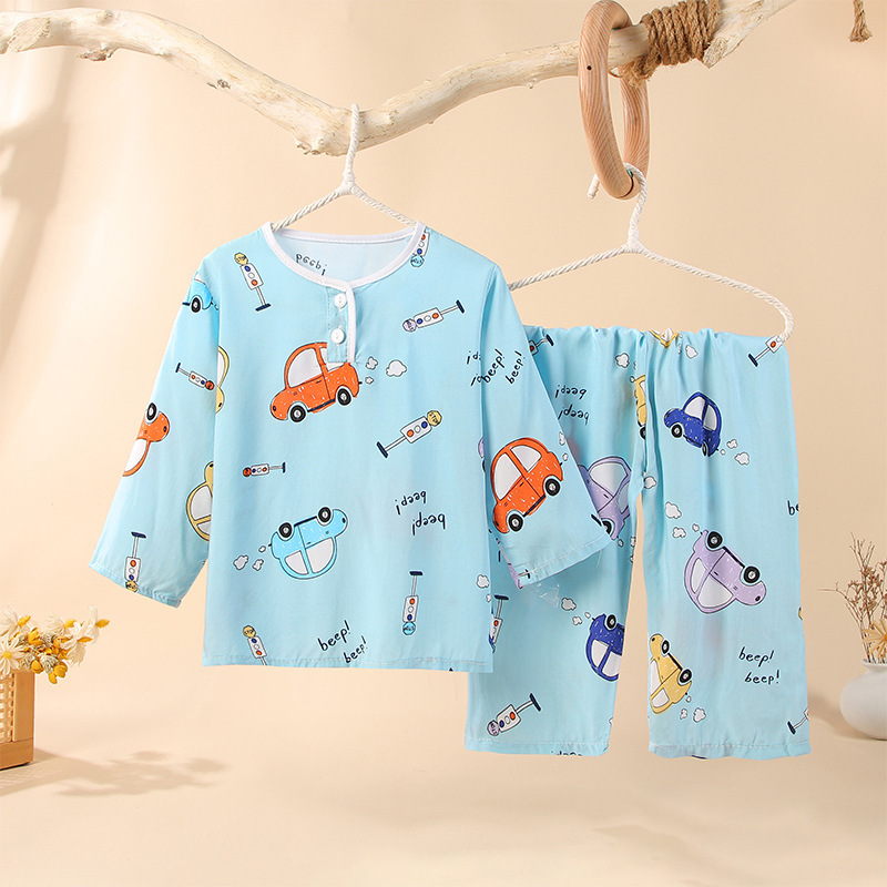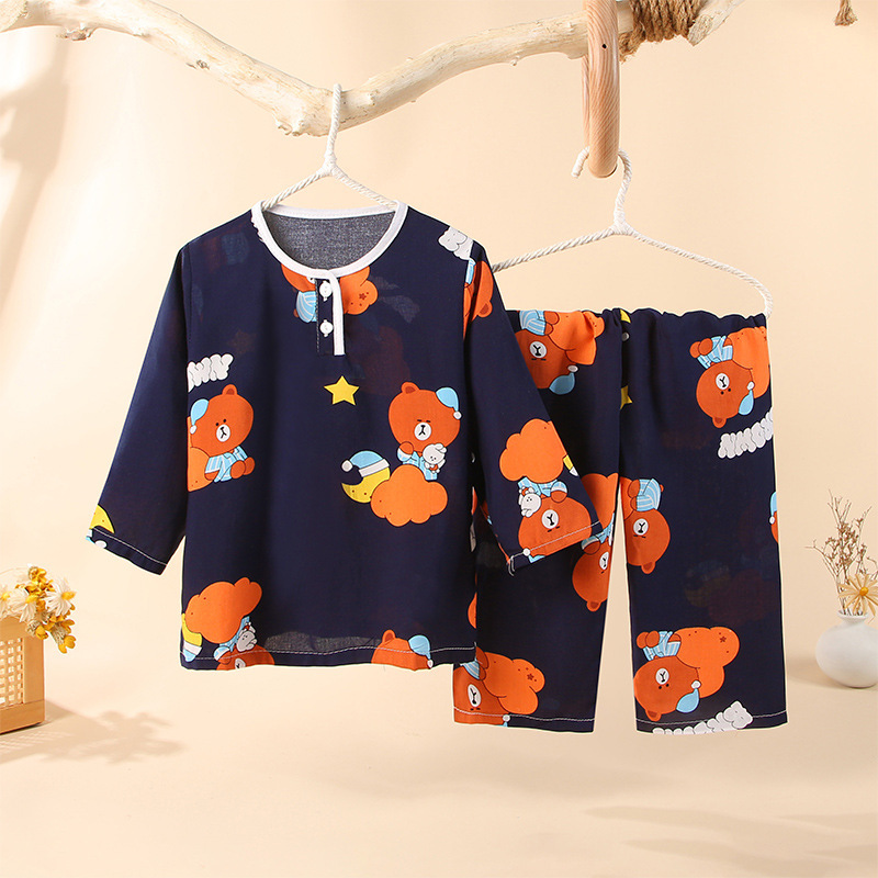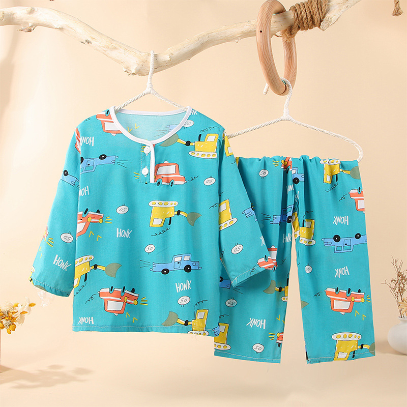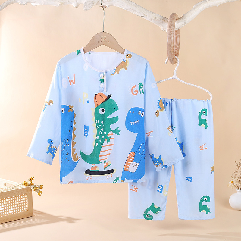 여름 면 실크 어린이 잠옷 소년과 소녀를위한 긴팔 얇은 면 실크 소녀 만화 가정 옷스토어 가기