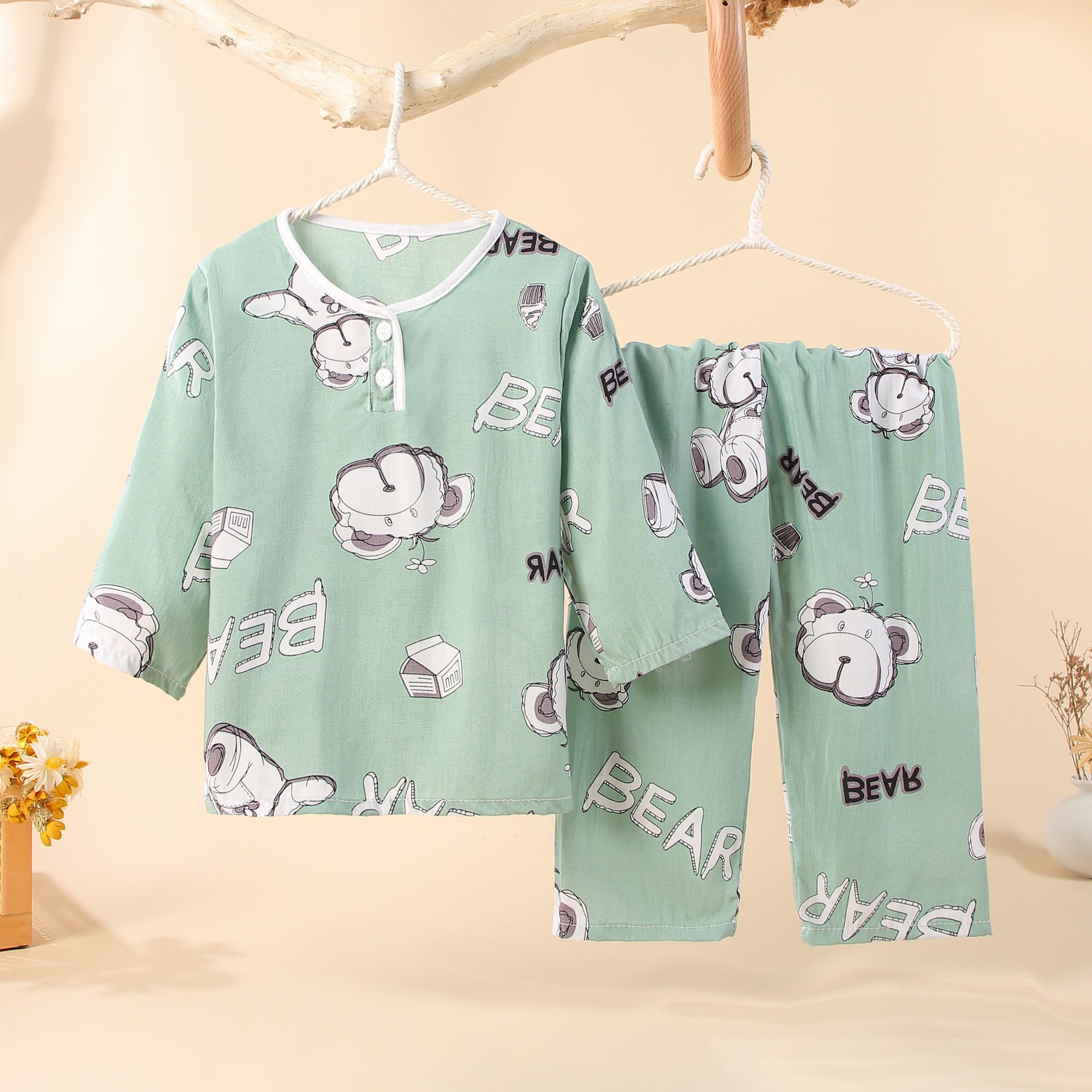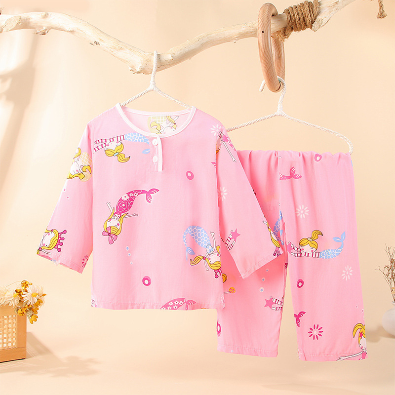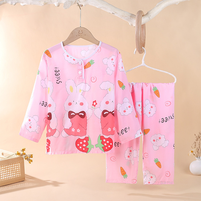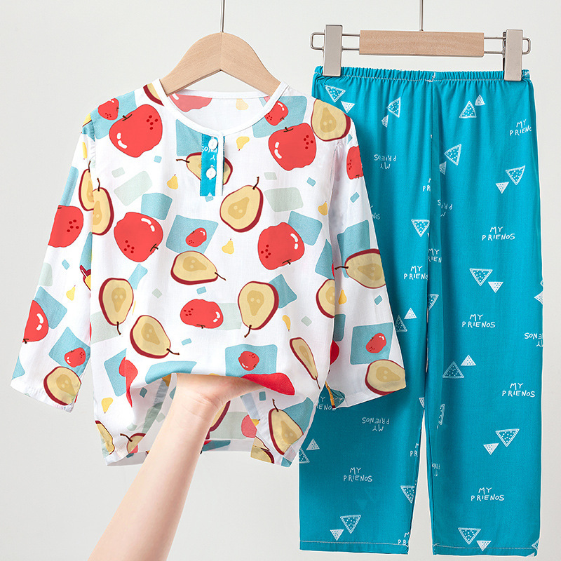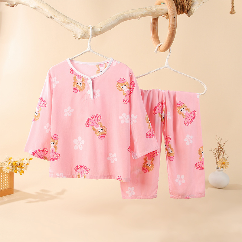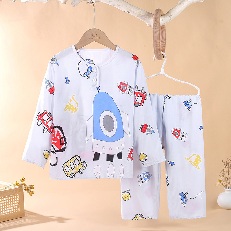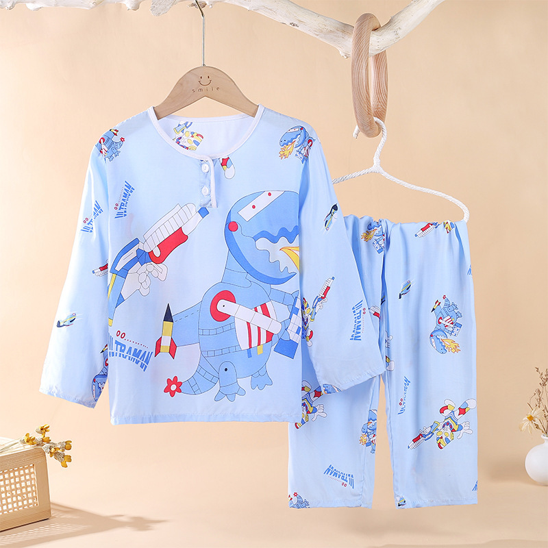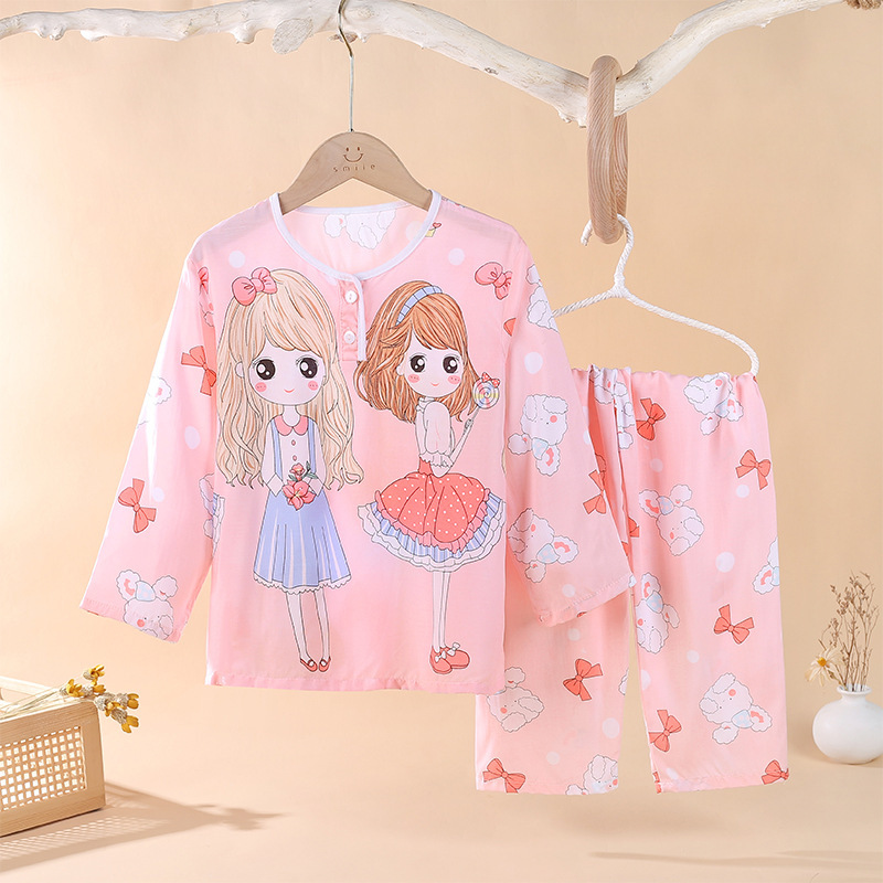 여름 면 실크 어린이 잠옷 소년과 소녀를위한 긴팔 얇은 면 실크 소녀 만화 가정 옷