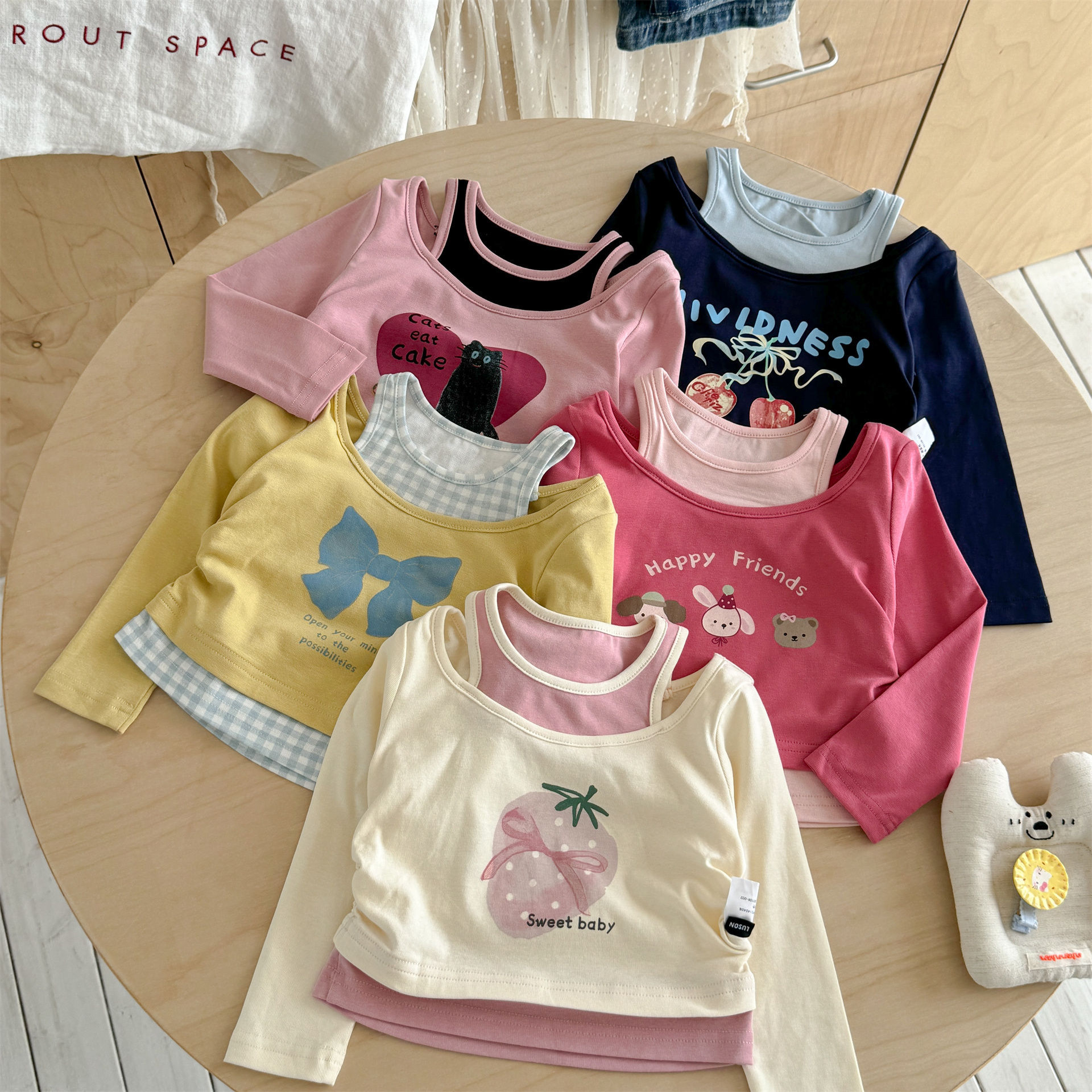 [핑크하우스] 한국 여자 봄, 가을 새로운 가짜 투피스 티셔츠 새로운 만화 작은 동물 프린트 귀여운스토어 가기