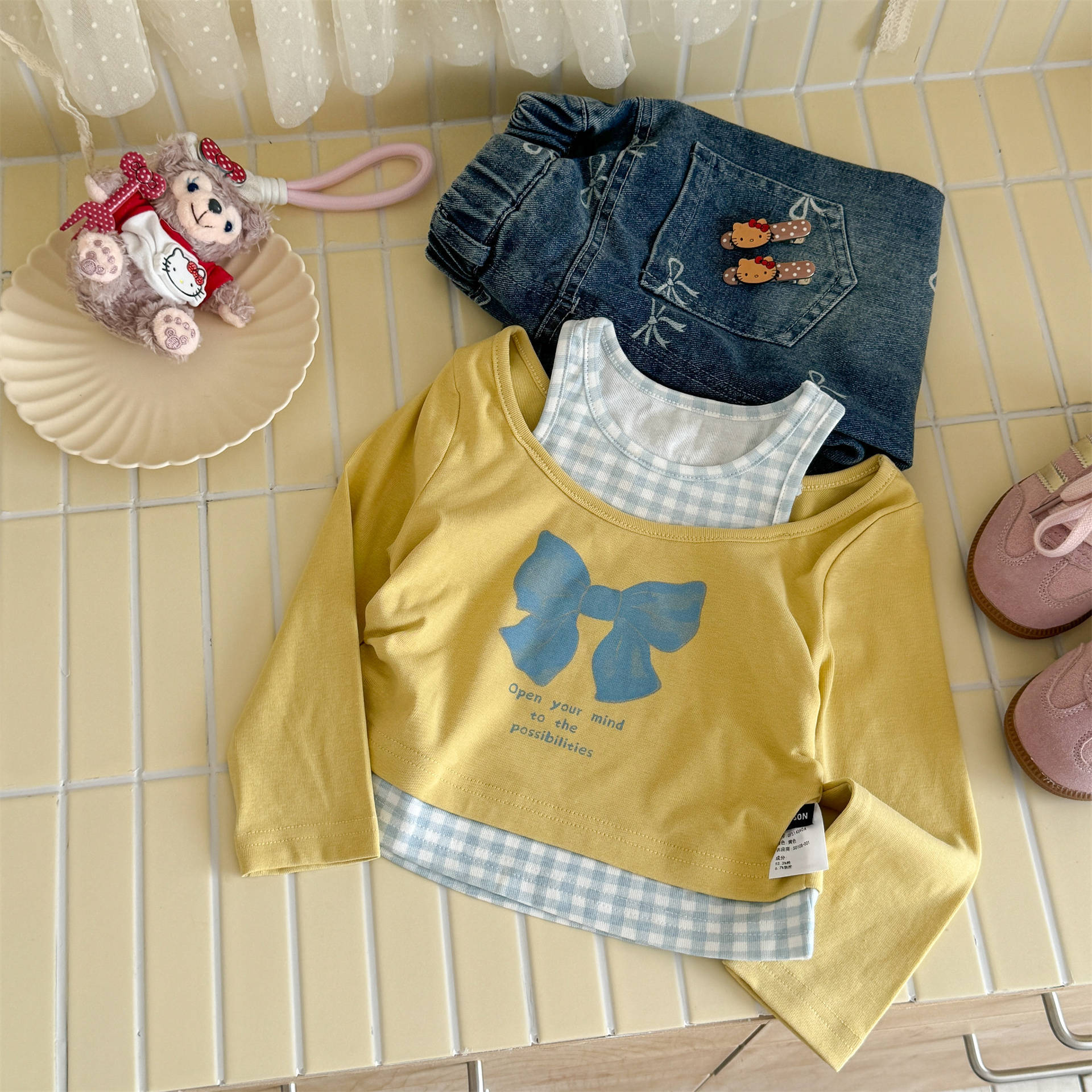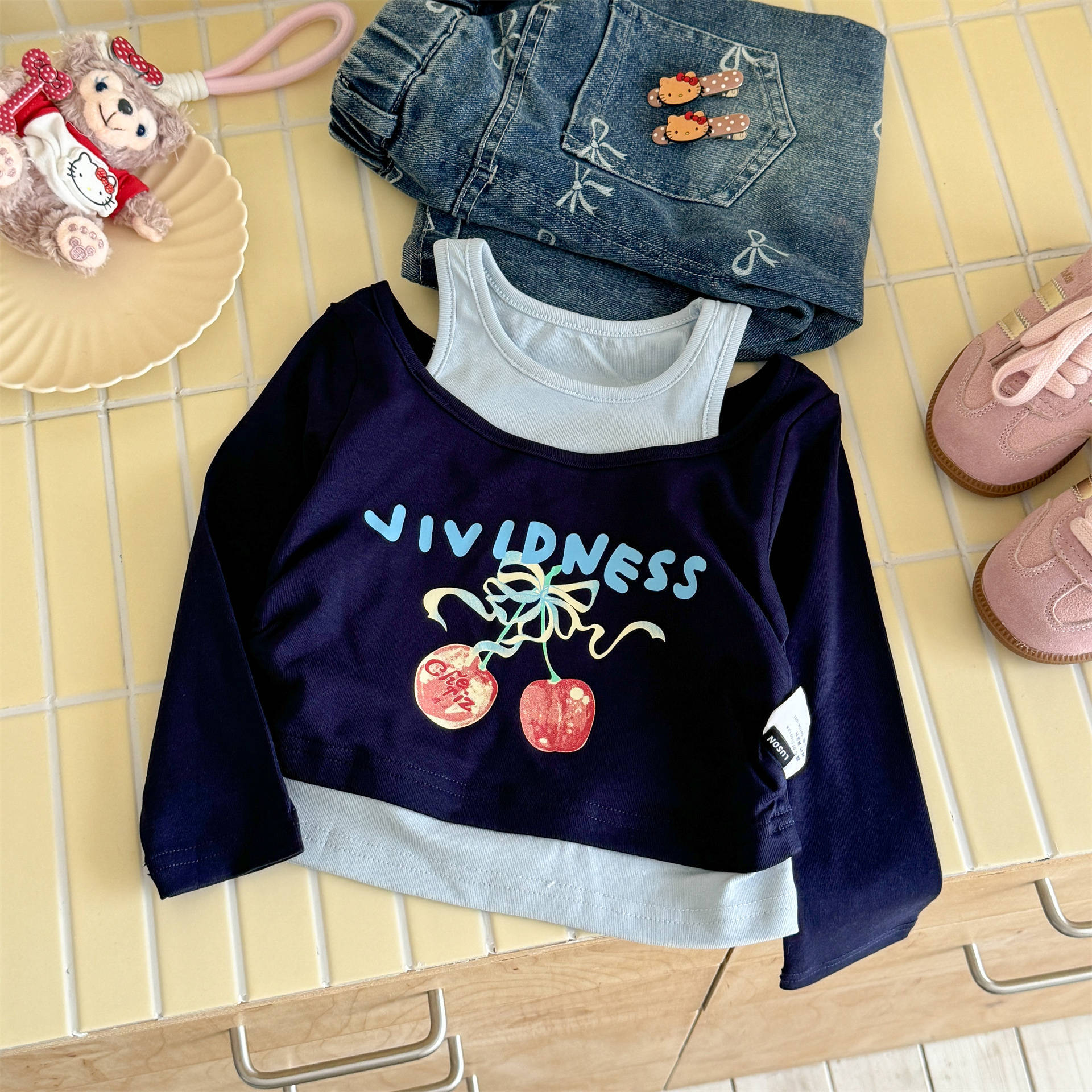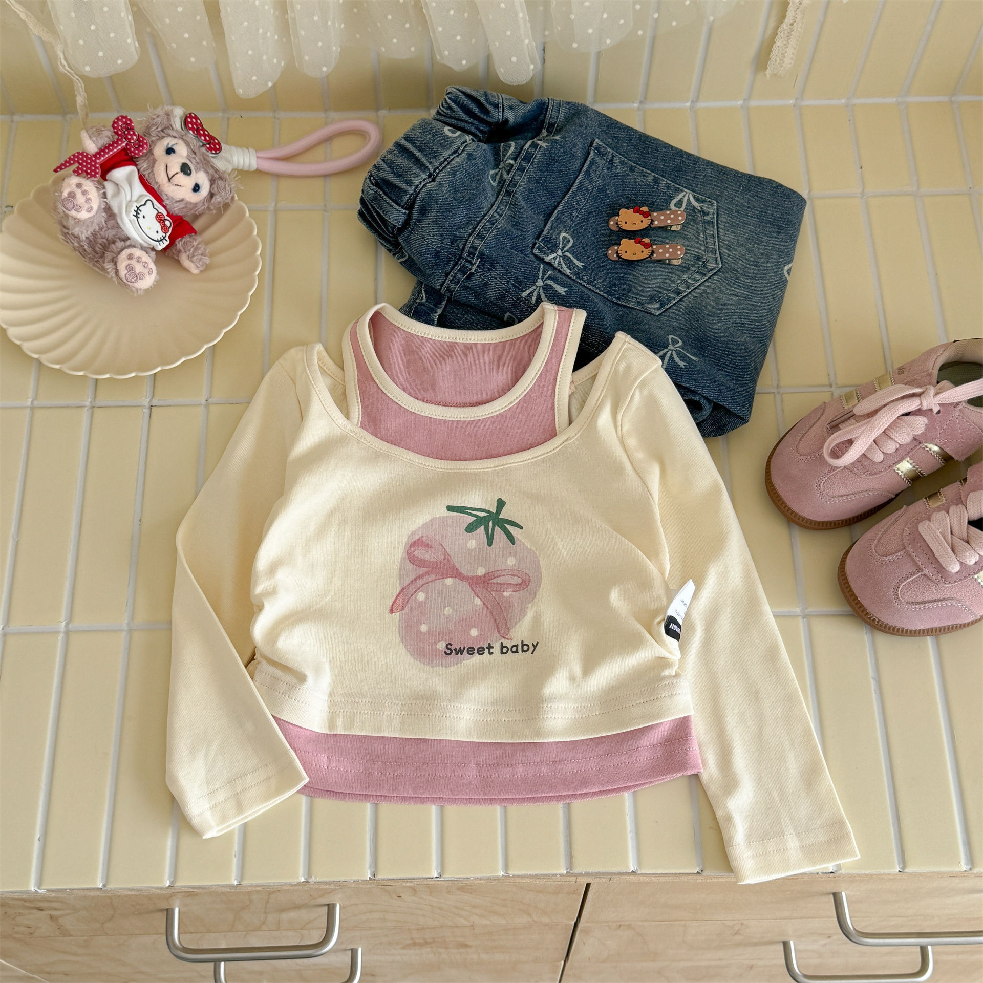 [핑크하우스] 한국 여자 봄, 가을 새로운 가짜 투피스 티셔츠 새로운 만화 작은 동물 프린트 귀여운
