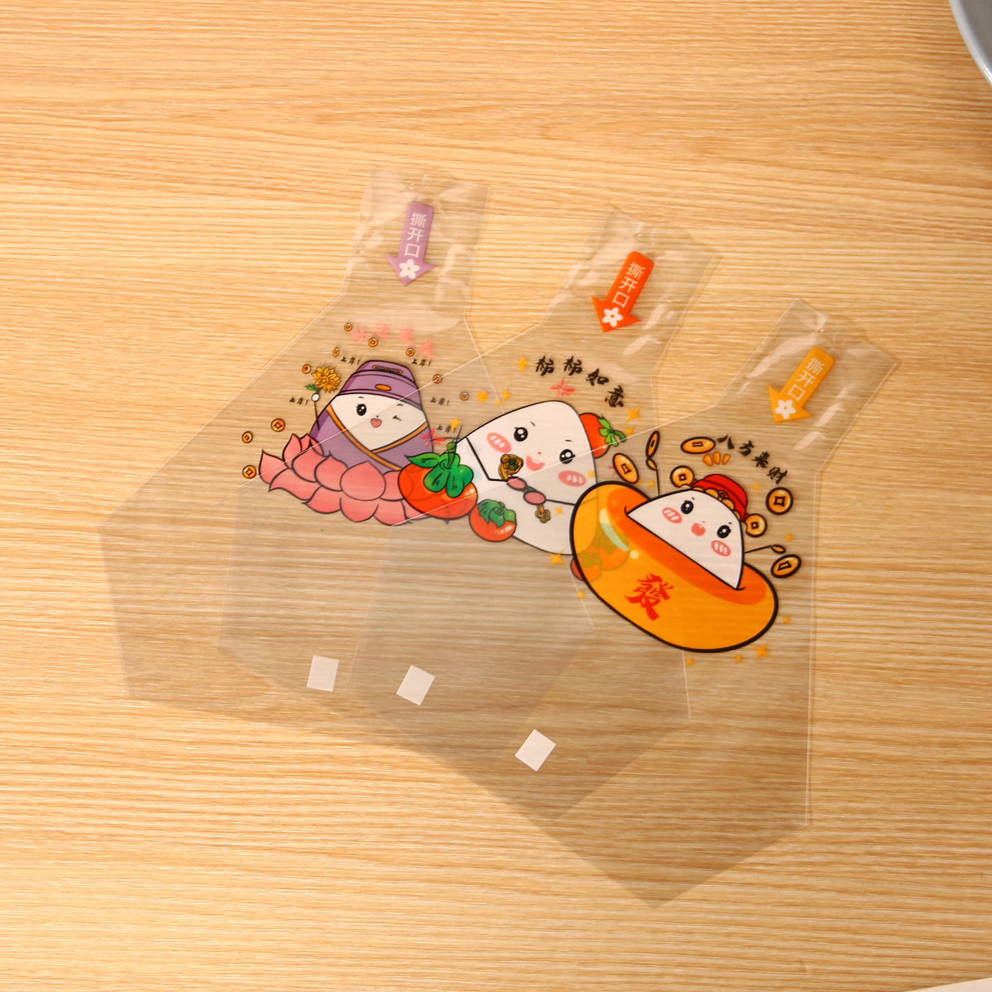 행운을 상징하는 무늬가 있는 삼각 주먹밥 포장봉투, 식품 등급, 쉽게 떼어낼 수 있는 디자인, 바닥이 사각형인 비닐봉투