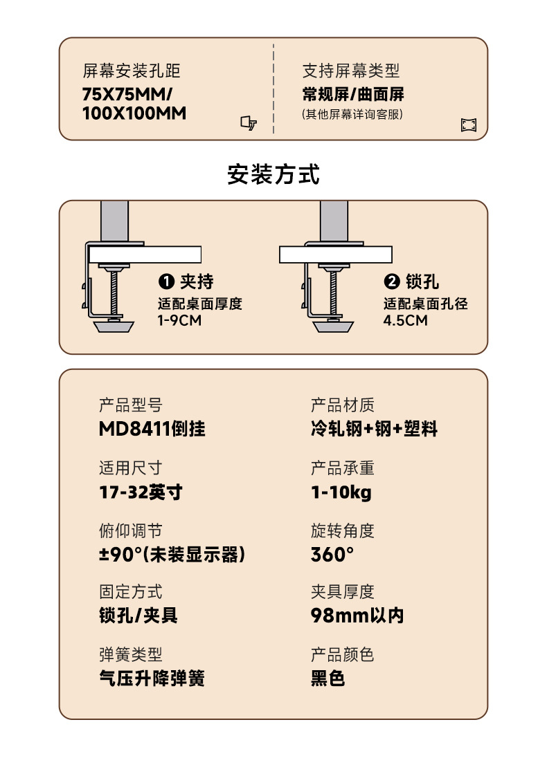 • 듀얼 스크린 로봇 팔 + 노트북 트레이, 플립업/설치 가능, 모니터 17-32inch 대, 노트북 10-17inch 대, 내하중 10KG