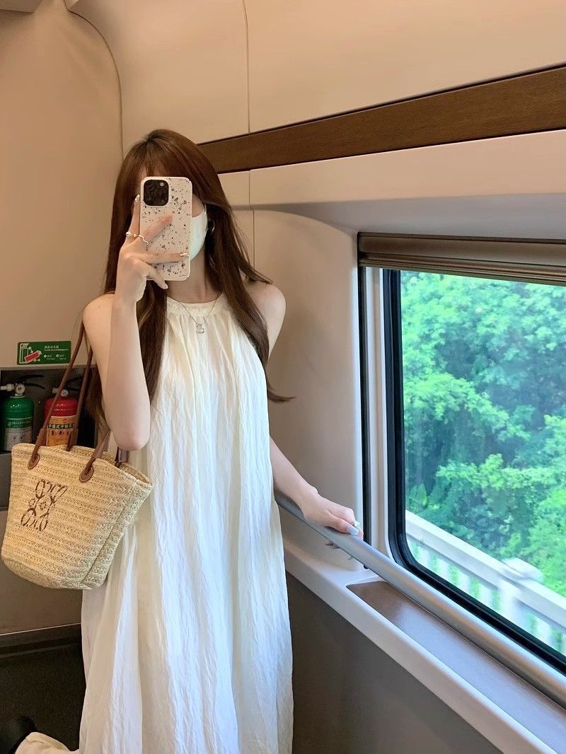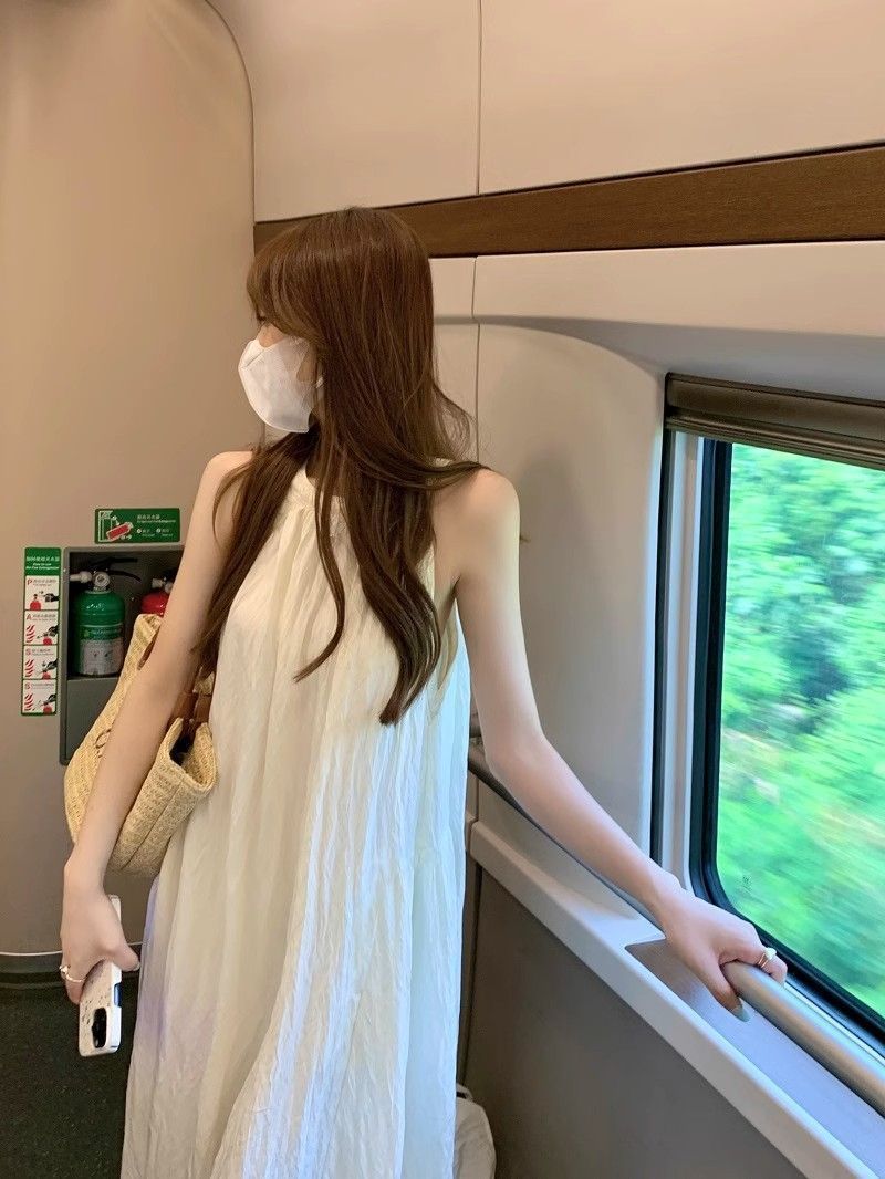 프렌치 홀터넥 드레스, 요정 여름 루즈하고 슬림한 새로운 스타일의 민소매 달콤한 기질 해변 휴가 롱 스커트