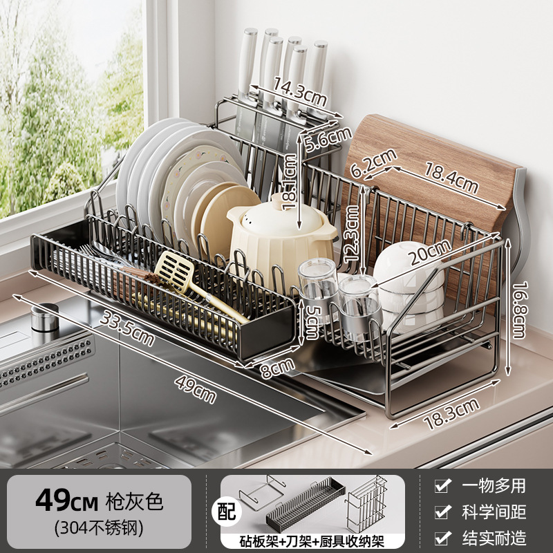 • 건메탈 스테인리스 식기 건조대 [메인 선반 + 컵걸이 + 칼꽂이 + 수저통 + 도마 거치대]