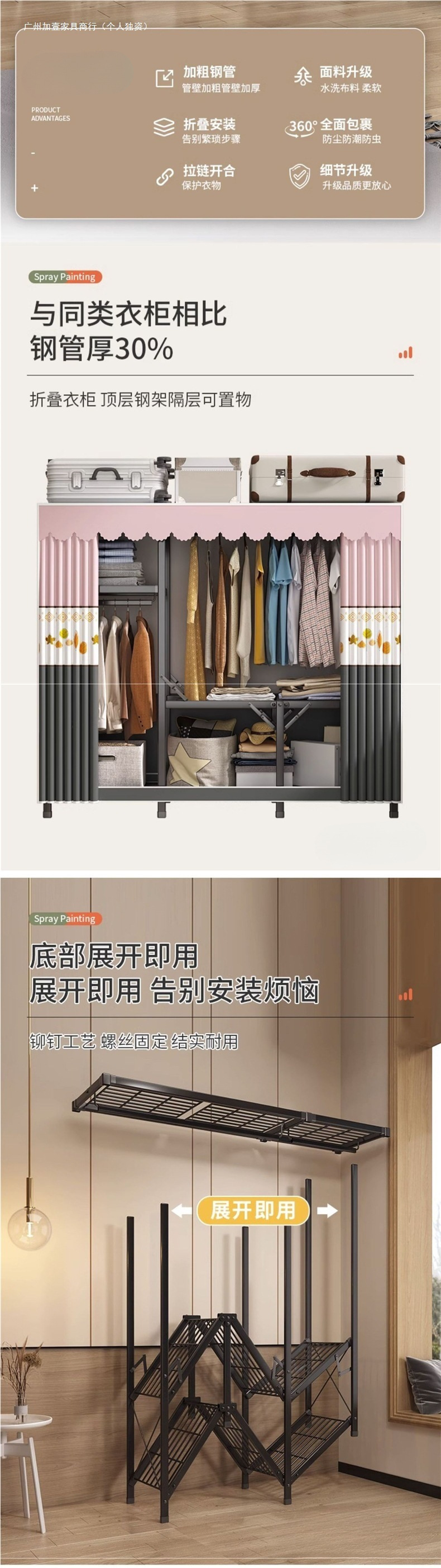 강철 프레임 간단한 옷장 가정용 임대 접이식 침실 내구성 설치가 필요없는 전체 천 옷장 작은 아파트스토어 가기