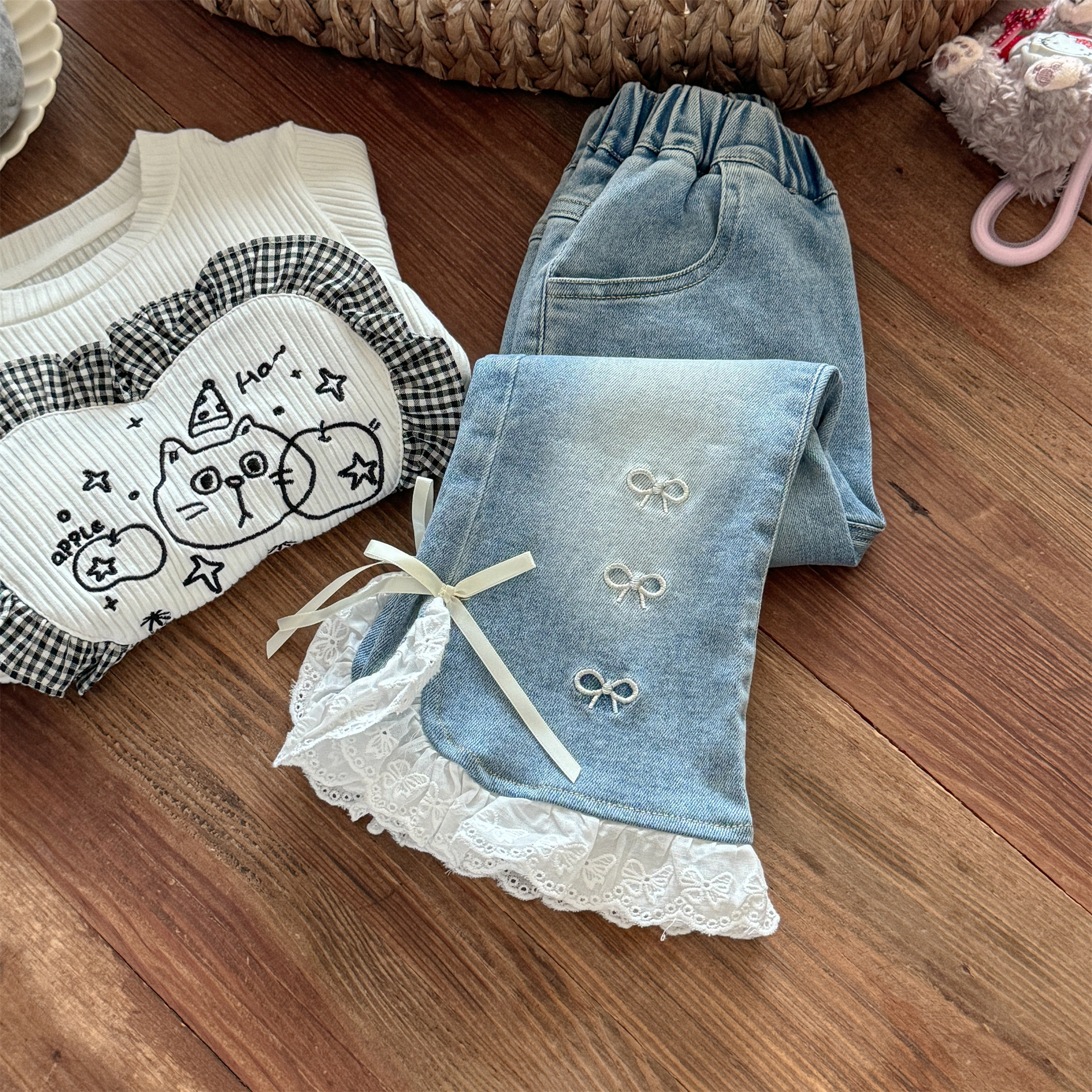 Little Salted Lemon 아기 소녀 레이스 슬릿 청바지 봄과 가을 새로운 스타일 어린 소녀 달콤하고 세련된 벨 바닥 바지