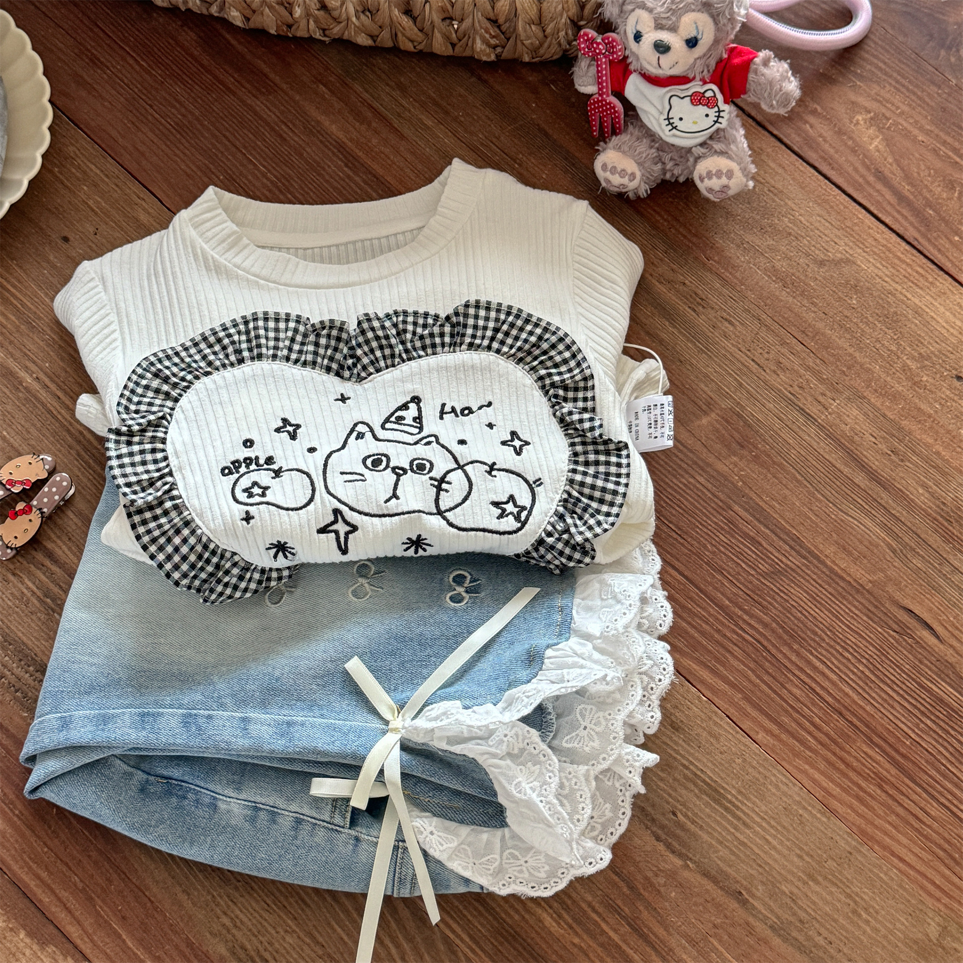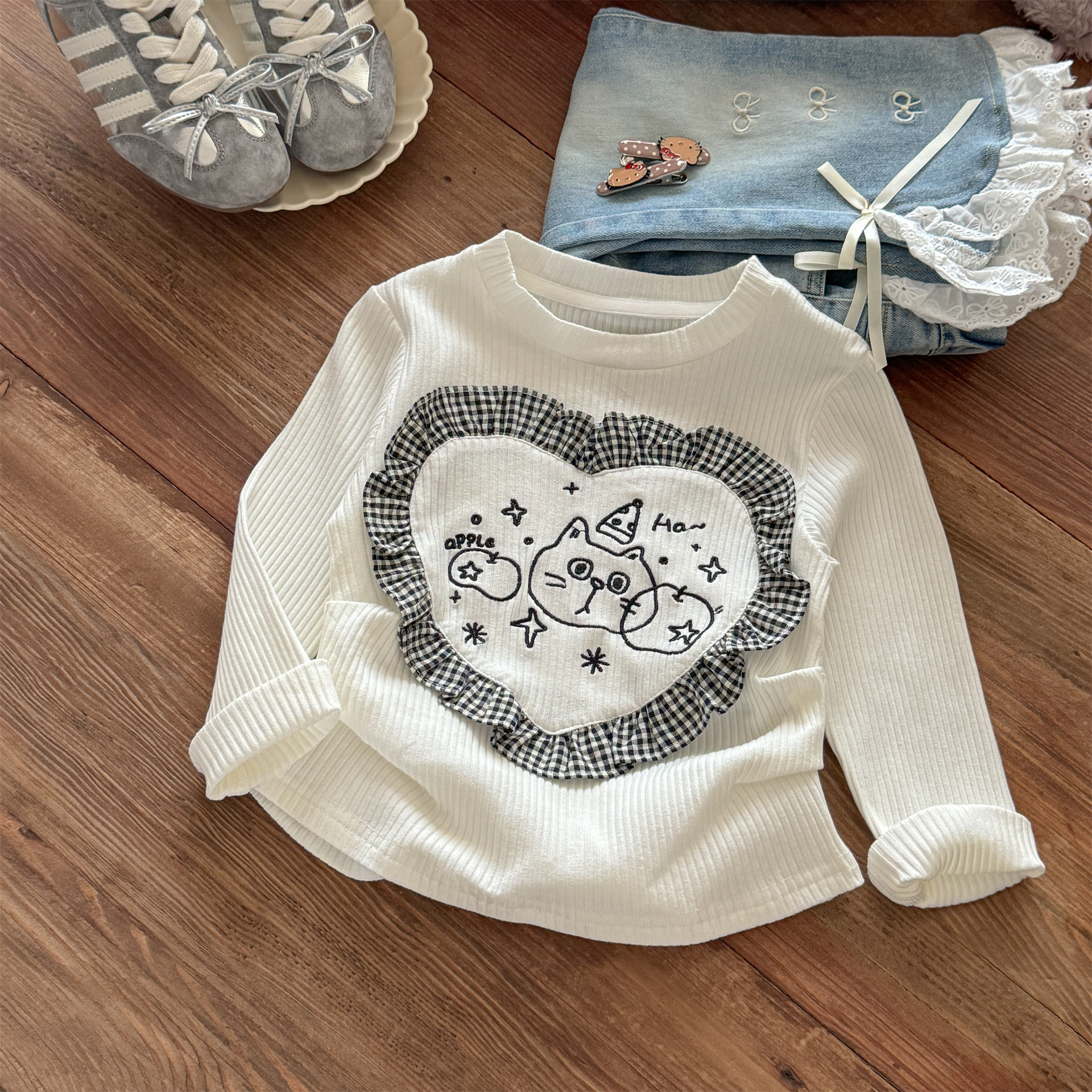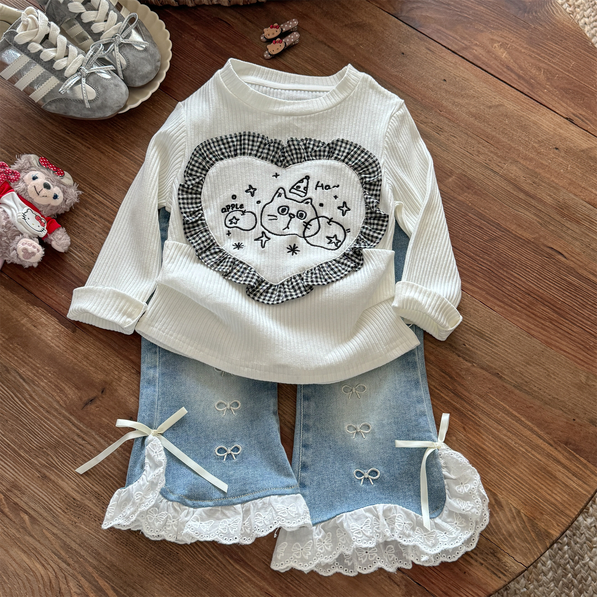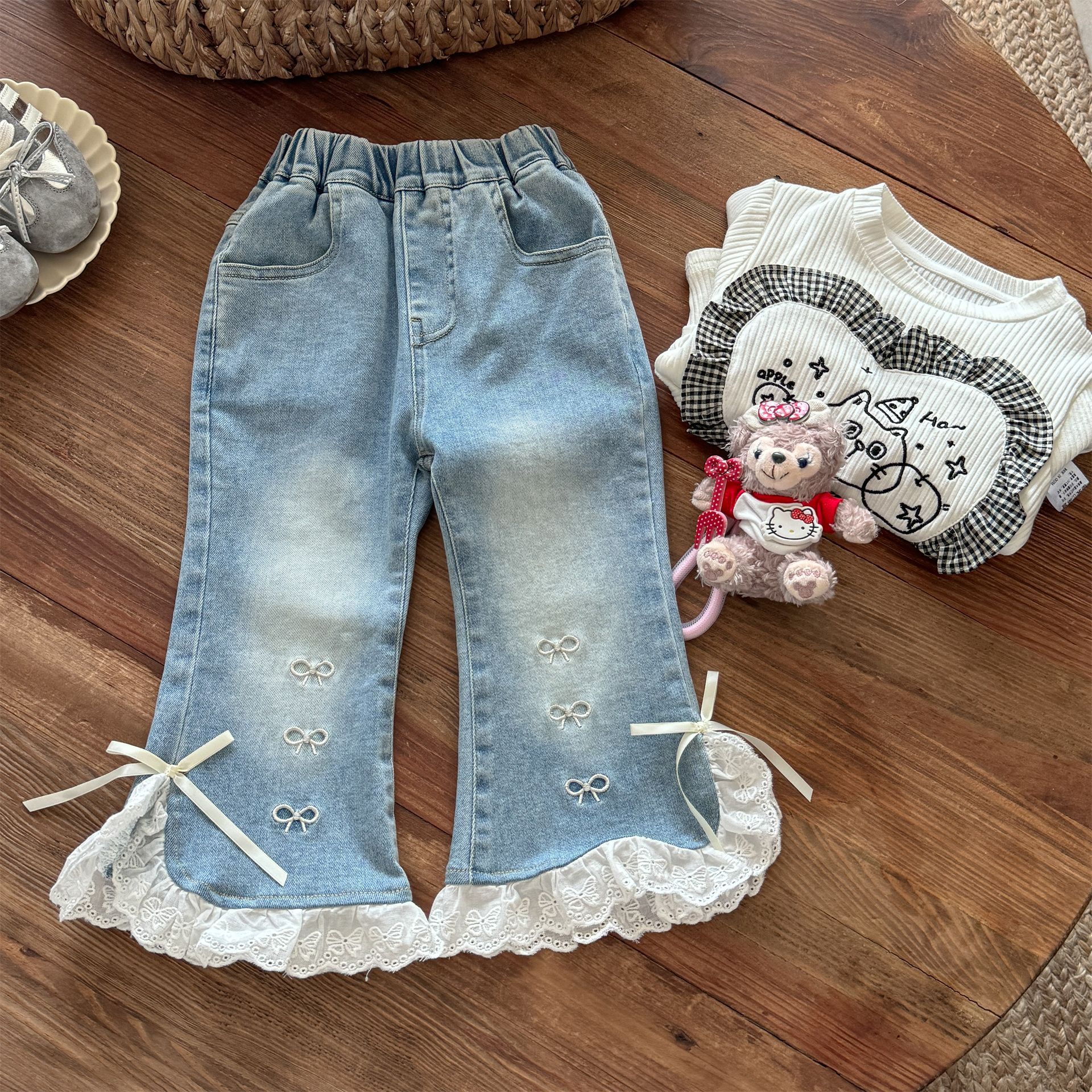 Little Salted Lemon 아기 소녀 레이스 슬릿 청바지 봄과 가을 새로운 스타일 어린 소녀 달콤하고 세련된 벨 바닥 바지스토어 가기