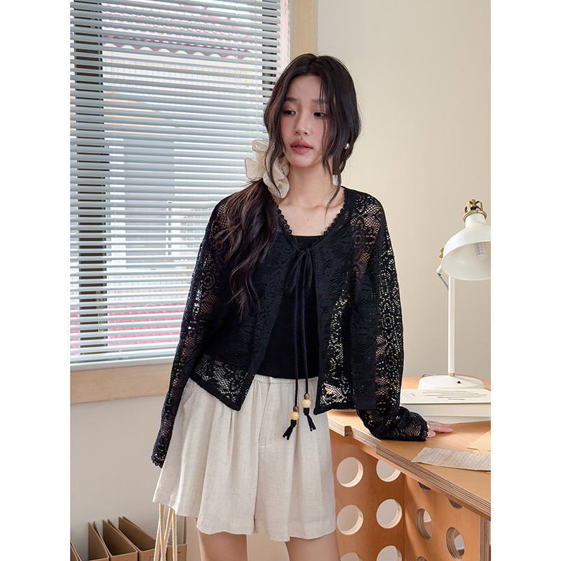 [레이스 자외선 차단제] Geming 프렌치 레트로 할로우 니트 가디건 여성 2024 여름 신상 탑 Y1399F스토어 가기
