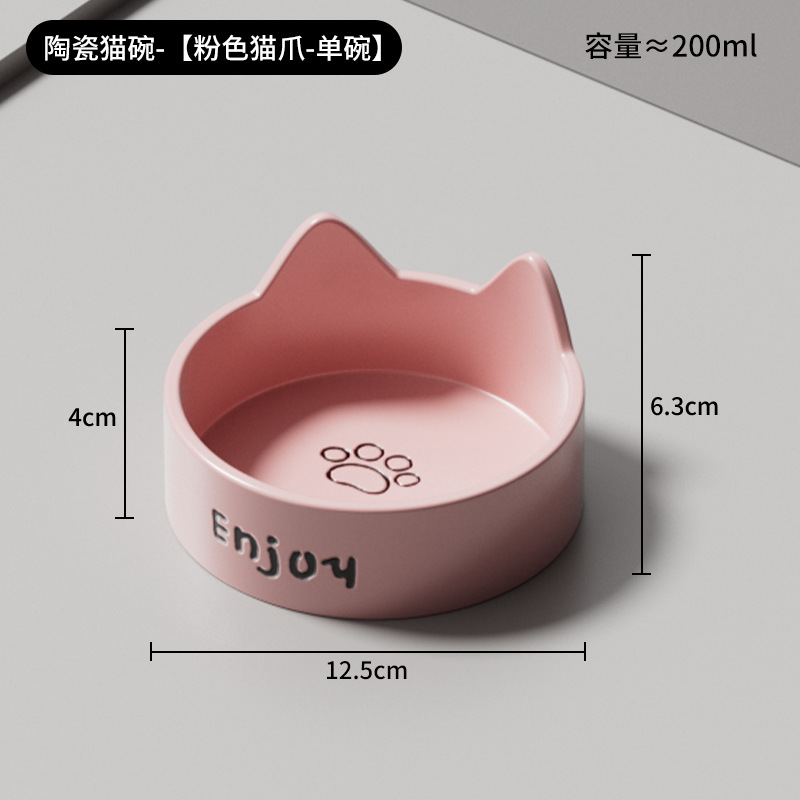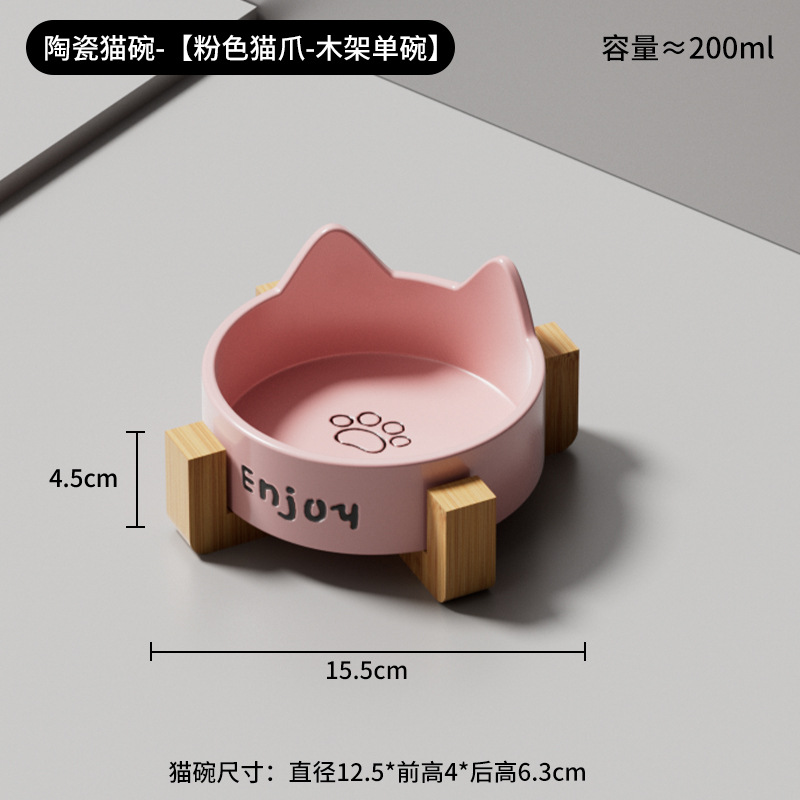 • 세라믹 고양이 그릇-[사쿠라 핑크 고양이 발톱 싱글 그릇 + 나무 스탠드]