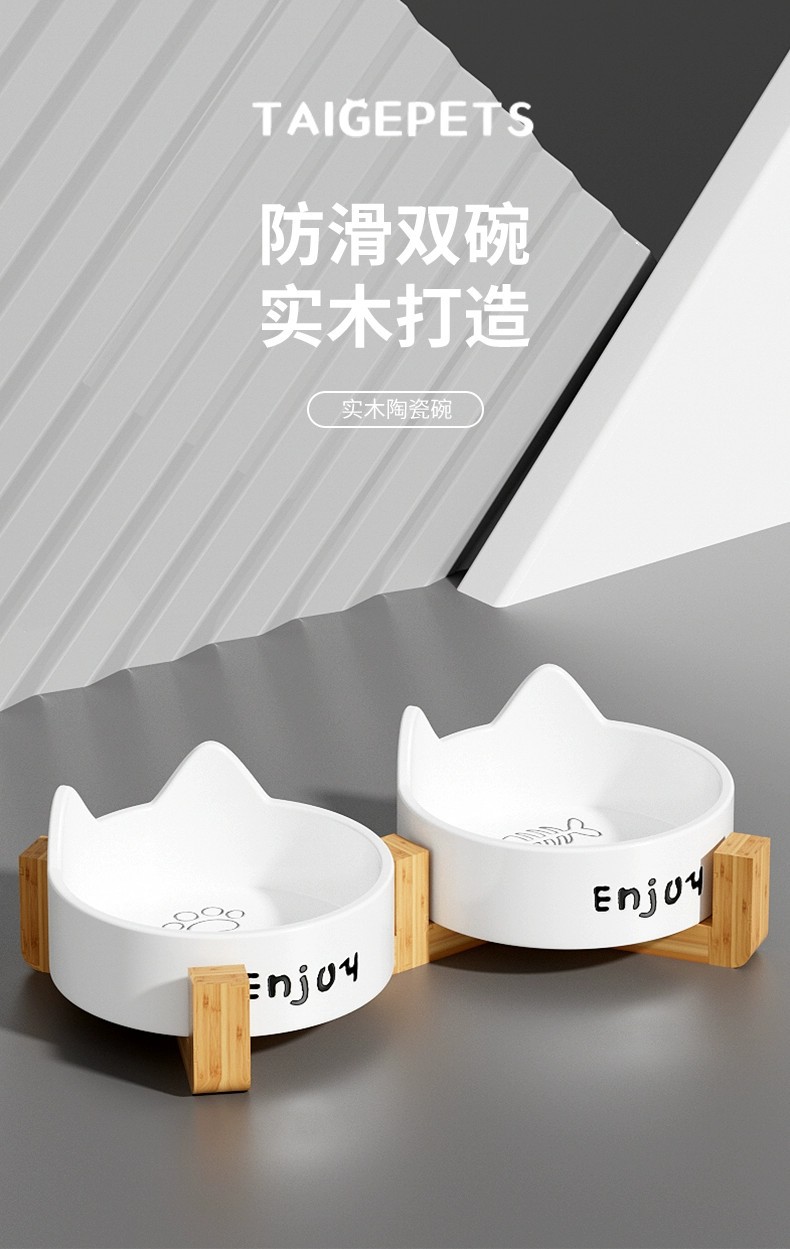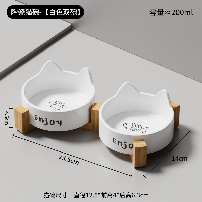 • 세라믹 고양이 그릇-[미야 화이트 더블 그릇 + 나무 스탠드]