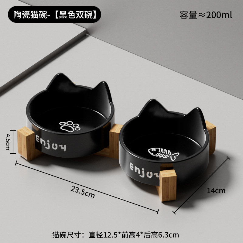 • 세라믹 고양이 그릇-[모야 블랙 더블 그릇 + 나무 스탠드]