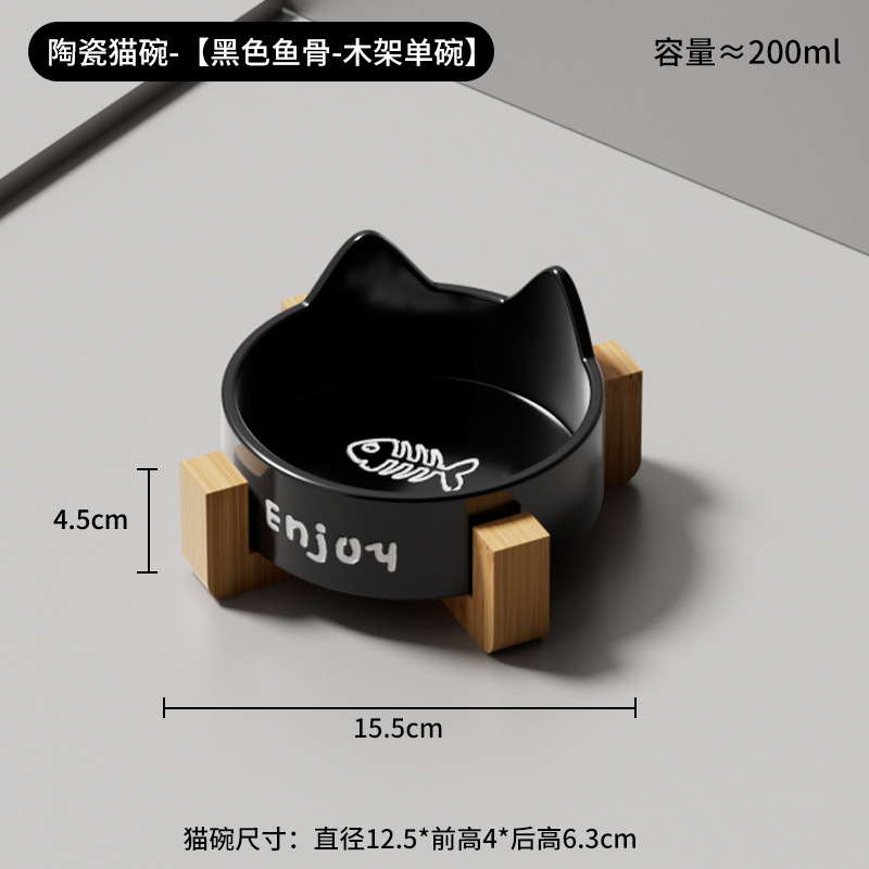 • 세라믹 고양이 그릇-[모야 검은 물고기 뼈 단일 그릇 + 나무 스탠드]