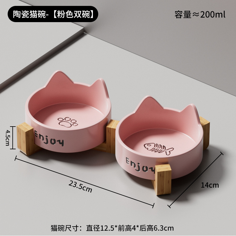 • 세라믹 고양이 그릇-[사쿠라 핑크 더블 그릇 + 나무 스탠드]