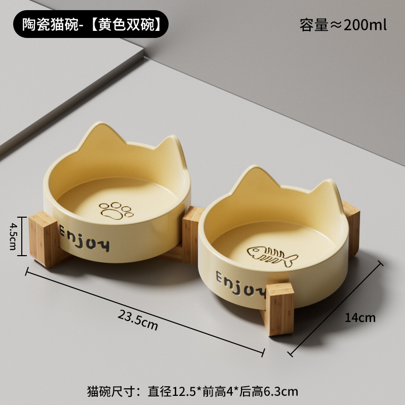 • 세라믹 고양이그릇-[크림옐로우 더블그릇+나무스탠드]