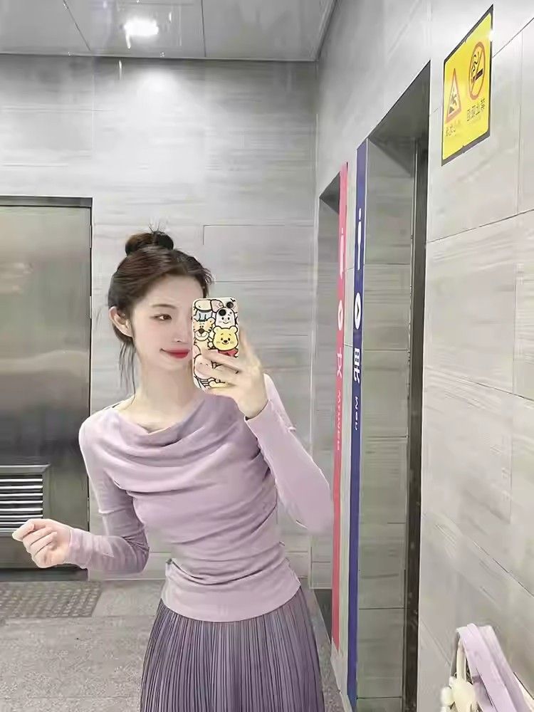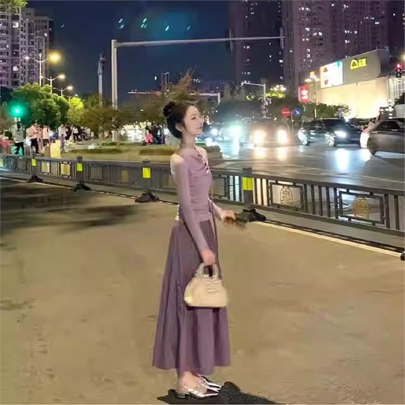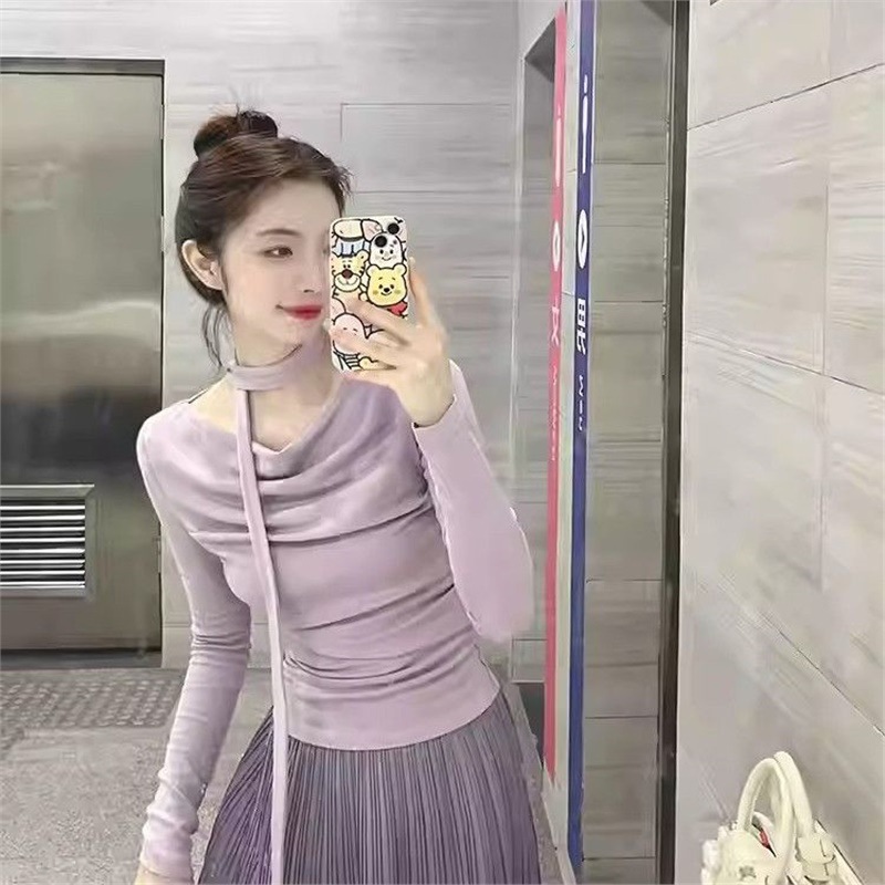 봄과 가을 새로운 스타일의 고급 프렌치 스타일 보라색 스커트 리본 스윙 칼라 바닥 탑 긴팔 티셔츠 여성용스토어 가기