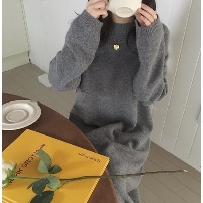 여성을 위한 새로운 가을 겨울 라운드 넥 스웨터, 루즈하고 나른한 무릎 길이 니트 드레스, 한국식 바닥 셔츠, 엑스트라 롱 스웨터스토어 가기
