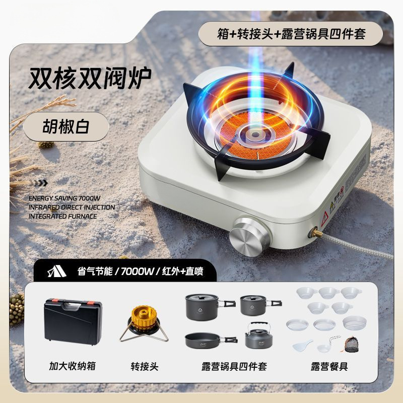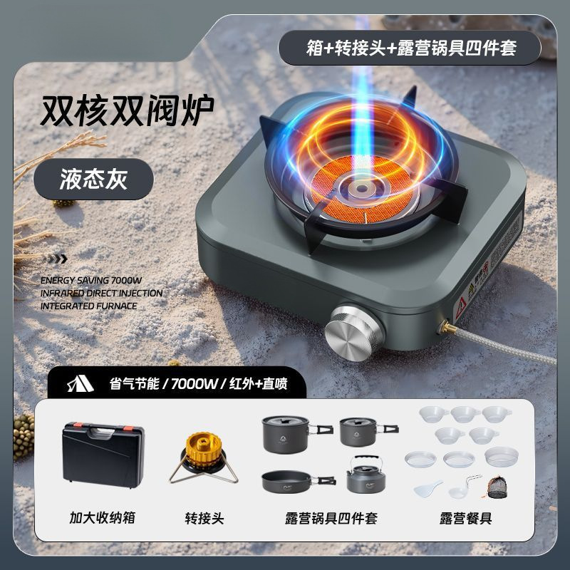 • [액상 티타늄 그레이 스플릿 스토브] + 무료 업그레이드 보관함 + 어댑터 - [듀얼 코어 스토브/전압 안정기] + 무료 식기 포함 캠핑 냄비 4종 세트