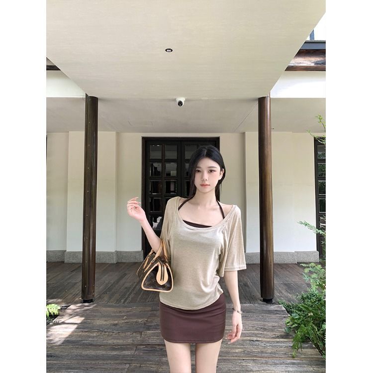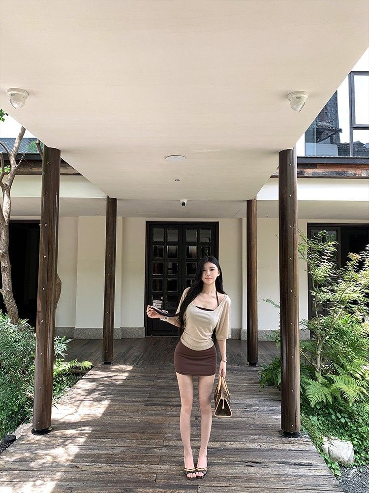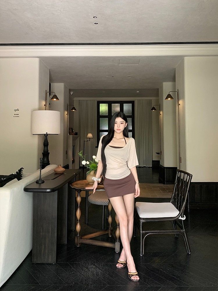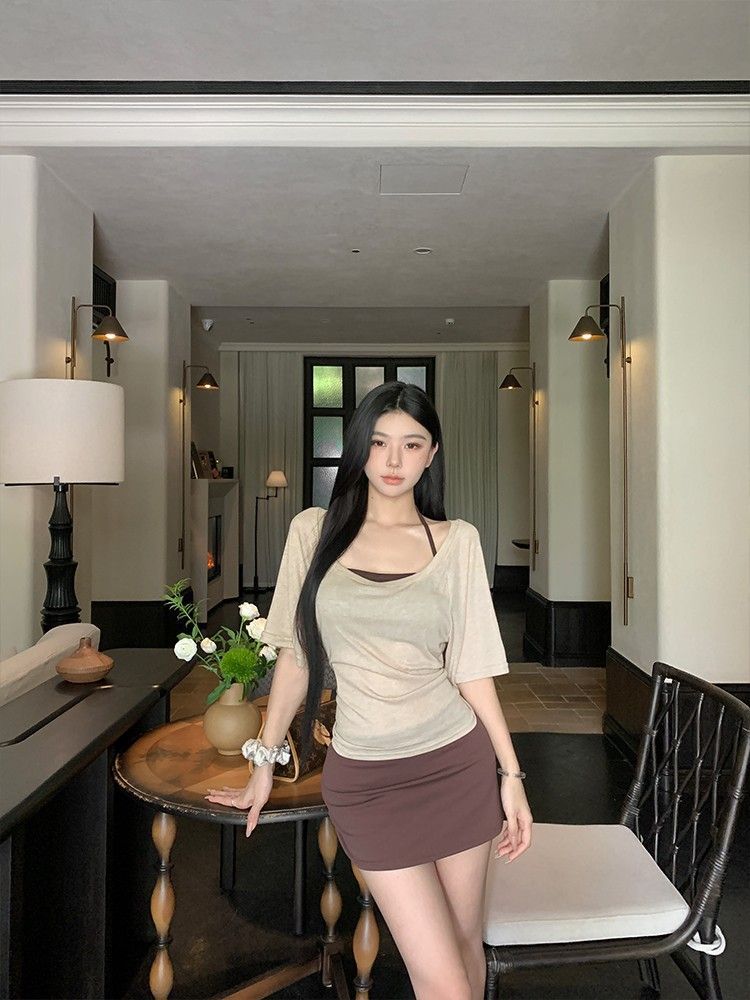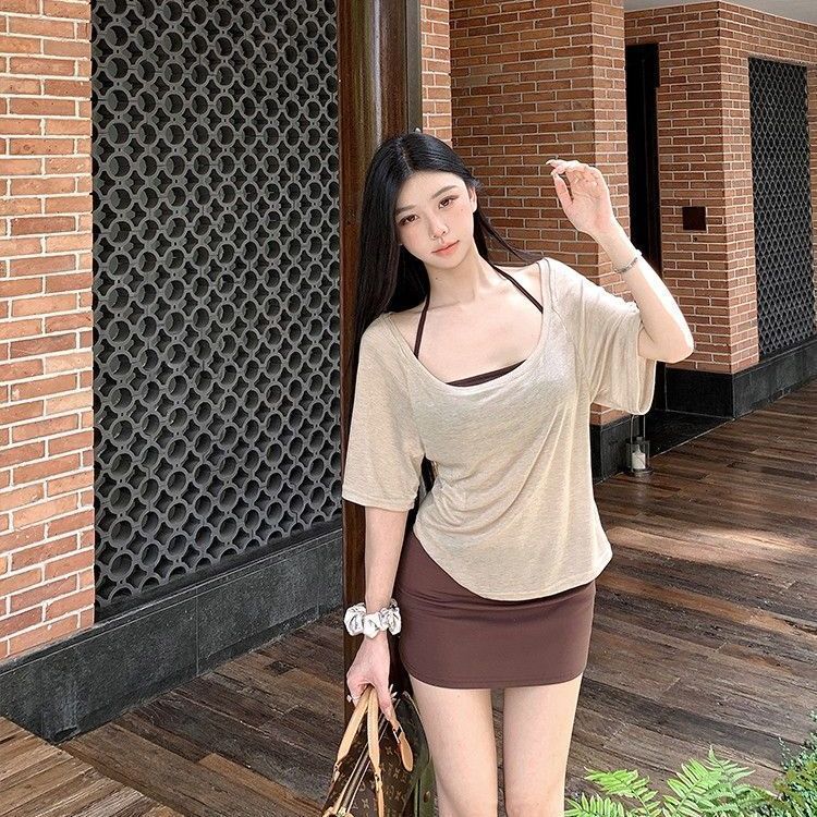 아메리칸 핫걸 스타일 얇은 라지 칼라 미드슬리브 블라우스 여성용 솔리드 컬러 홀터넥 조끼 스커트 3피스 세트스토어 가기